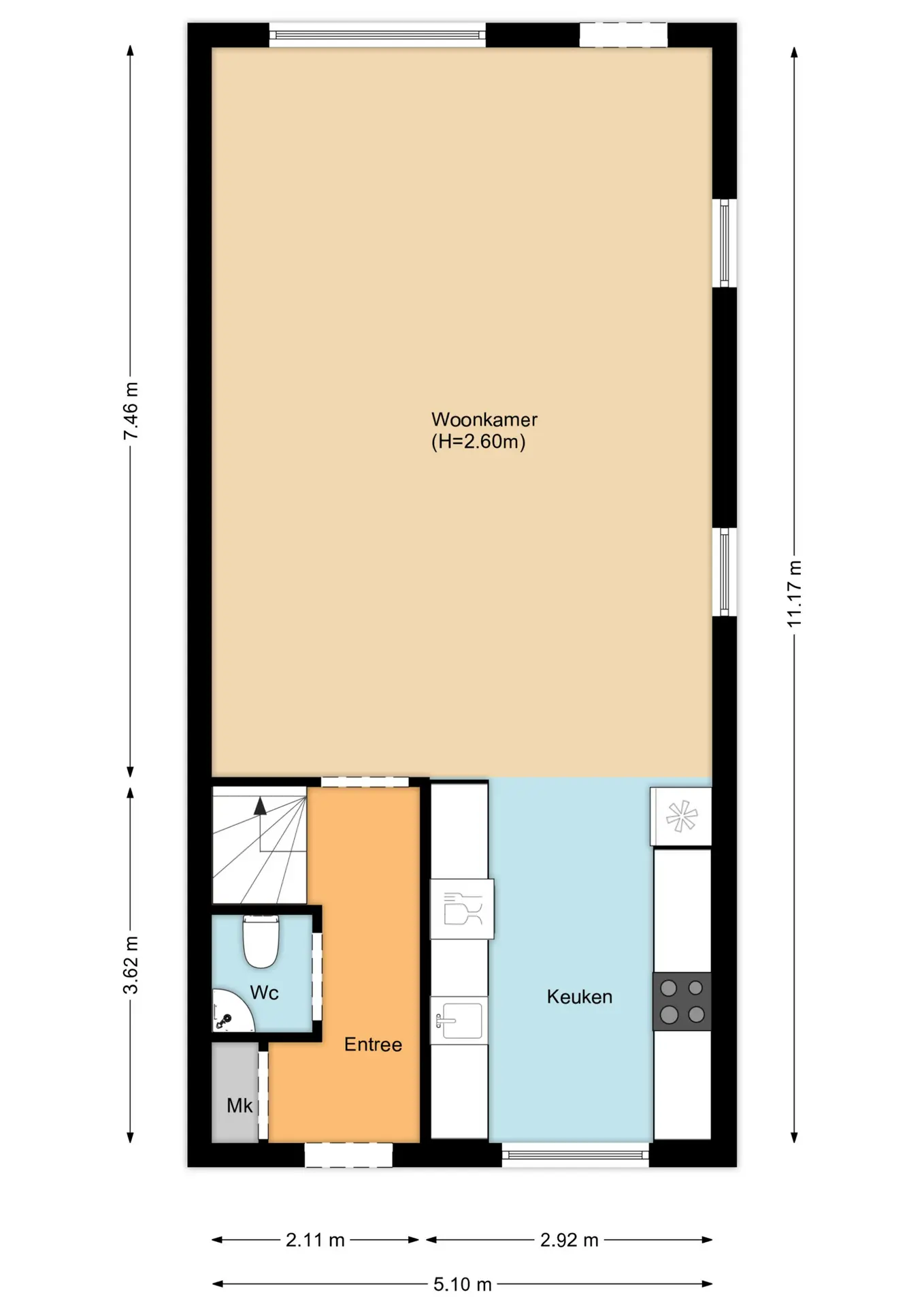 Entree, hal met meterkast, toilet, trapopgang naar de eerste verdieping en toegang tot de woonkamer. De ruime en uitgebouwde woonkamer beschikt over een sfeervolle houten vloer, een palletkachel en een deur naar de achtertuin. De nette keuken bevindt zich aan de voorzijde en is voorzien van een koel-/vriescombinatie, combi oven/magnetron, vaatwasser, inductiekookplaat en een afzuigkap. De netjes aangelegde achtertuin is achterom bereikbaar en daar treft u de sfeervolle veranda en de berging aan. Zowel aan de voor- als aan de achterzijde is voldoende openbare parkeerruimte.