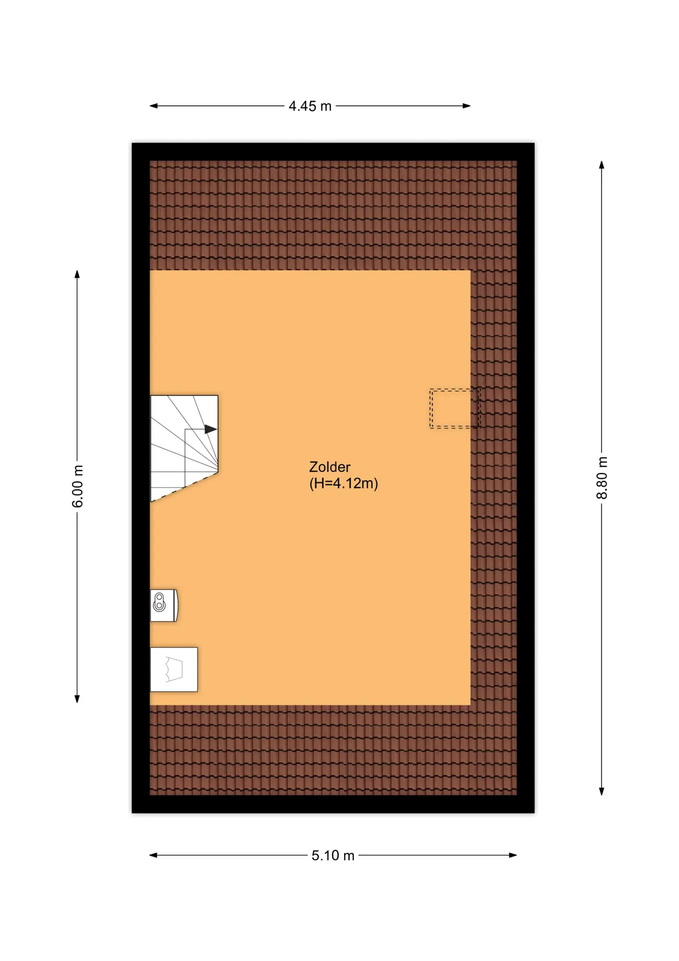 Ruime bergzolder met een dakraam, opstelling van de C.V. ketel en de aansluitingen van de wasmachine en de droger. Deze ruime verdieping is eenvoudig in te delen met nog eens één of twee slaapkamers.