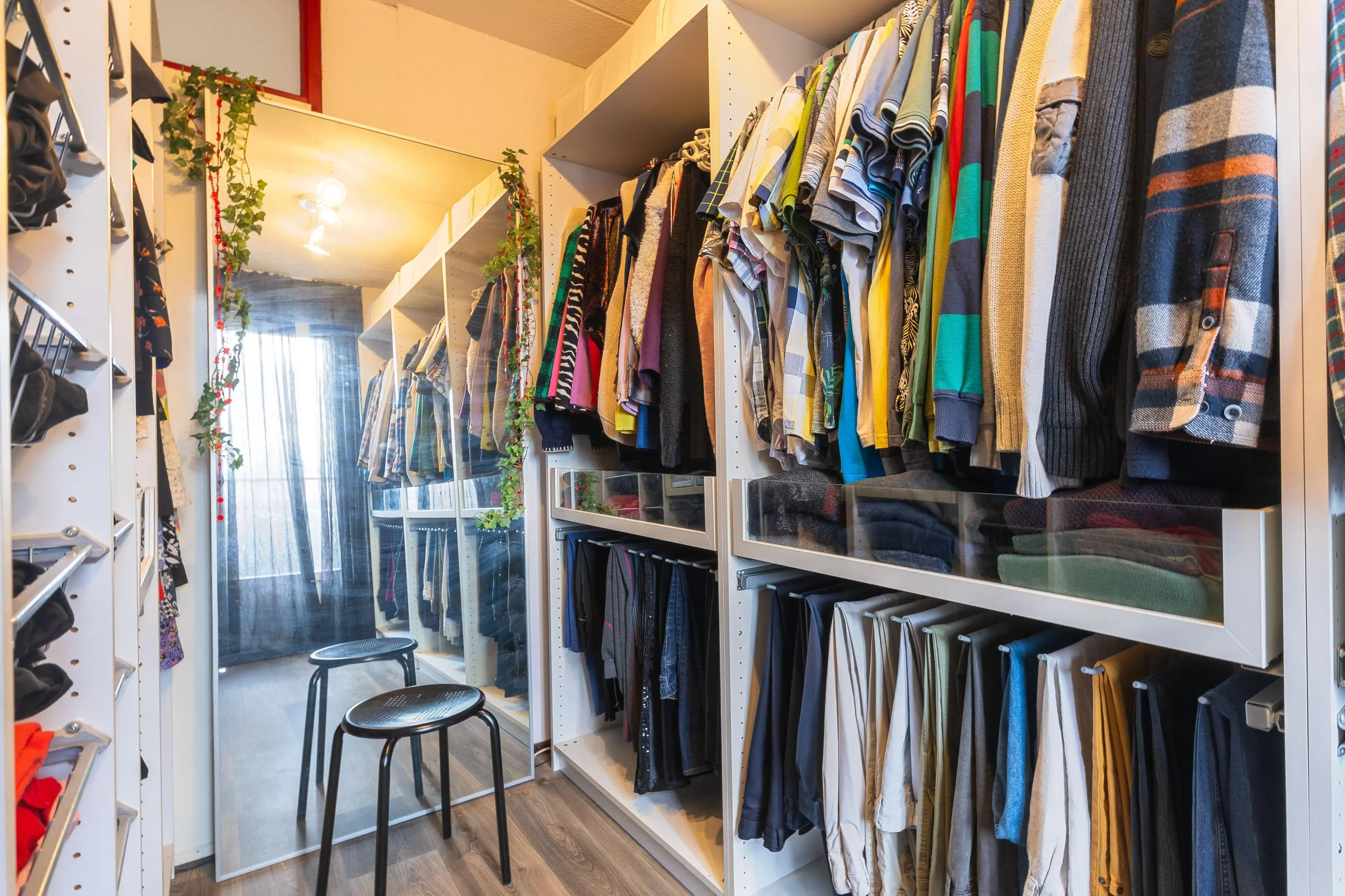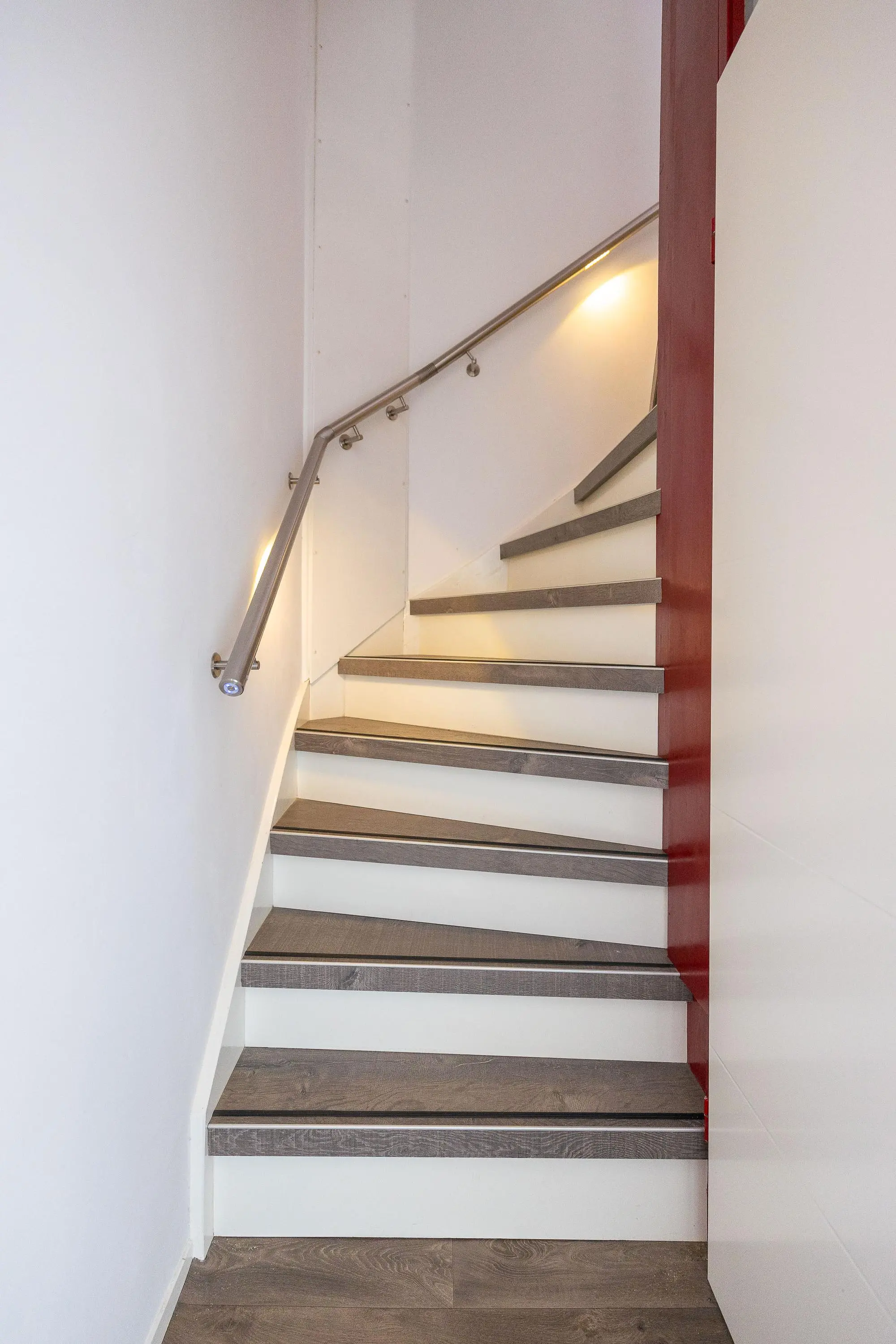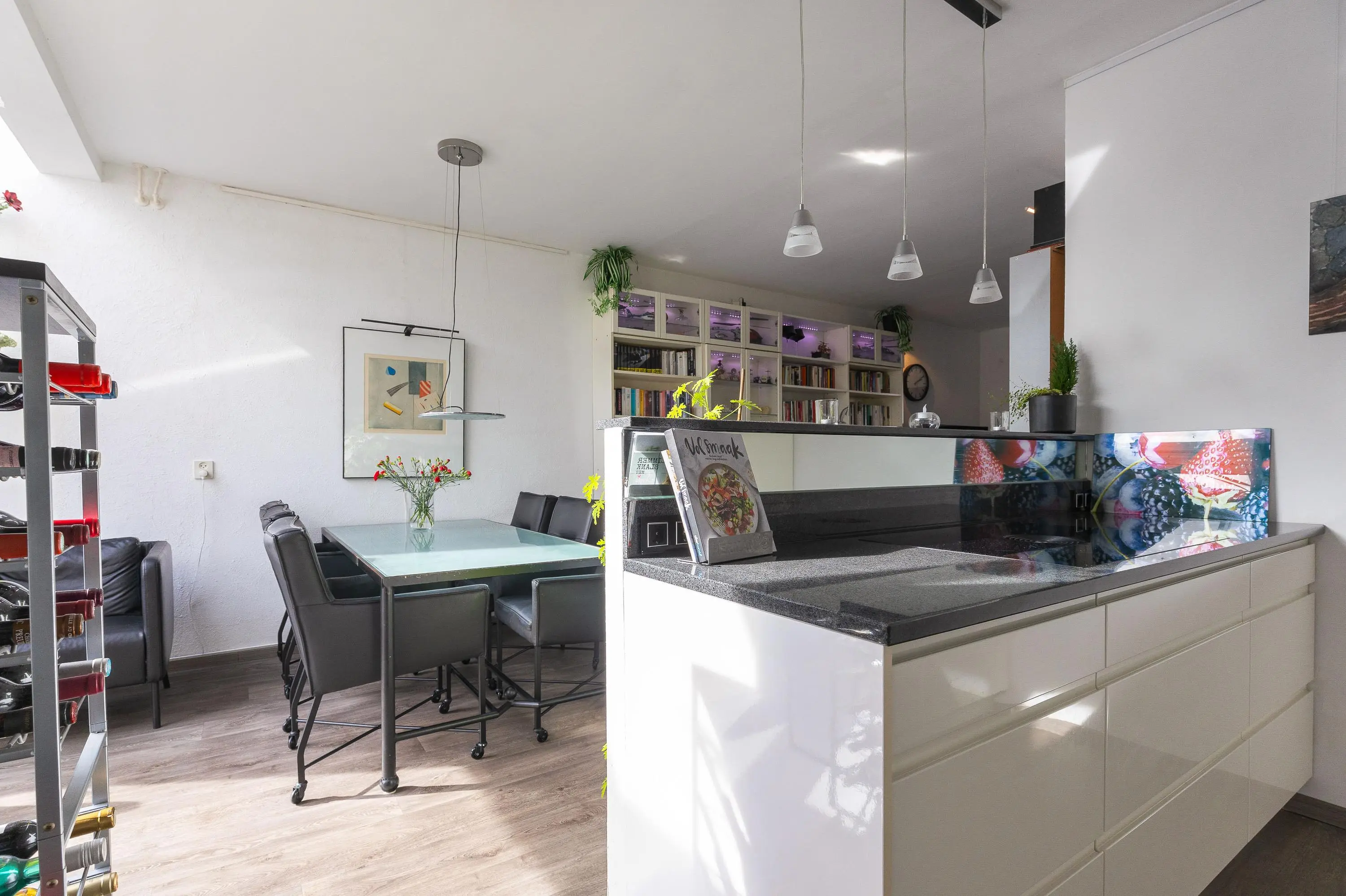 De moderne open keuken is voorzien van diverse inbouwapparatuur en sluit naadloos aan op de leefruimte. Aansluitend vind je een zeer verzorgde berging, die fungeert als verlengstuk van de keuken – ideaal voor extra opslag en gebruiksgemak.