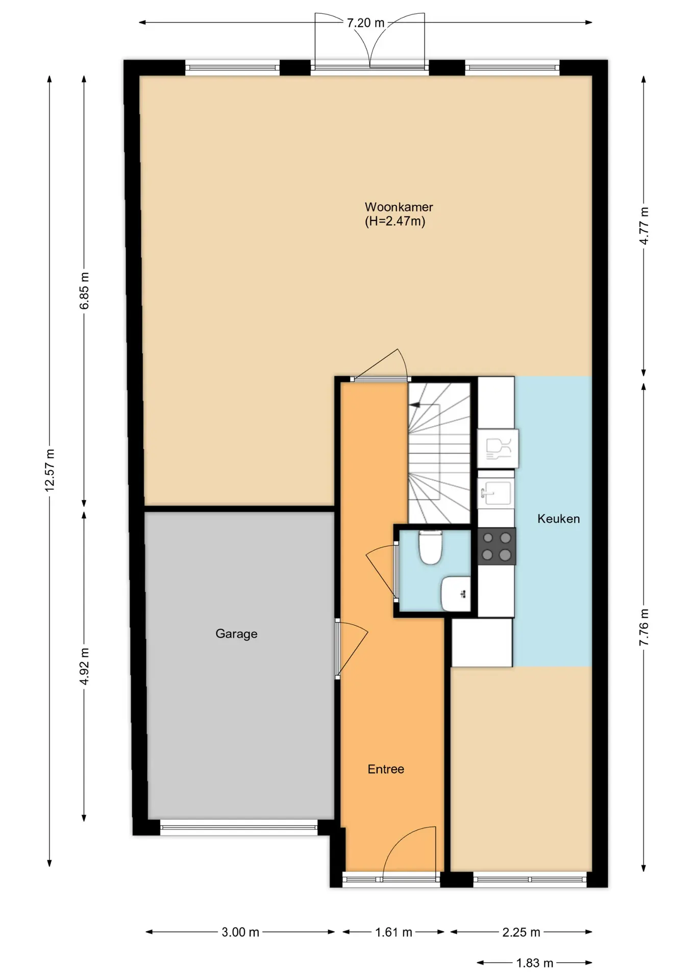 Via de ruime oprit bereik je de entree van de woning. In de hal bevinden zich de meterkast, het toilet en de trapopgang. Vanuit hier heb je toegang tot de inpandige garage en het woongedeelte. De woonkamer is royaal en licht, met grote raampartijen die zorgen voor een prettige lichtinval en een fijne verbinding met de tuin. Dankzij de vrije ligging aan de achterzijde geniet je hier van veel privacy en een rustig uitzicht.