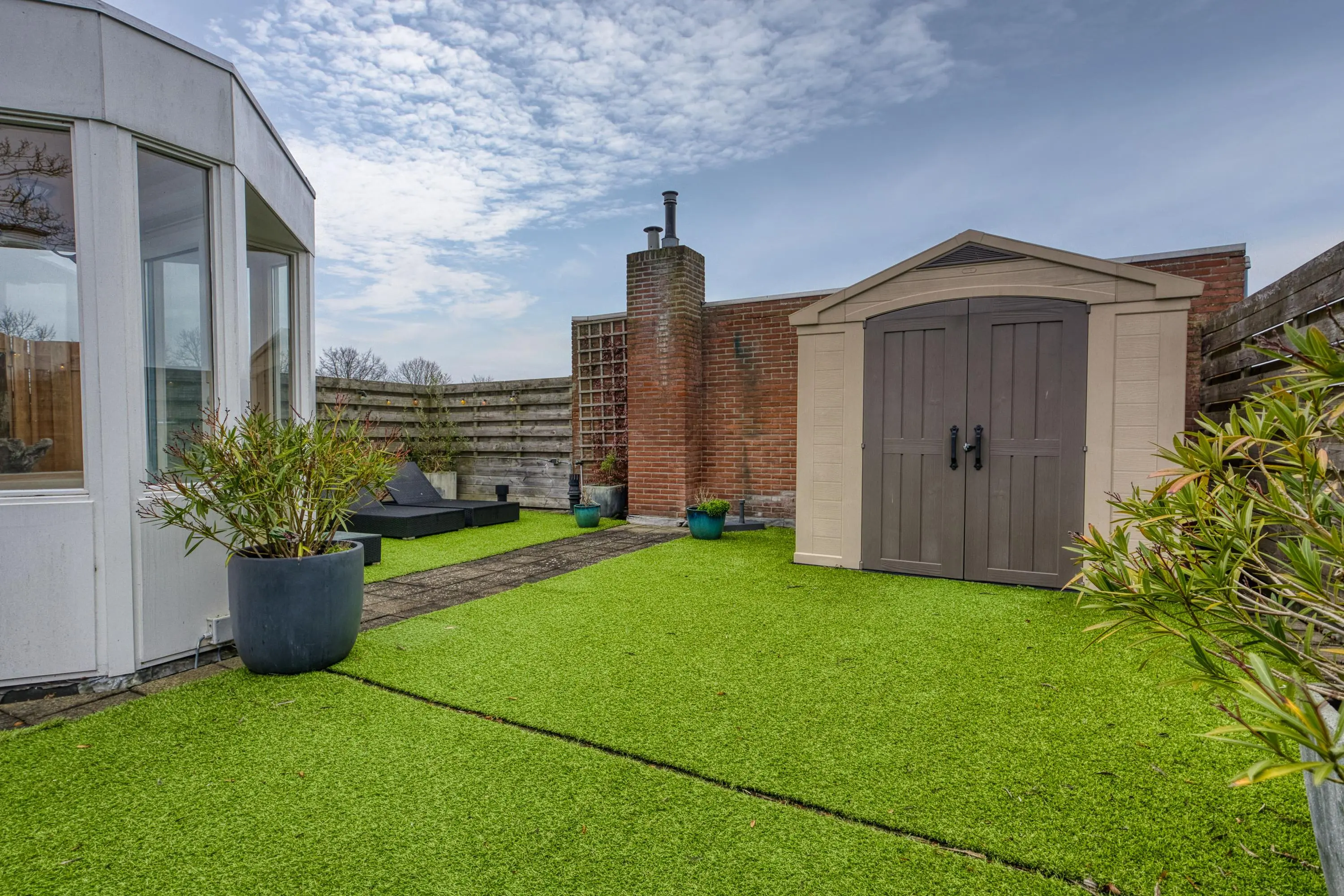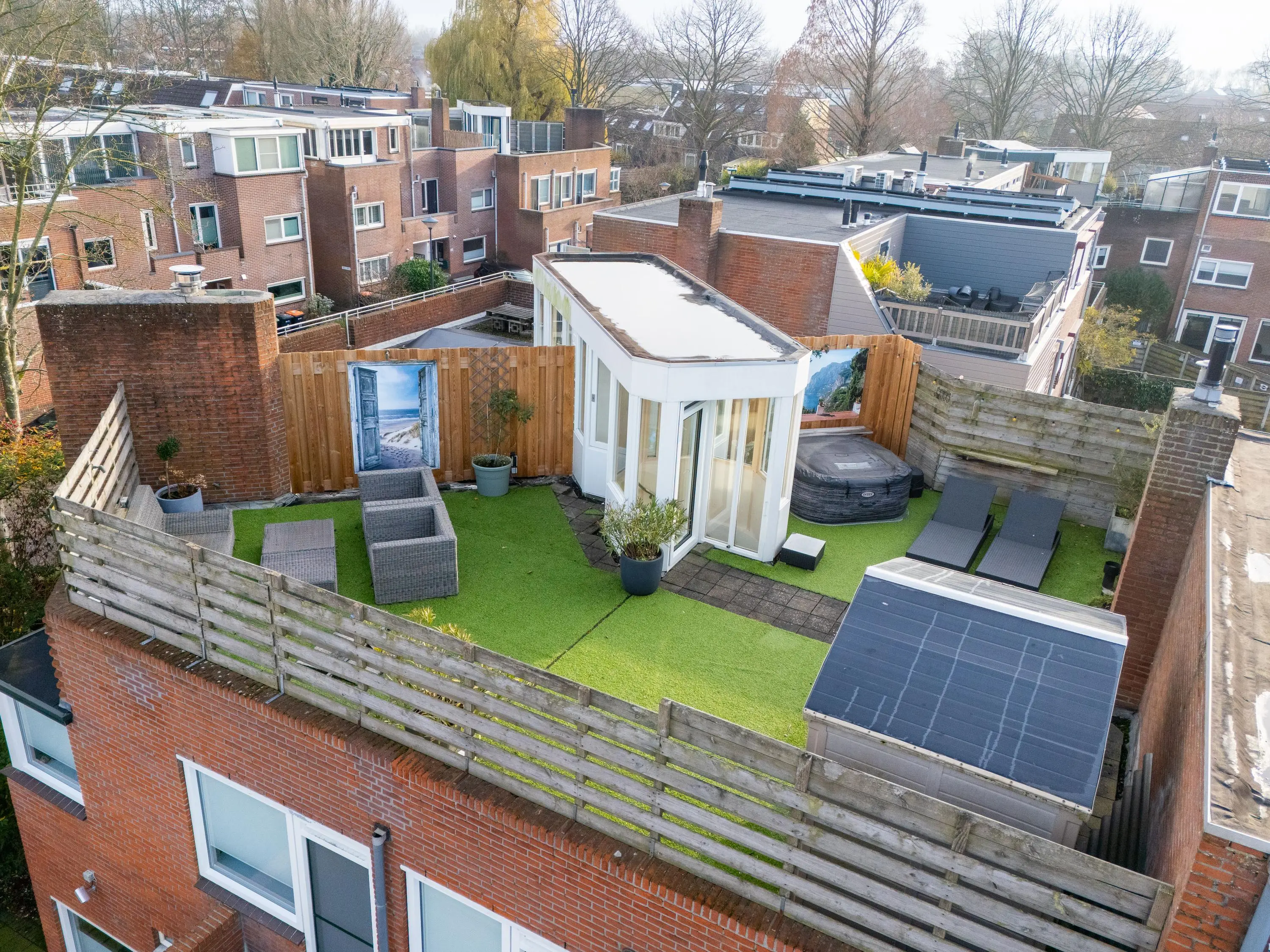 Via een vaste trap bereik je het grote dakterras – een absolute blikvanger! Dankzij de vrije ligging is hier altijd wel een plekje in de zon te vinden: ideaal voor loungen, barbecueën of het creëren van een groene stadsoase.