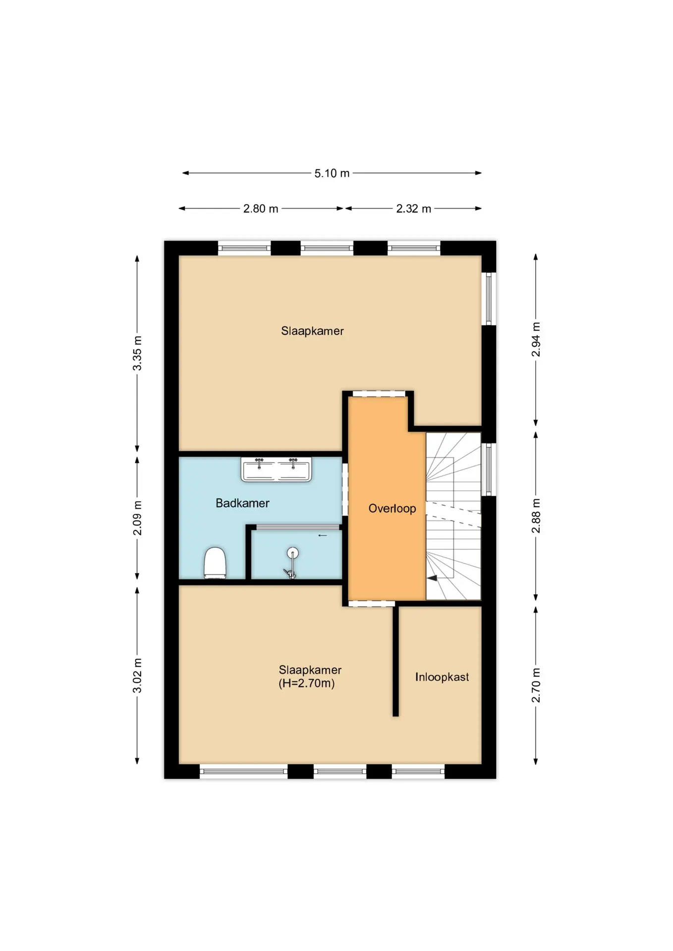 Hier bevinden zich twee ruime slaapkamers, waarvan de grootste is voorzien van een royale walk-in closet en airconditioning. De luxe badkamer is hoogwaardig afgewerkt en beschikt over een dubbele wastafel, toilet en een ruime inloopdouche. Indien gewenst kunnen op deze verdieping eenvoudig weer drie slaapkamers worden gerealiseerd.