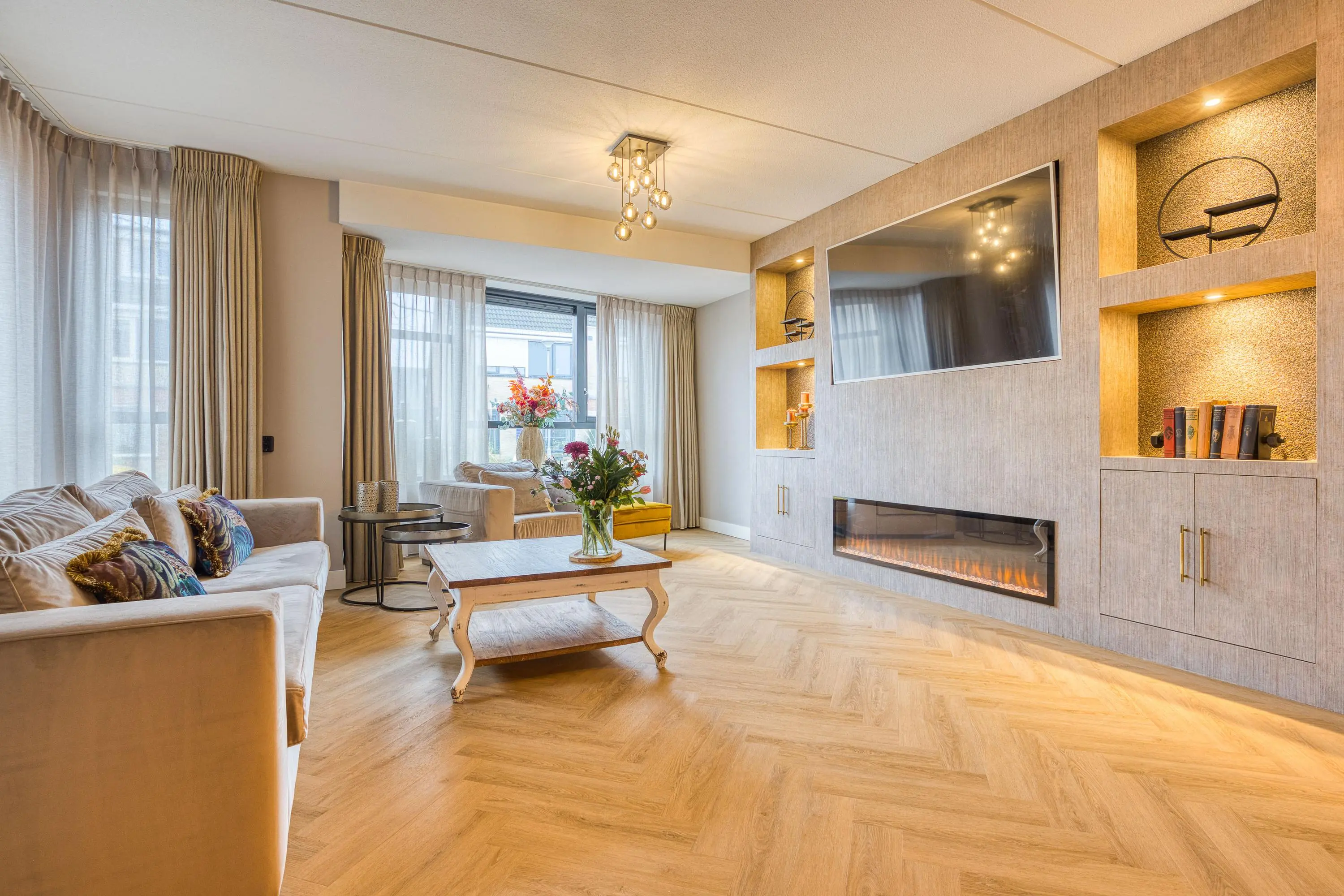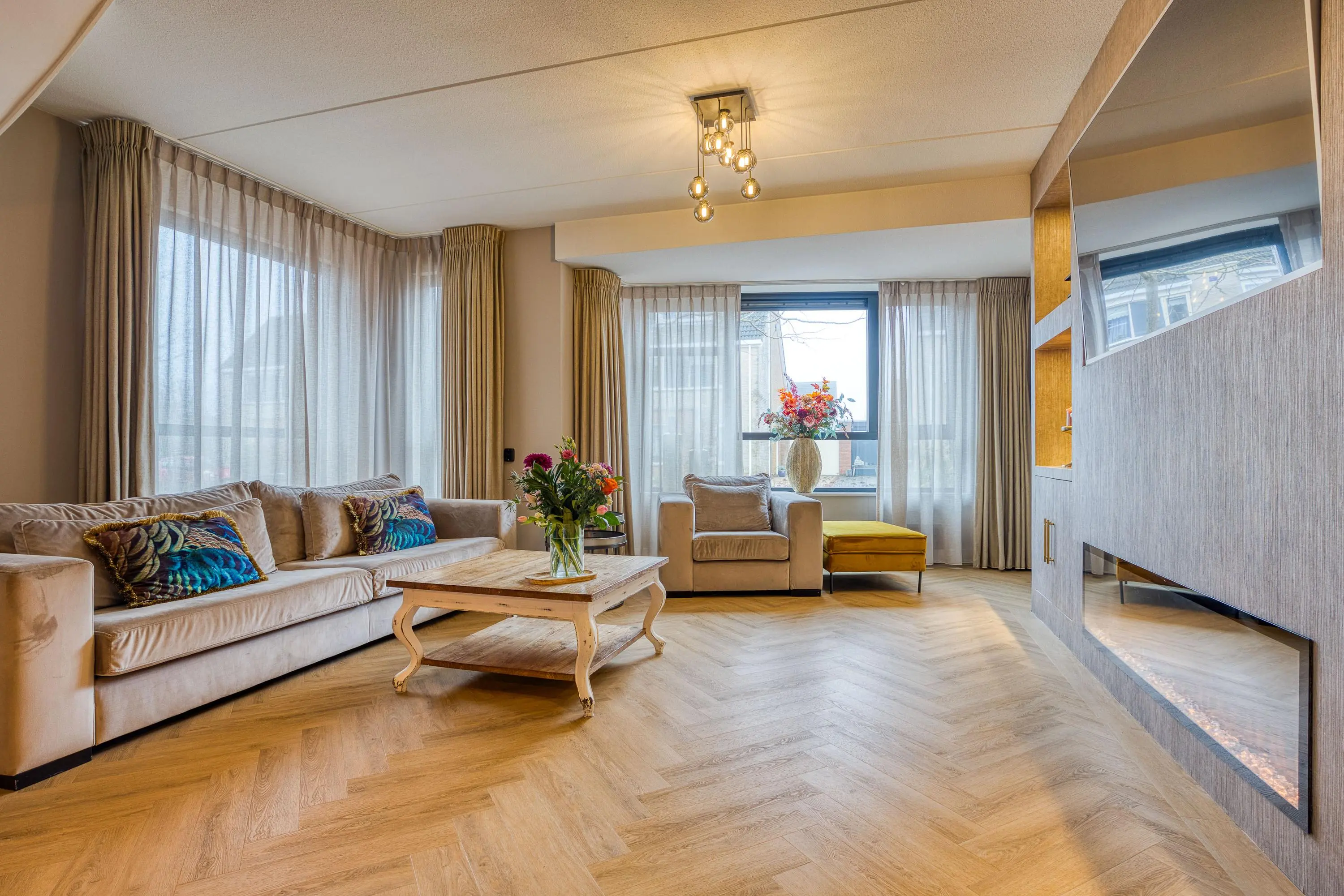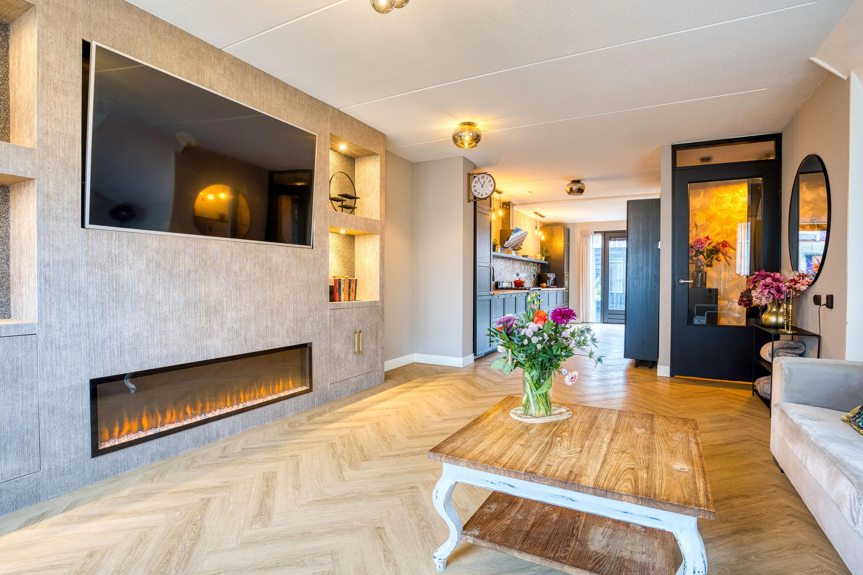 Via de entree bereikt u de royale, uitgebouwde woonkamer met fraaie erker, veel lichtinval en openslaande tuindeuren die zorgen voor een prachtige verbinding met de extra brede tuin. De nagelnieuwe visgraatvloer, de sfeervolle haard en de indrukwekkende cinema wall maken dit een heerlijke plek om te ontspannen.