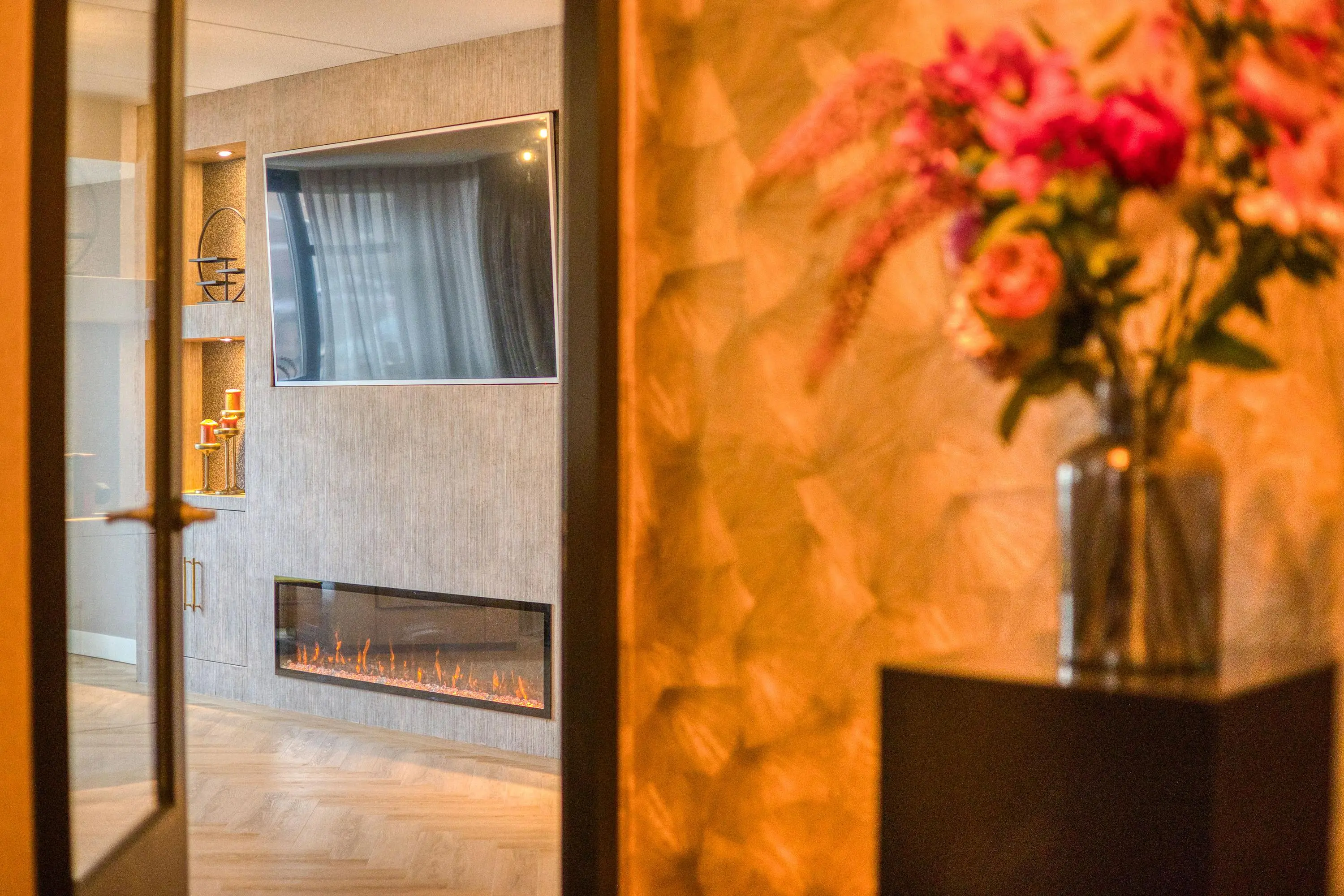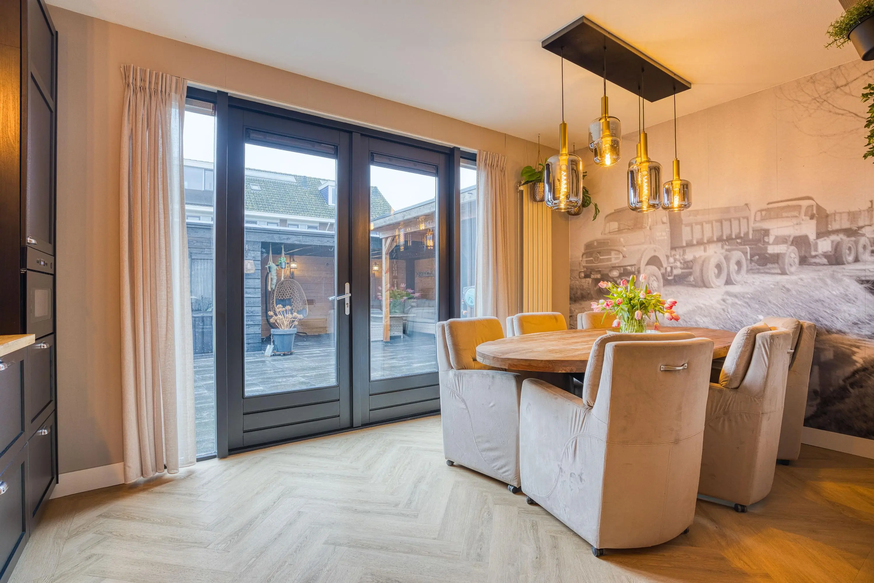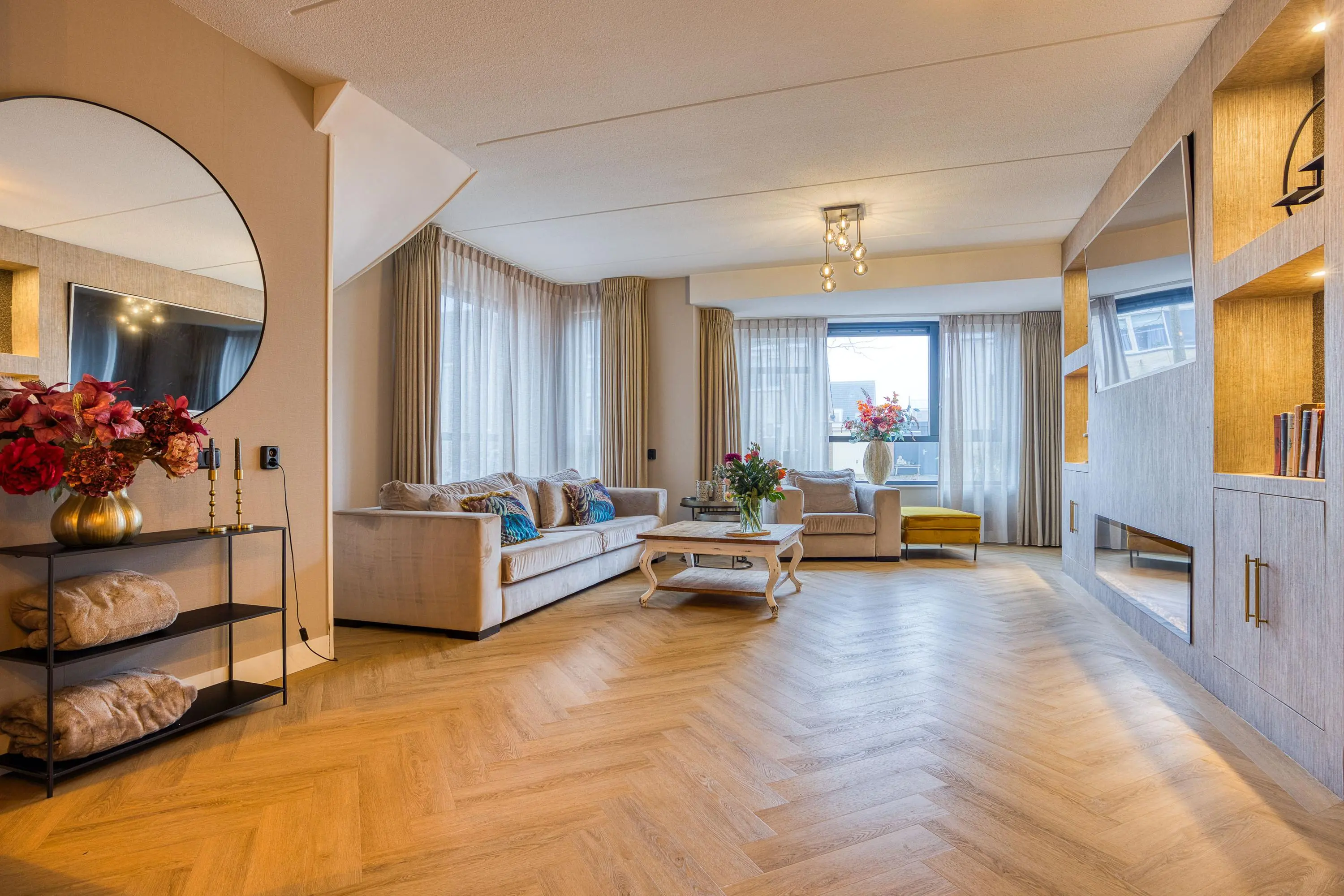 Via de entree bereikt u de royale, uitgebouwde woonkamer met fraaie erker, veel lichtinval en openslaande tuindeuren die zorgen voor een prachtige verbinding met de extra brede tuin. De nagelnieuwe visgraatvloer, de sfeervolle haard en de indrukwekkende cinema wall maken dit een heerlijke plek om te ontspannen.