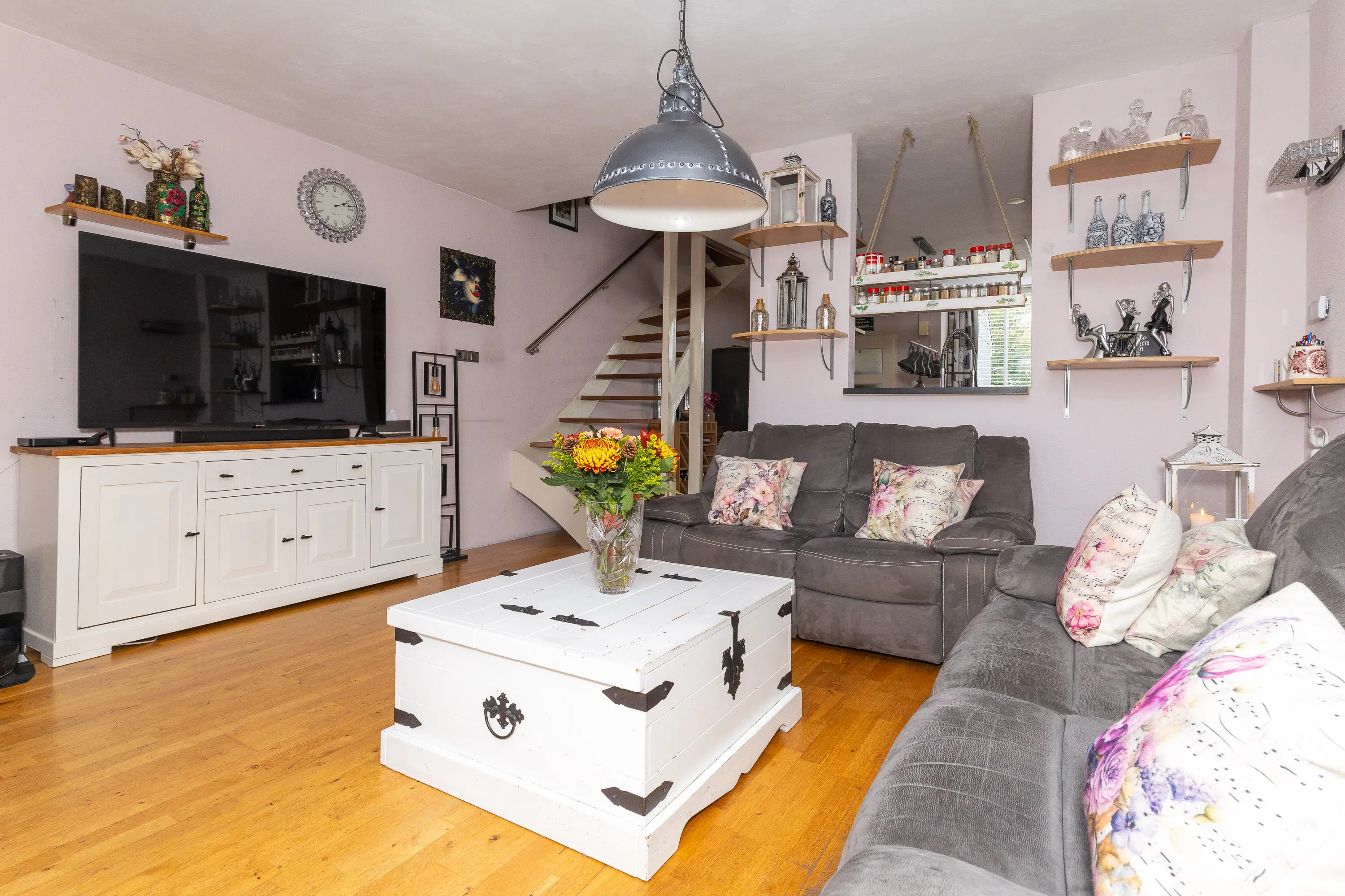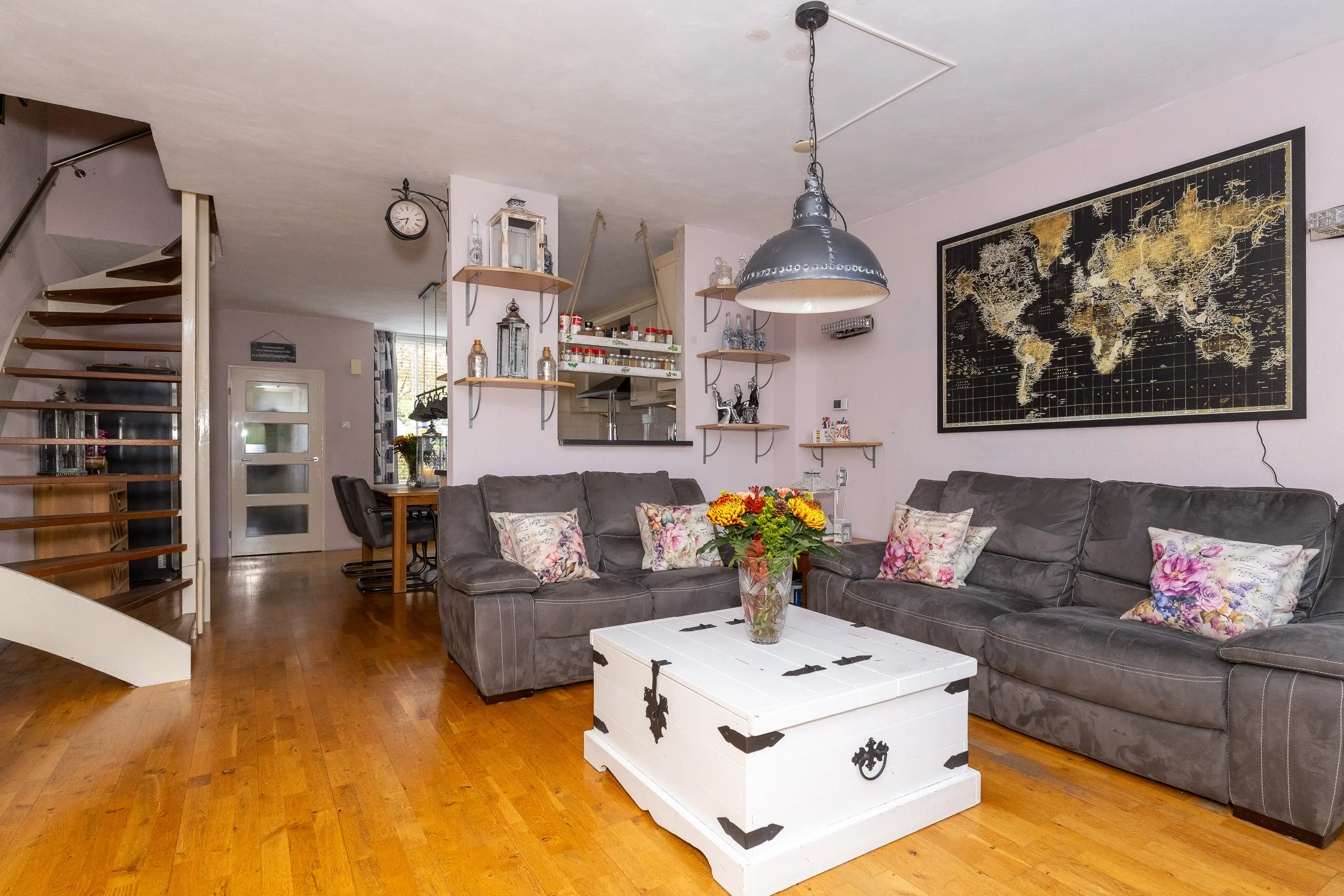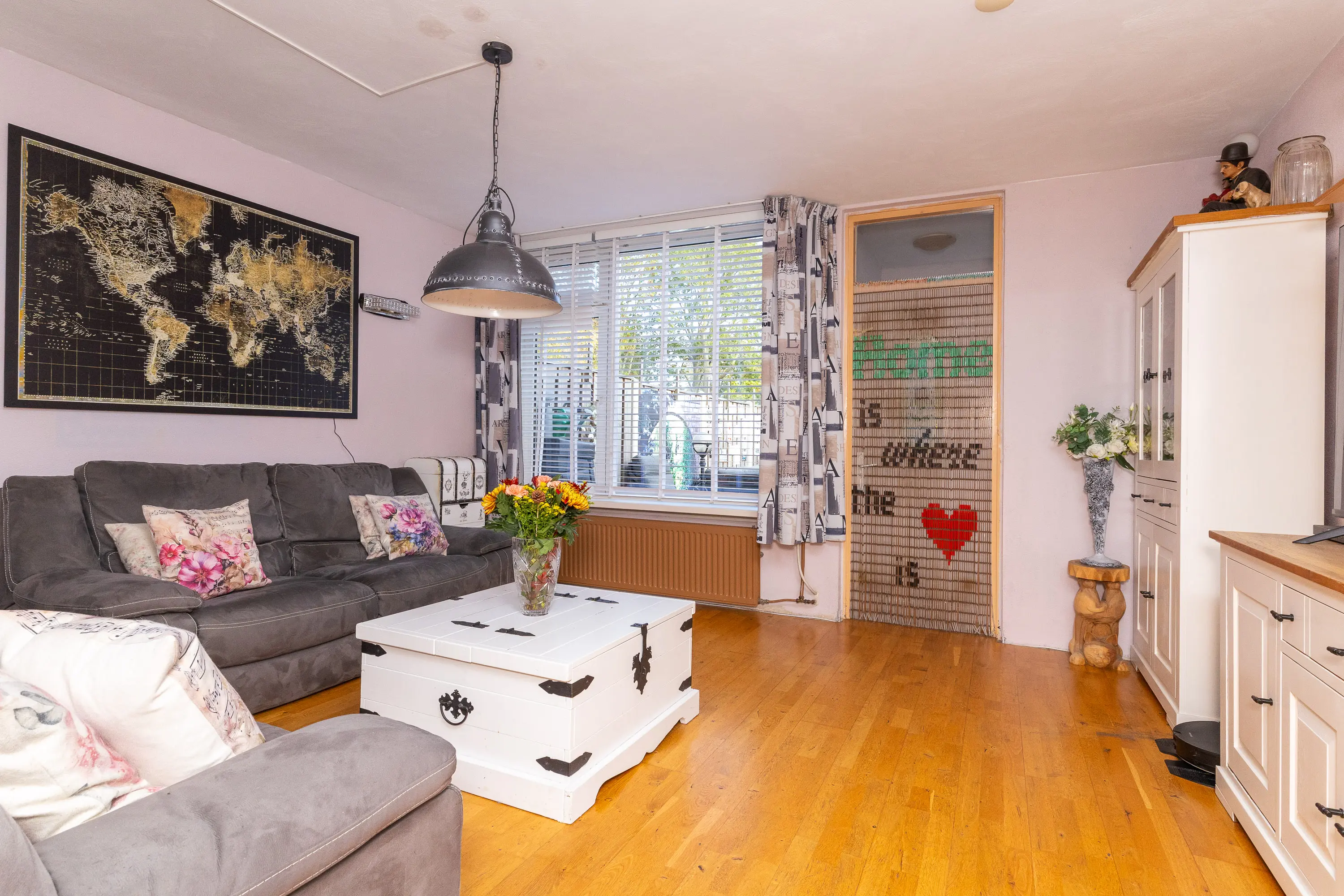 De tuingerichte woonkamer biedt veel privacy en een warme, huiselijke sfeer. De grote raampartij zorgt voor een fijne lichtinval en een mooie verbinding met de onderhoudsvriendelijke achtertuin, bereikbaar via de aangebouwde bijkeuken.