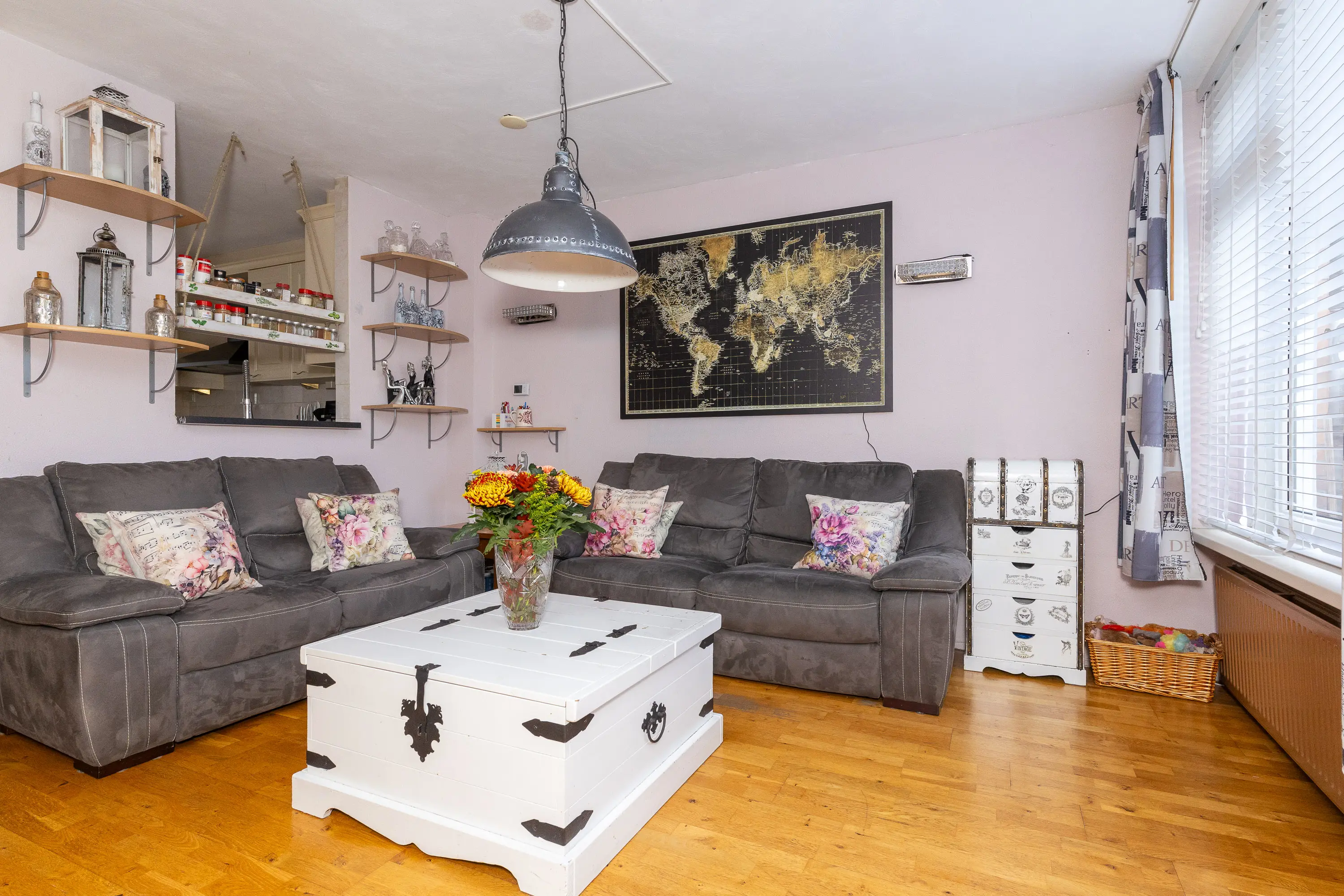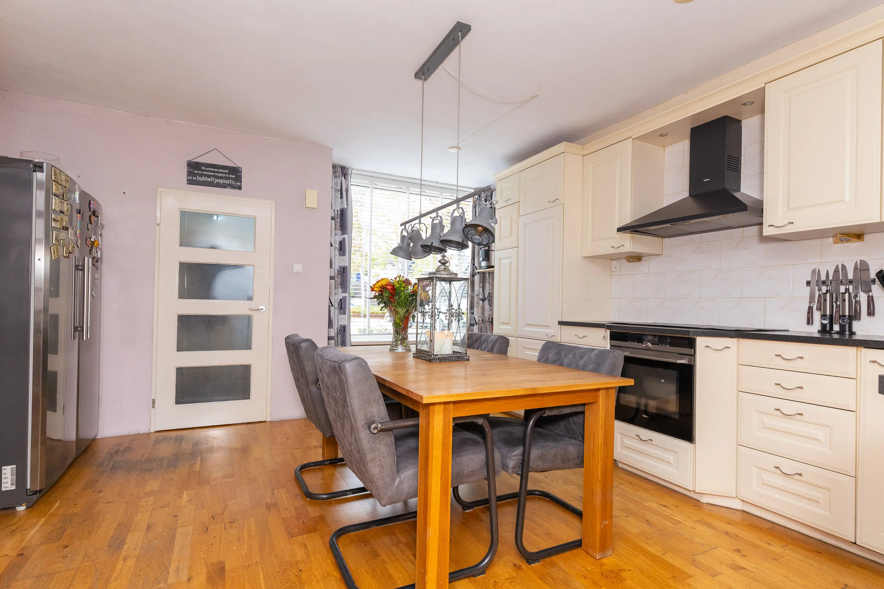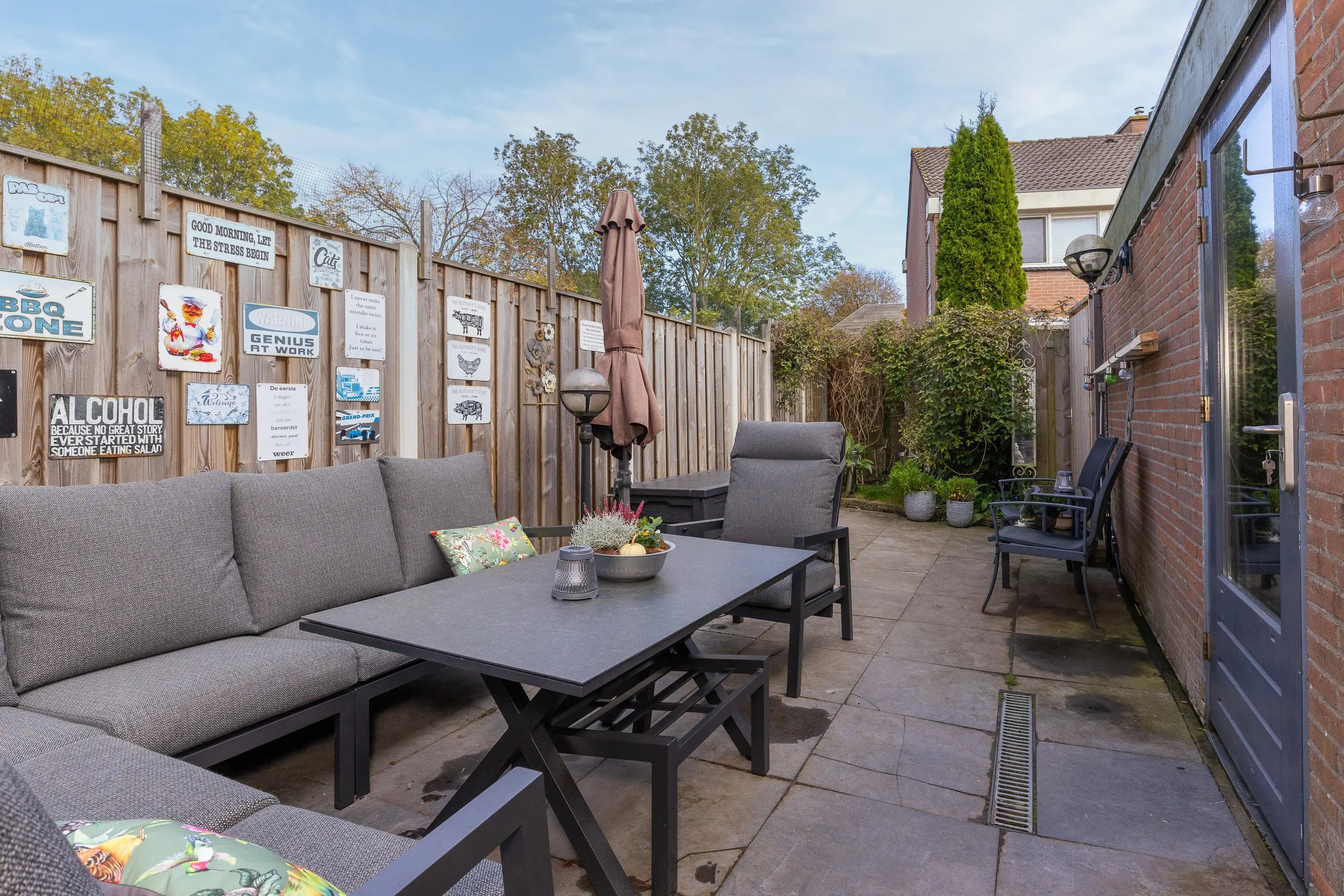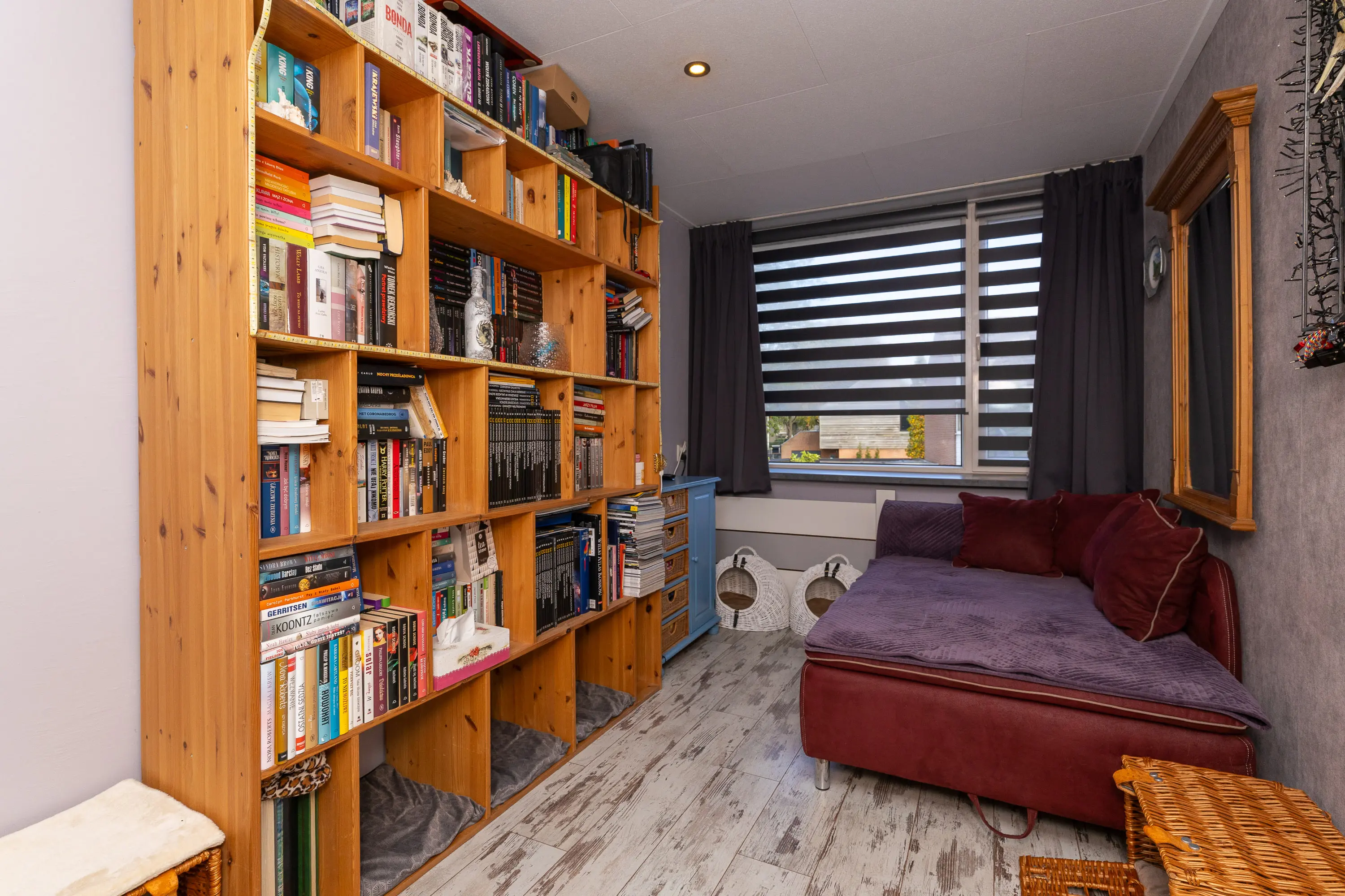De tuingerichte woonkamer biedt veel privacy en een warme, huiselijke sfeer. De grote raampartij zorgt voor een fijne lichtinval en een mooie verbinding met de onderhoudsvriendelijke achtertuin, bereikbaar via de aangebouwde bijkeuken.