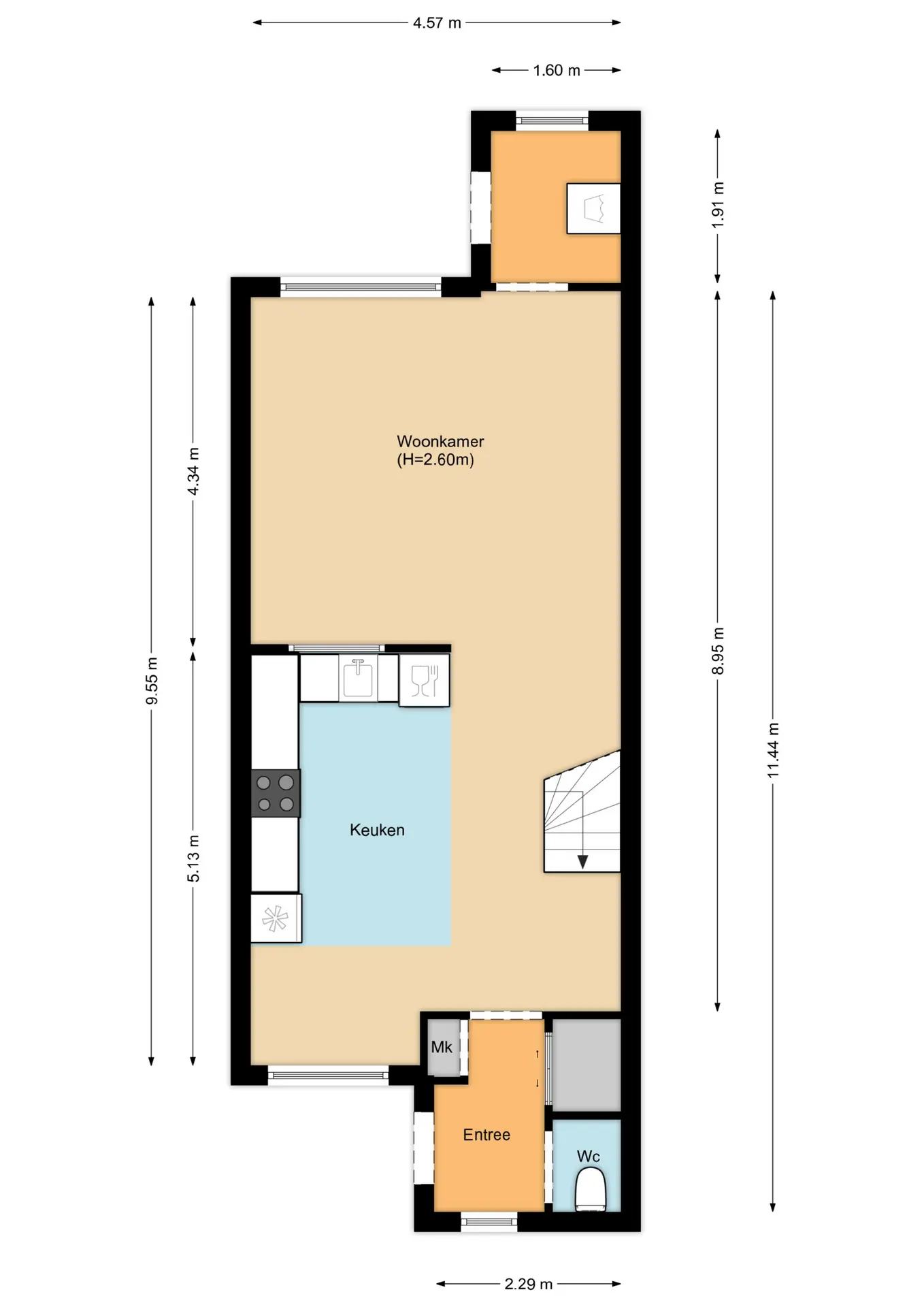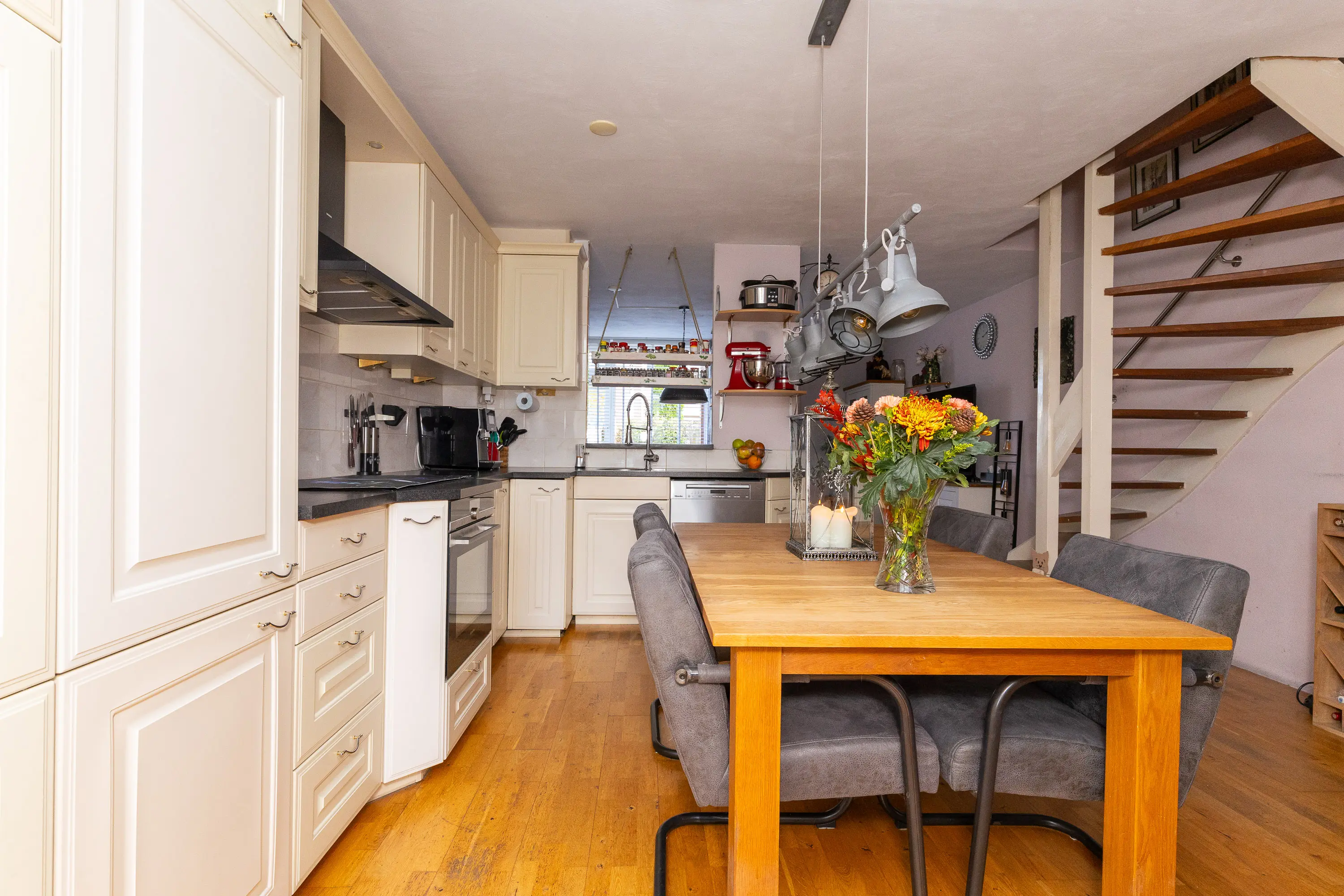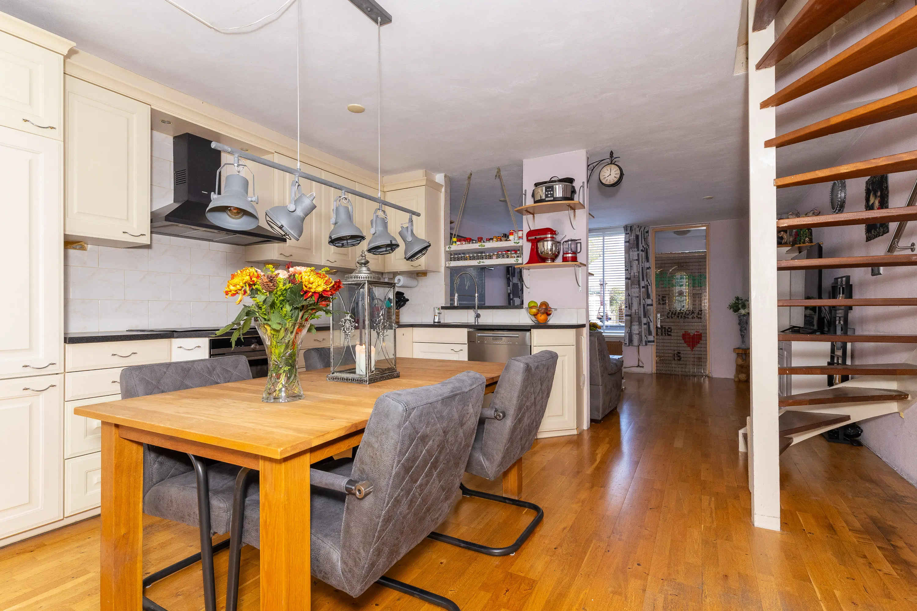 Bij binnenkomst valt direct de lichte, straatgerichte open woonkeuken op. Deze is voorzien van diverse recent vernieuwde inbouwapparatuur, waaronder een inductiekookplaat, combimagnetron met stoomfunctie en vaatwasser.