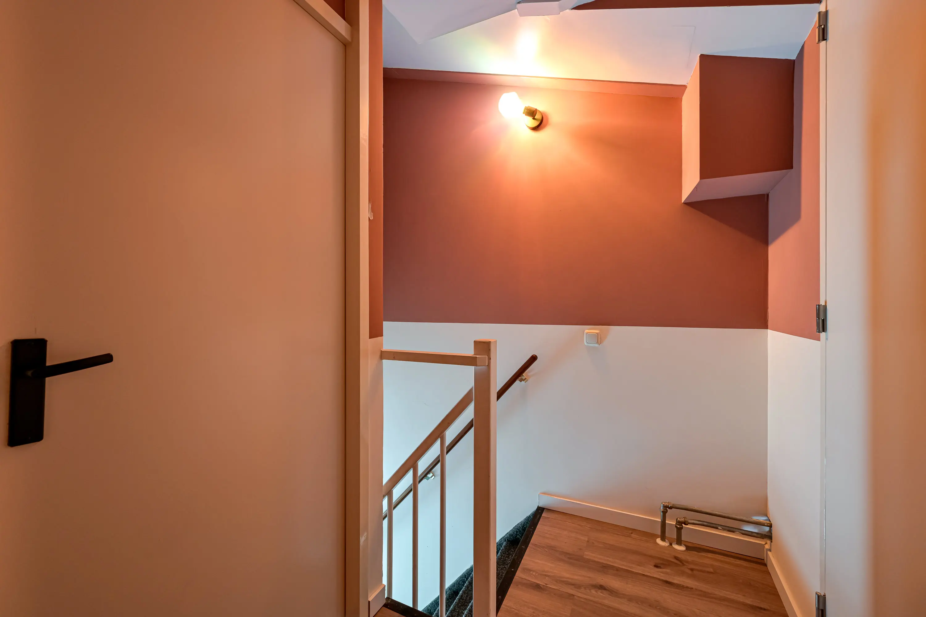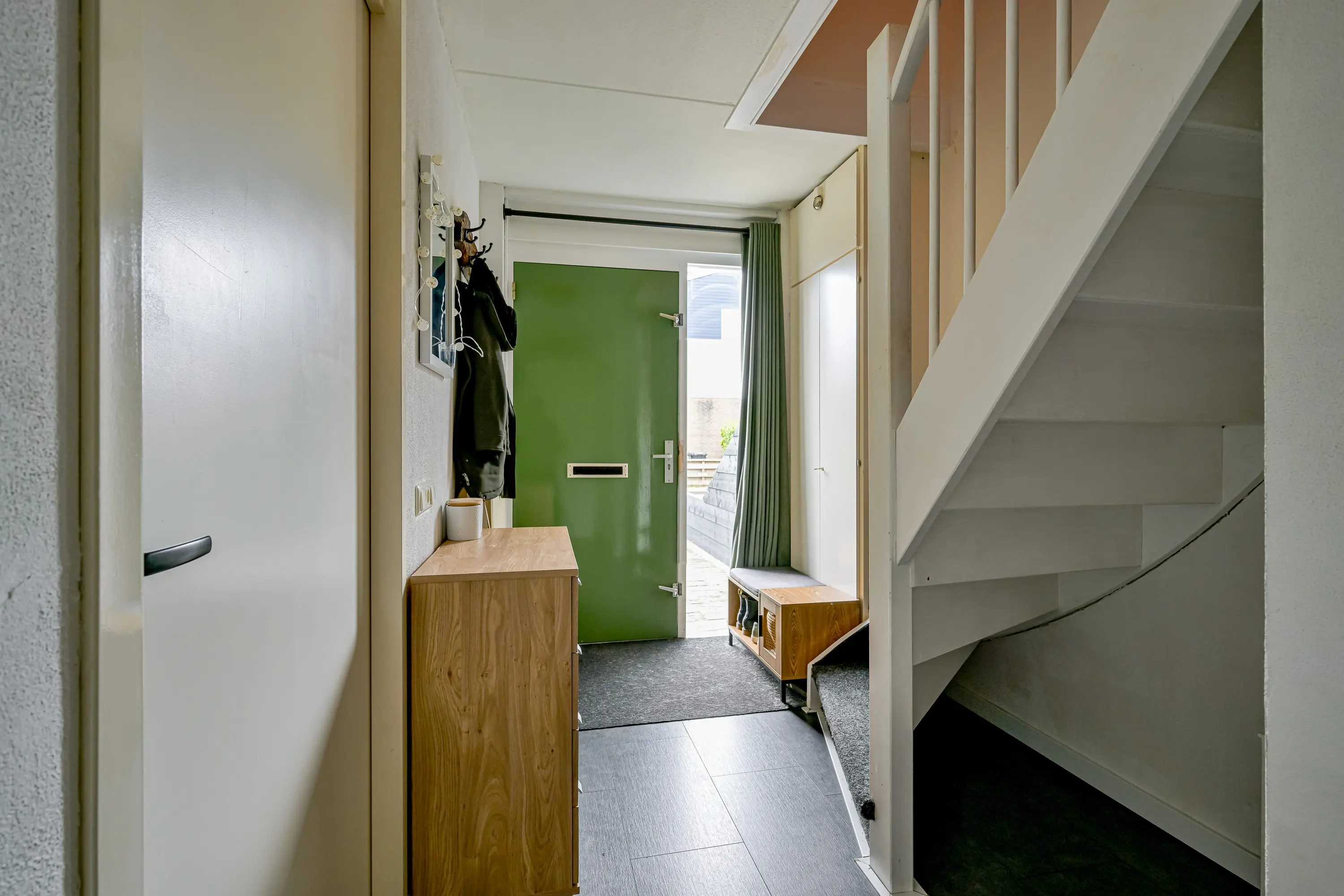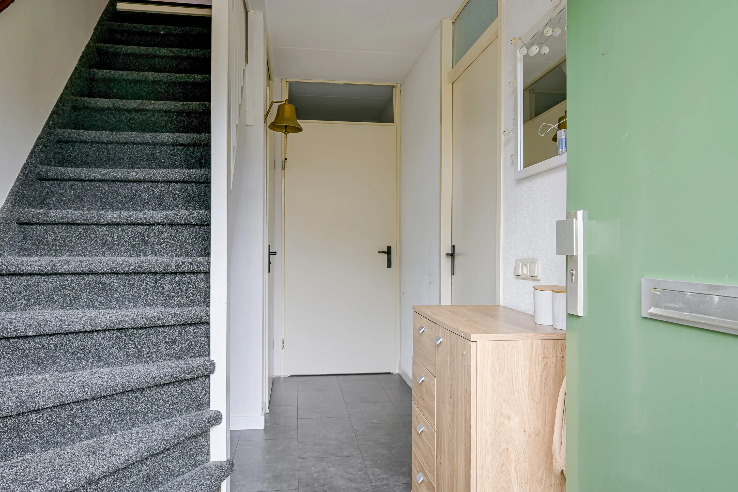Begane grond: In de hal aan de voorzijde van de woning treft u de meterkast, toiletruimte, badkamer, de trap naar boven en de toegang tot de woonkamer aan.