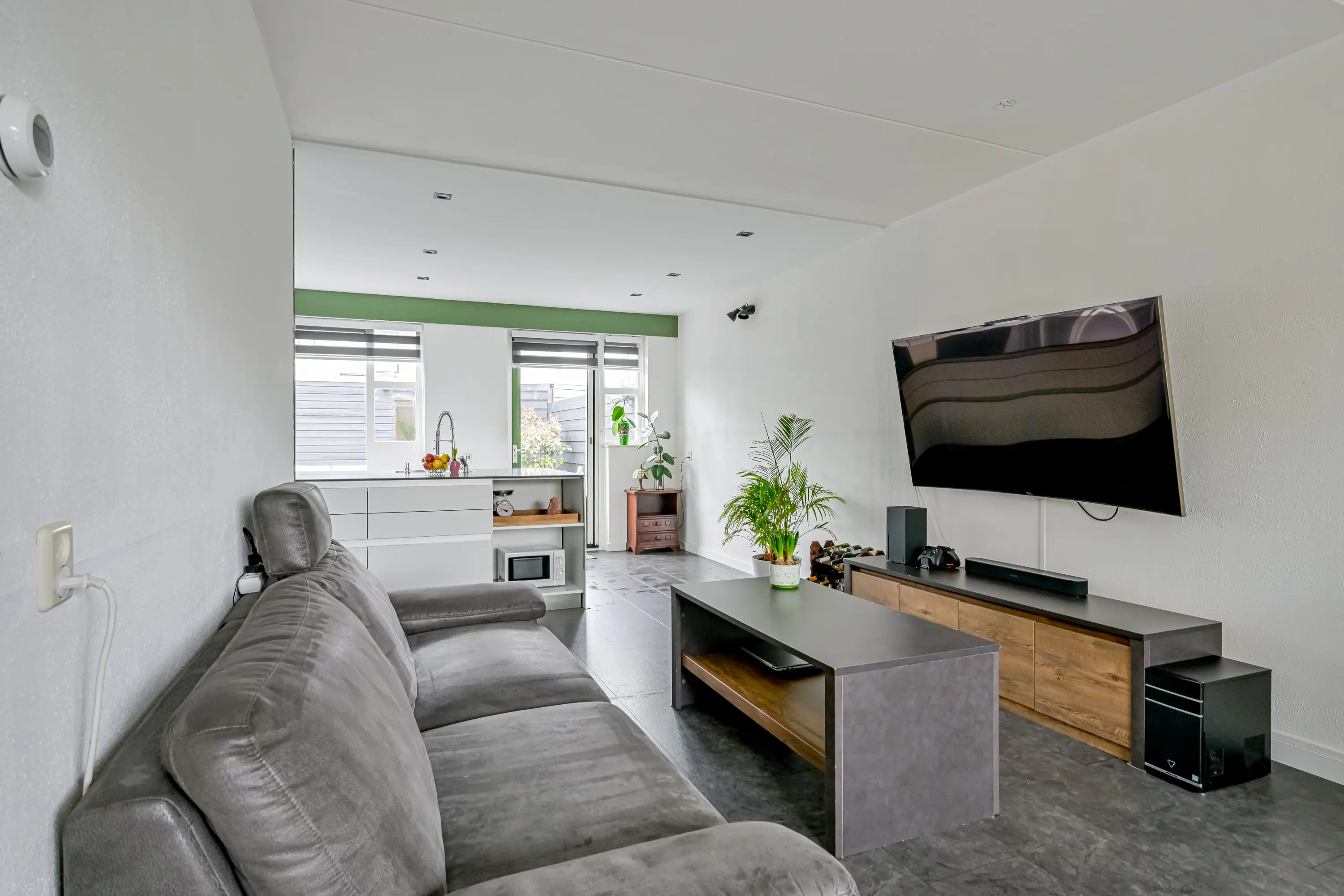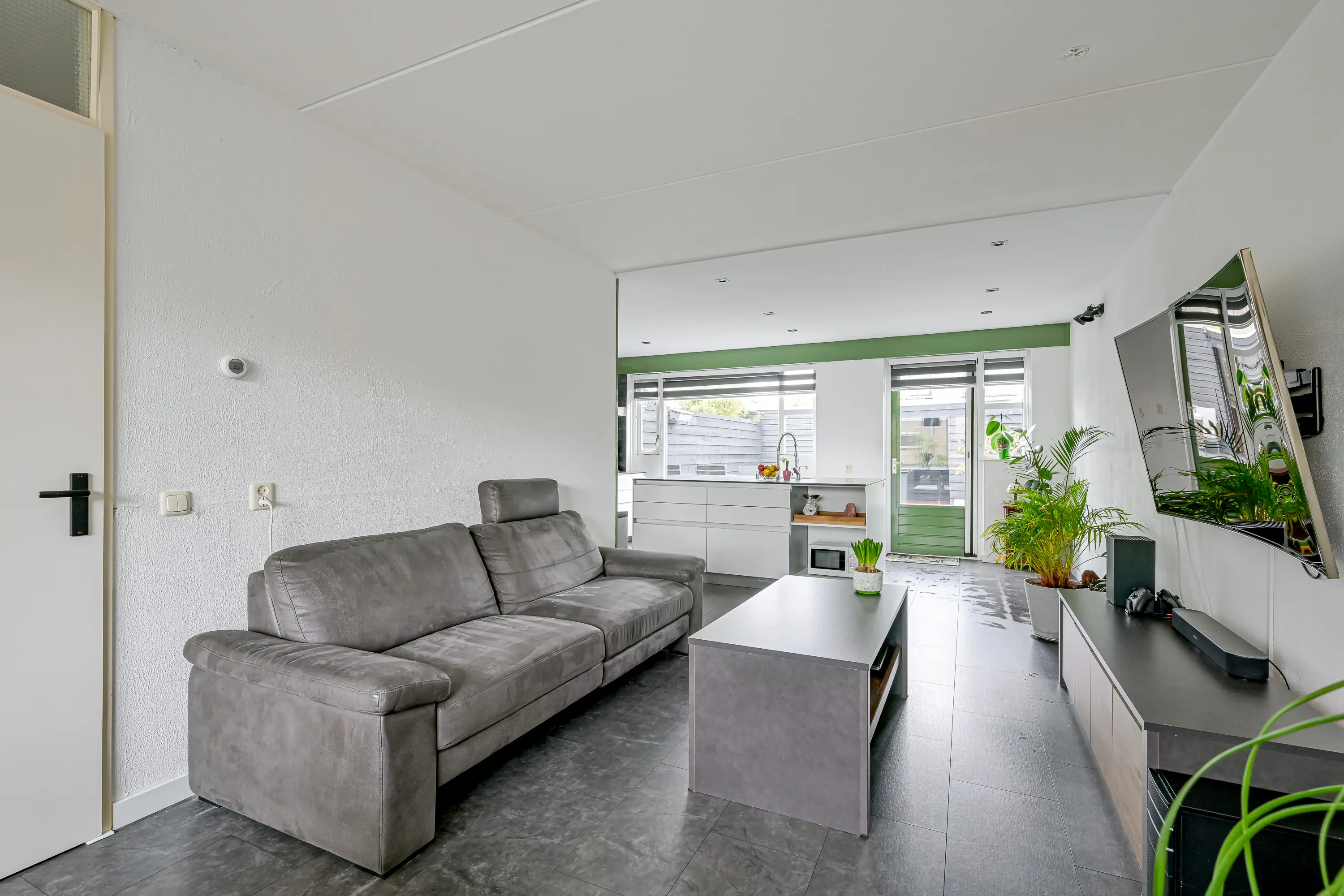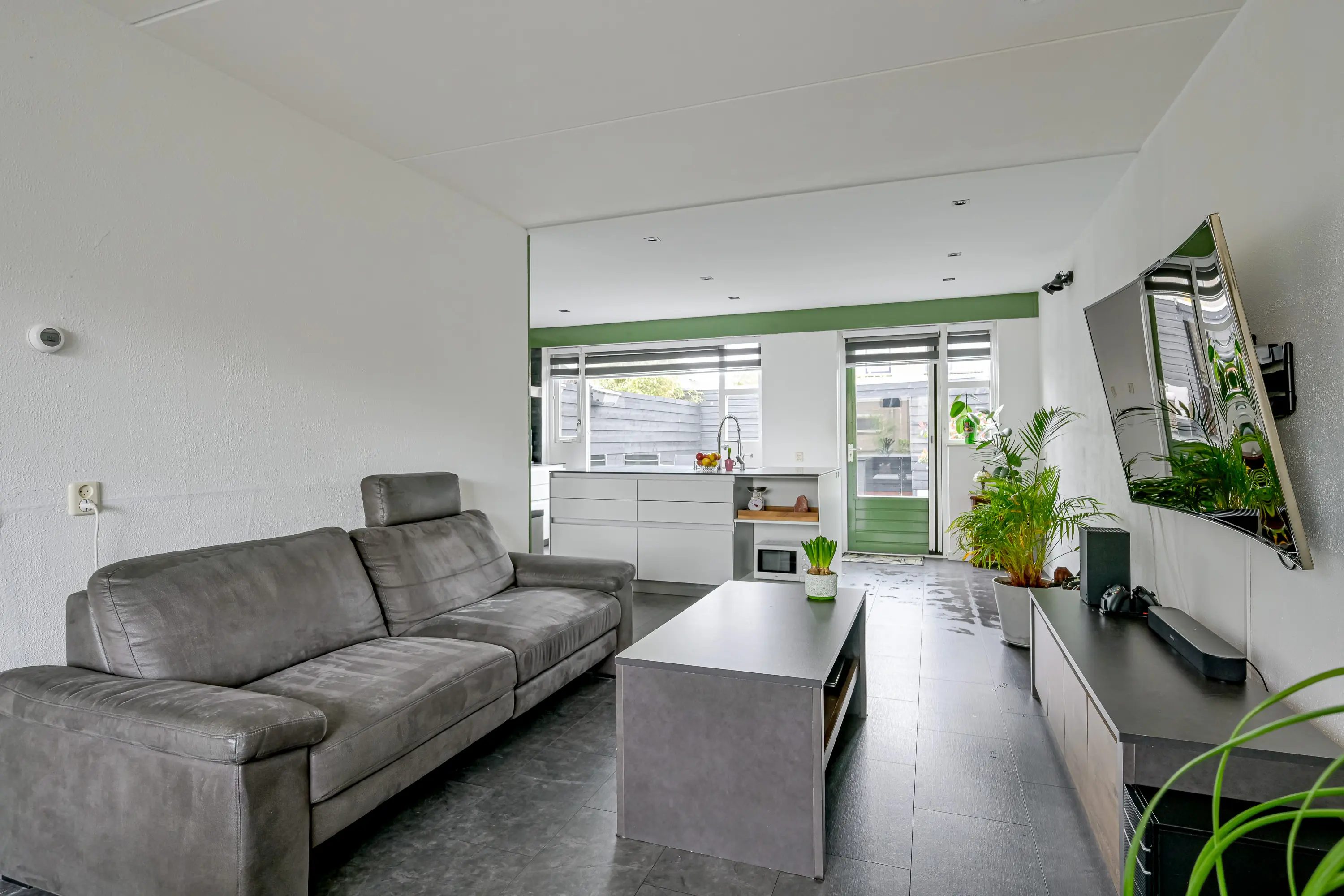 De lichte woonkamer is aan de voorzijde van de woning gelegen. Alle wanden en het plafond zijn in een lichte kleur afgewerkt en de vloer is voorzien van een keurige laminaatvloer. Vanuit de woonkamer heeft u zicht op de voortuin.