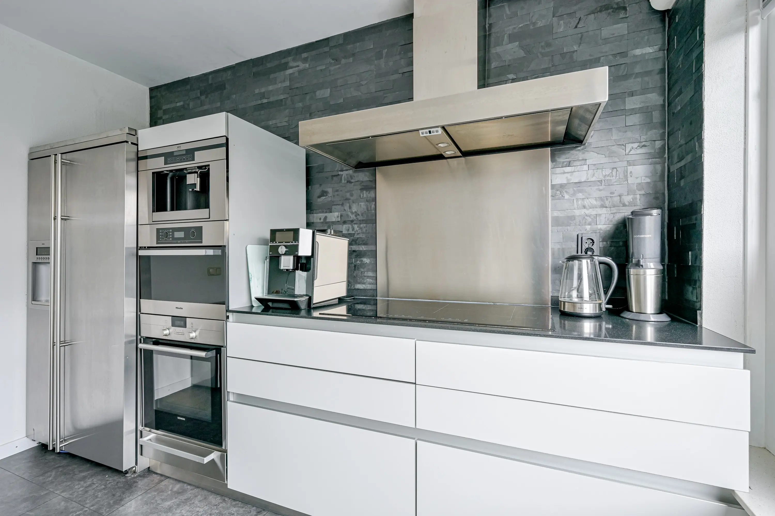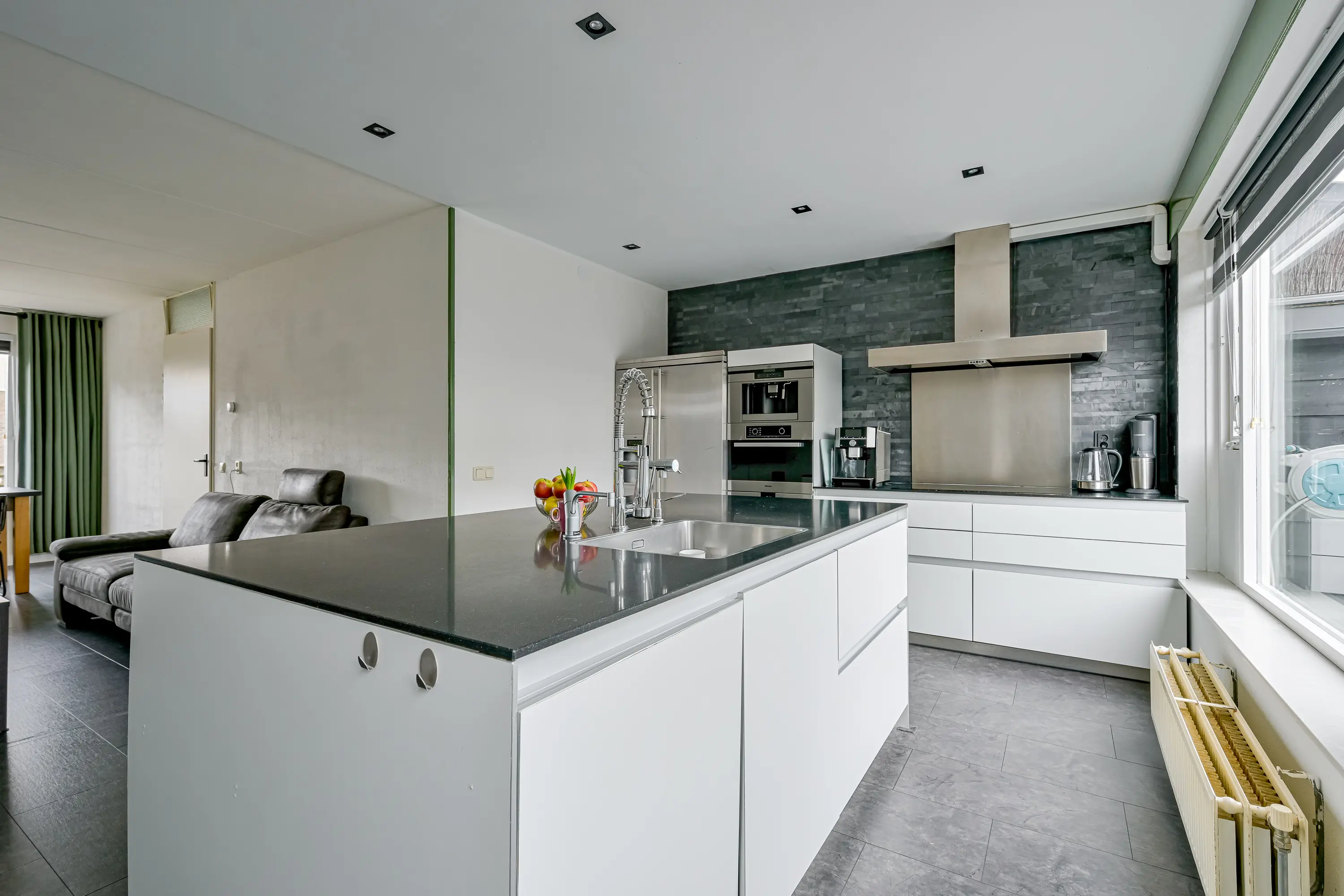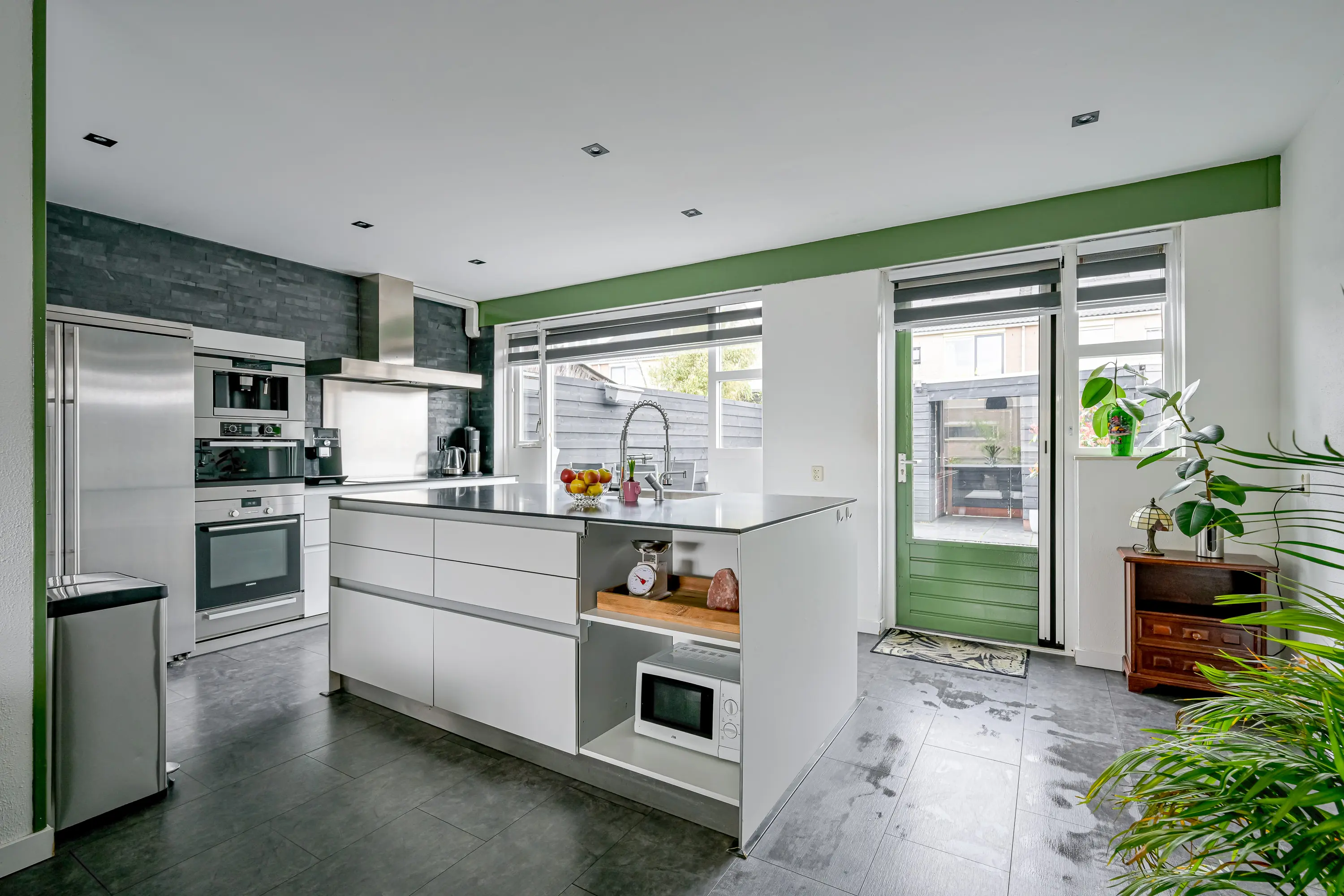 De open keuken is aan de achterzijde van de woning geplaatst. Het betreft een royale keuken met spoeleiland en voldoende kastruimte voor het opbergen van al uw keukengerei. De keuken is modern van uitstraling en biedt alles wat u nodig heeft in een keuken. Denk hierbij aan een kookplaat, koel-vriescombinatie, afzuigkap, warmhoud lade, oven, stoomoven en een inbouw koffiezetapparaat