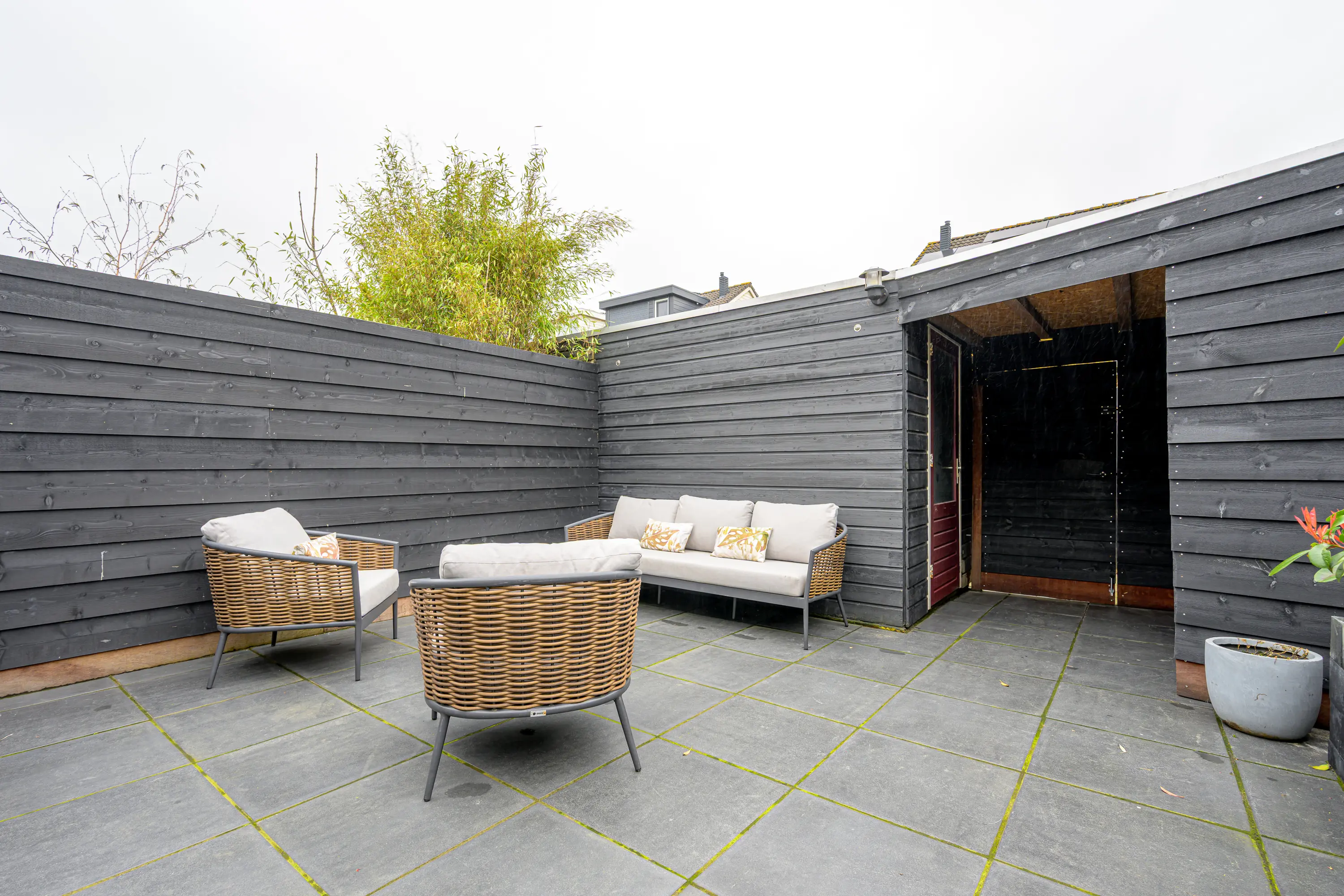 Tuin: De ruime achtertuin is zeer recent keurig aangelegd en voorzien van sierbestrating. De achtertuin is via een achterom te bereiken en dat is natuurlijk prettig. In de houten berging is voldoende ruimte aanwezig voor het stallen van fietsen en het opbergen van uw tuingereedschap. De overkapping zorgt voor een droge entree naar de schuur. De voortuin is niet lang geleden bestraat en aangelegd. Deze is voorzien van sierbestrating, houten hekwerk en stenen plantenbakken. Een keurig geheel!