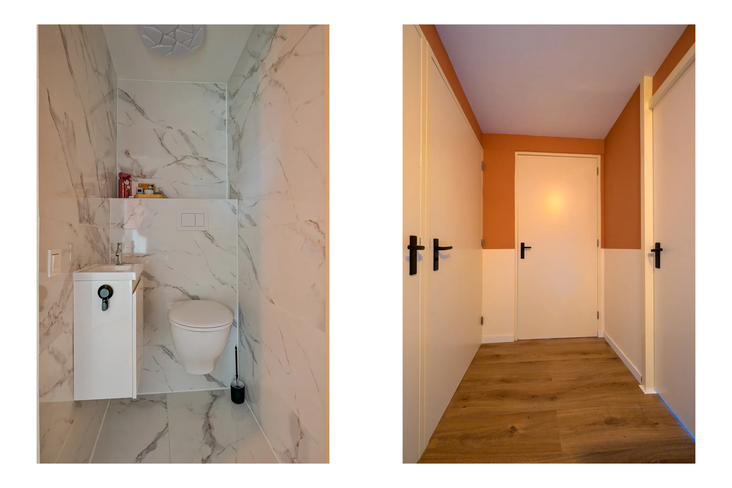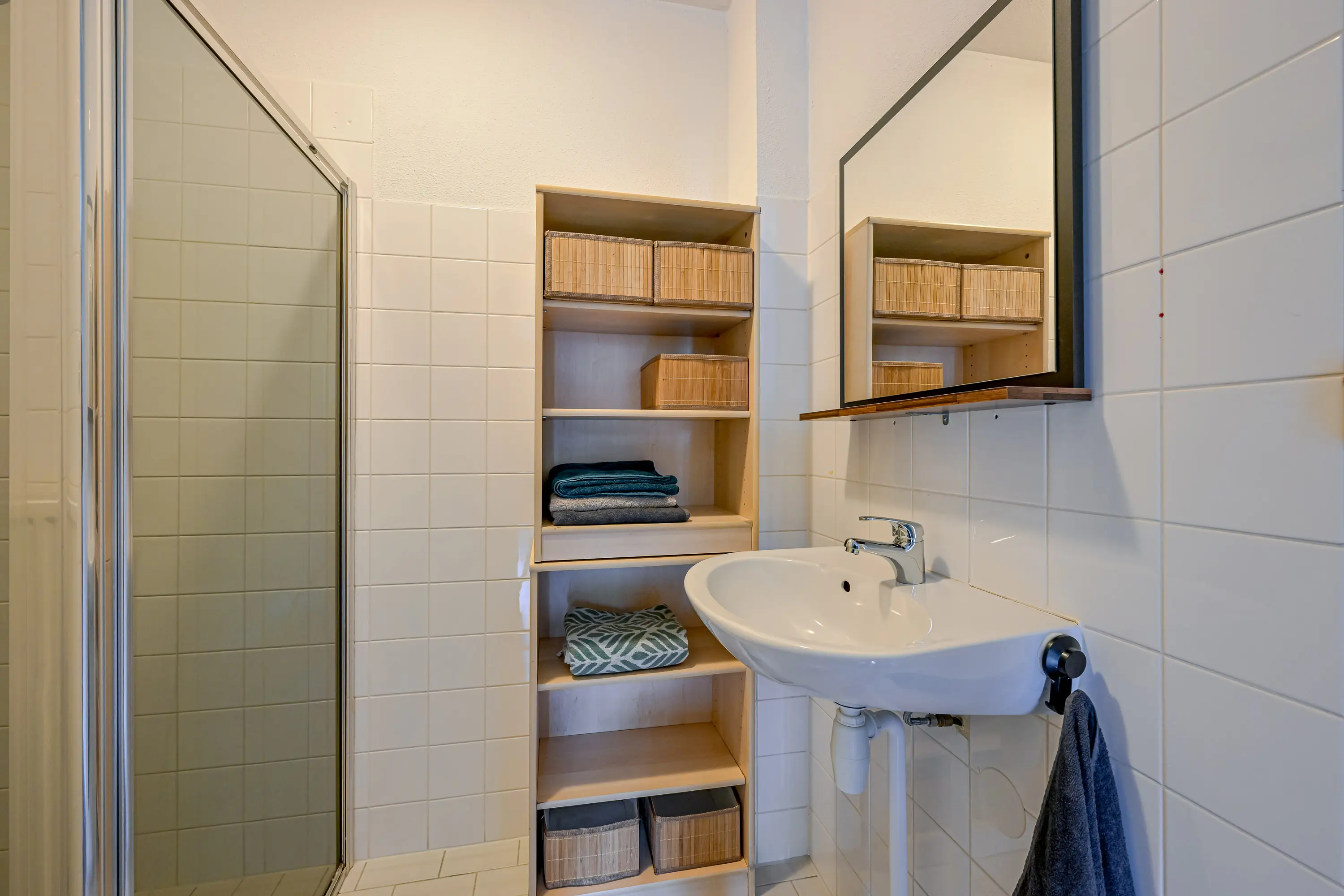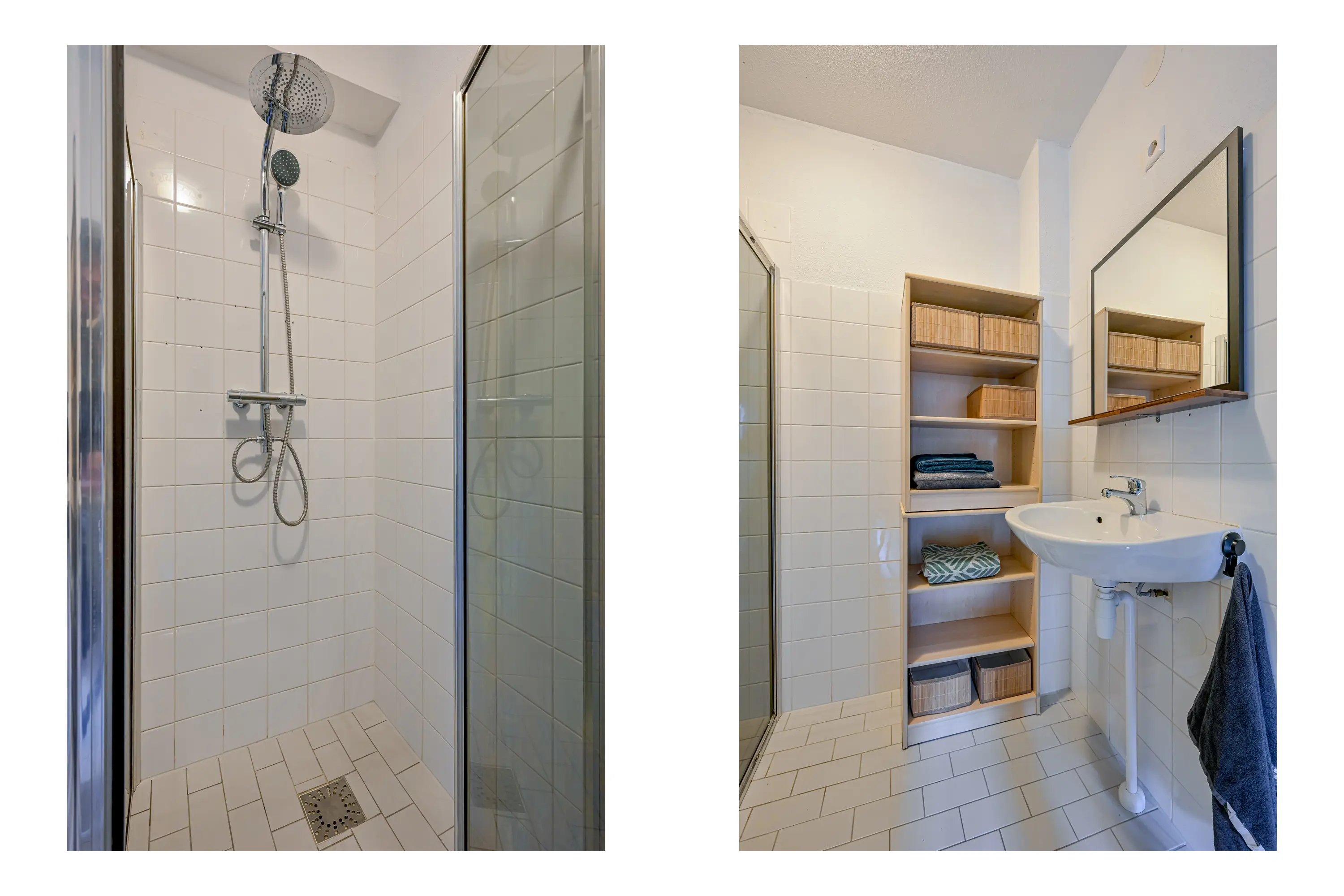 Vanuit de hal bij de entree heeft u toegang tot het aparte toilet en de badkamer. De badkamer is voorzien van een inloopdouche en een wastafel met meubel.