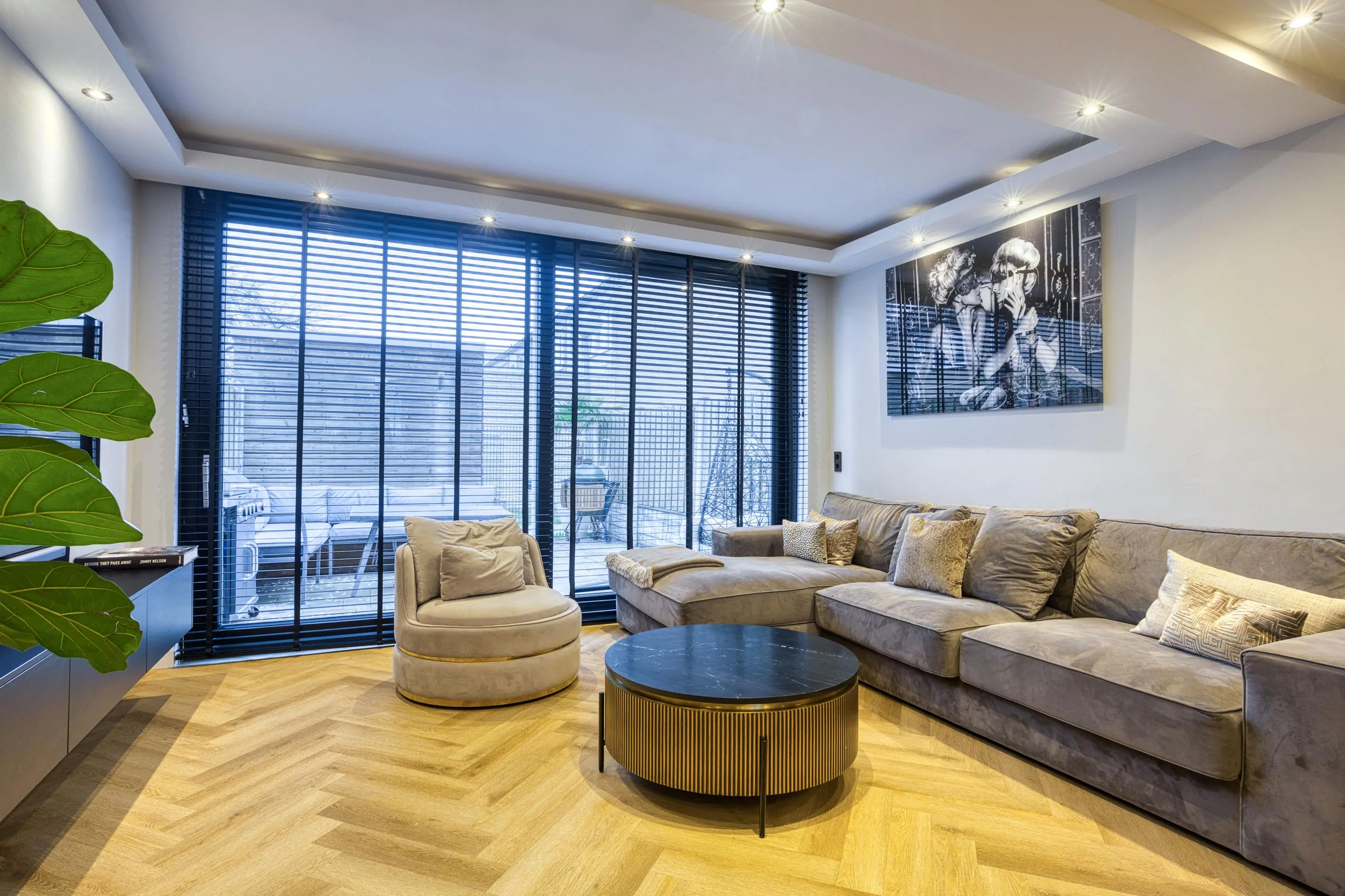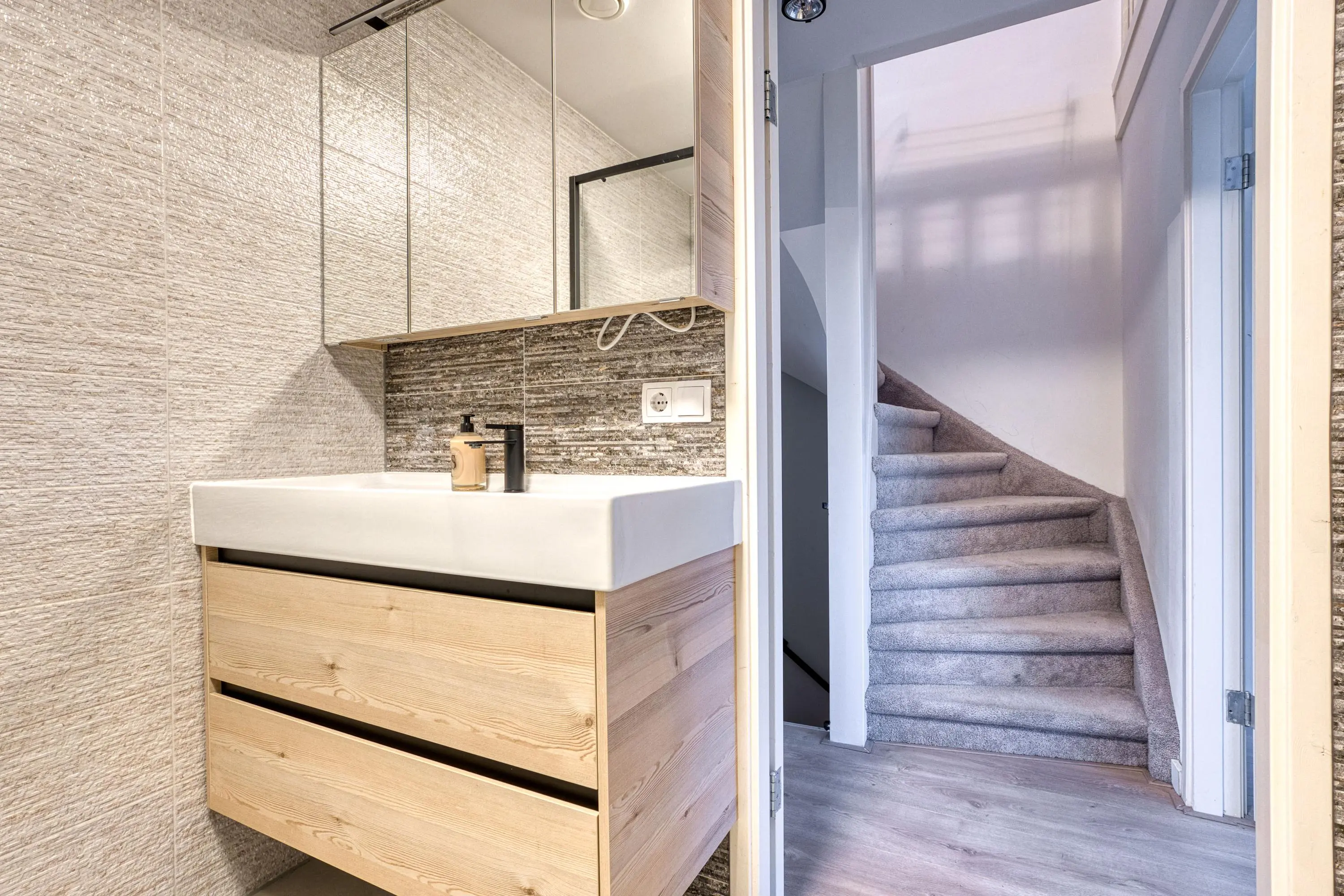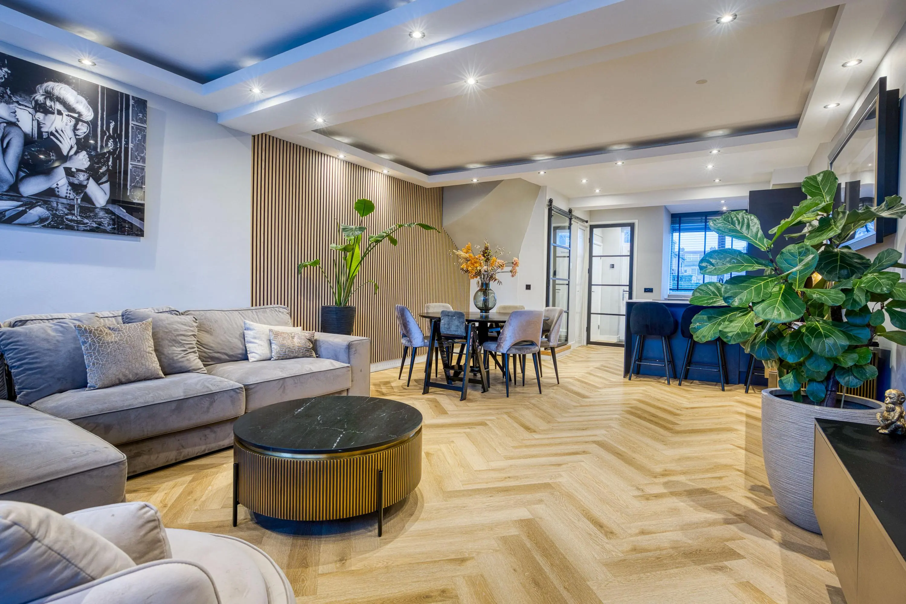 De gehele begane grond is afgewerkt met strak gestucte wanden en plafonds, een fraaie PVC visgraatvloer met comfortabele vloerverwarming en keurig weggewerkte inbouwspots. Het geheel ademt luxe en rust en zorgt voor een warm en modern woongevoel.