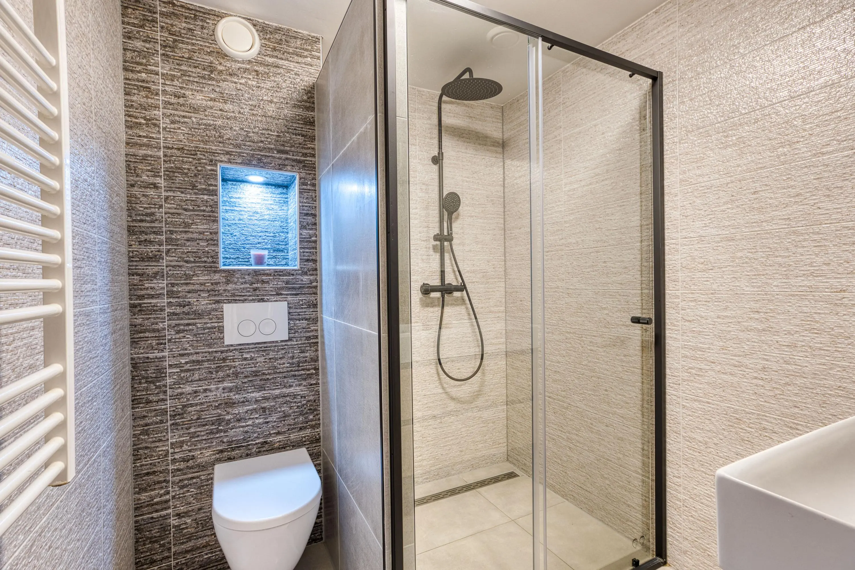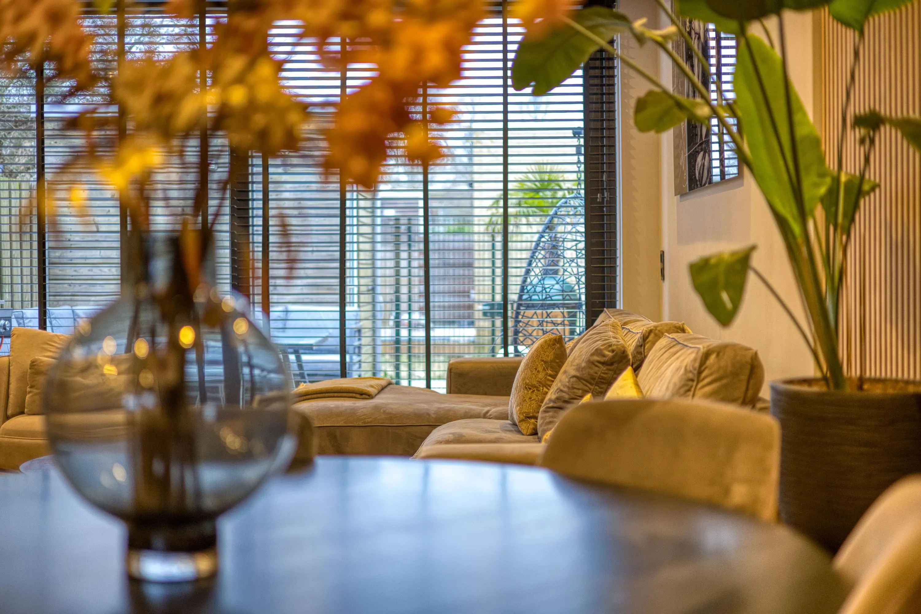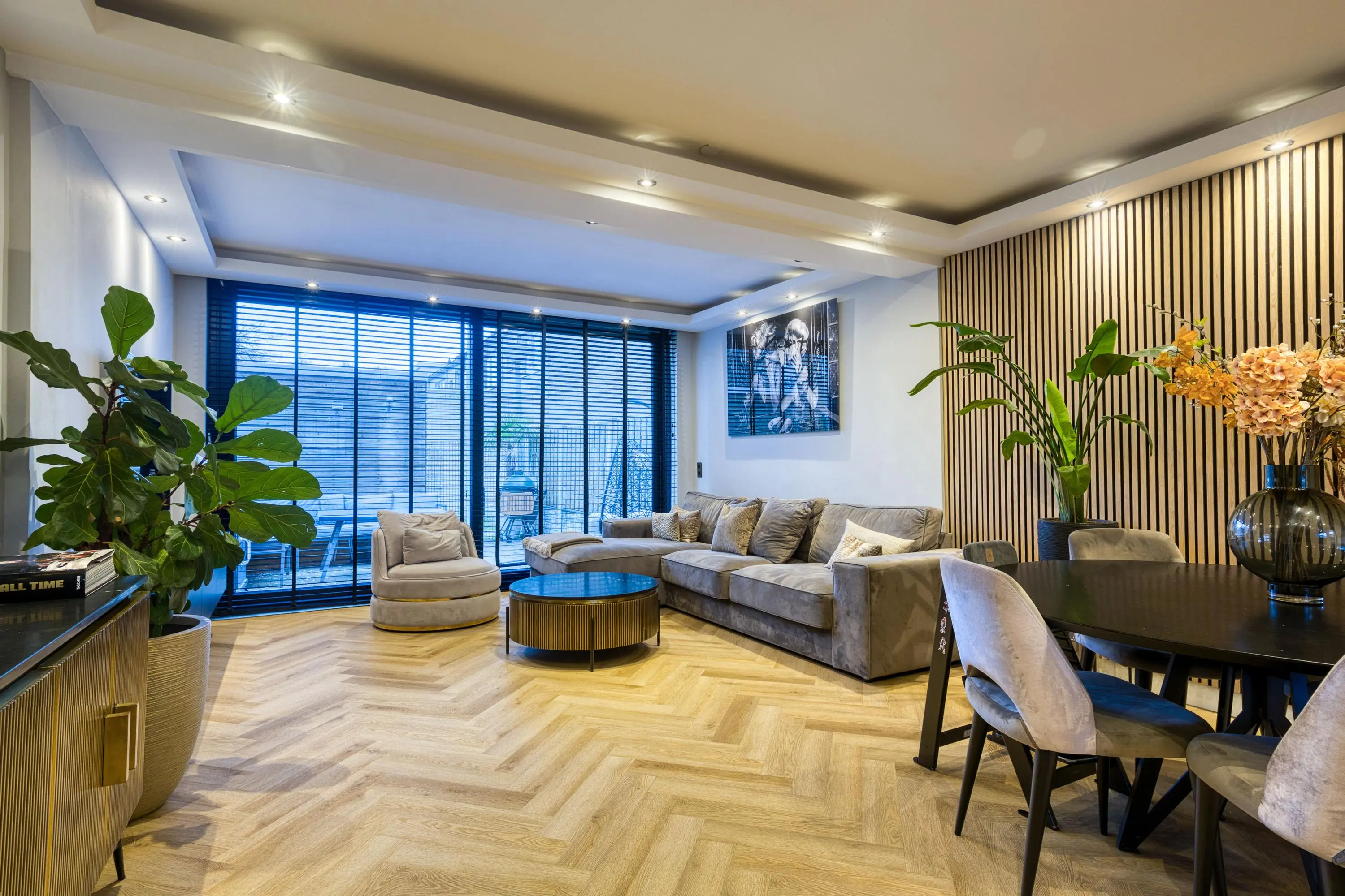 De gehele begane grond is afgewerkt met strak gestucte wanden en plafonds, een fraaie PVC visgraatvloer met comfortabele vloerverwarming en keurig weggewerkte inbouwspots. Het geheel ademt luxe en rust en zorgt voor een warm en modern woongevoel.