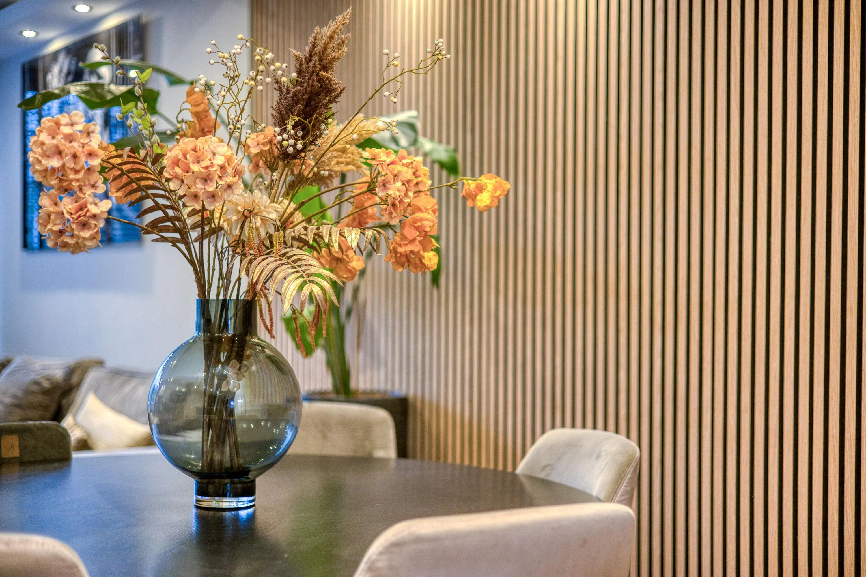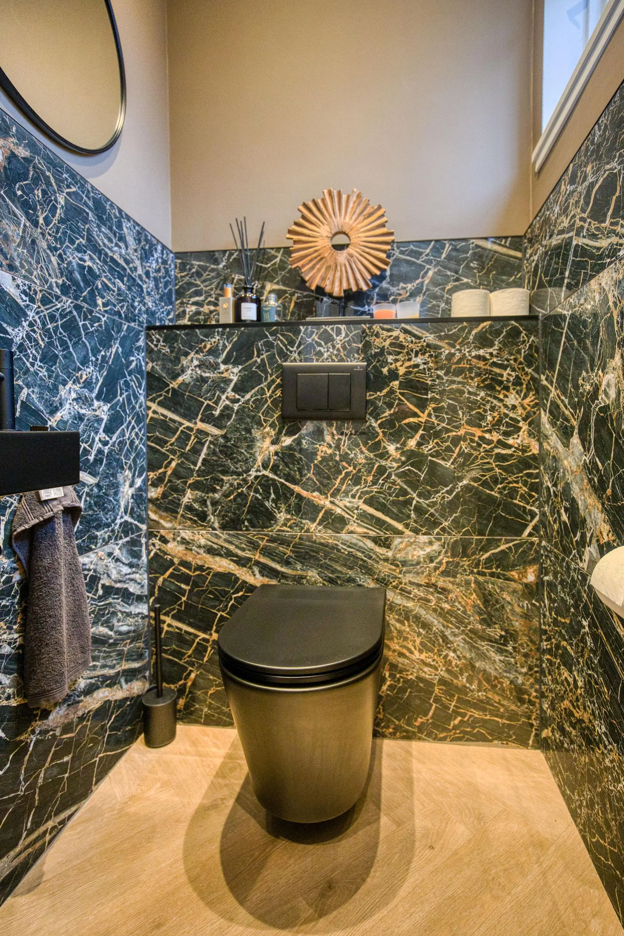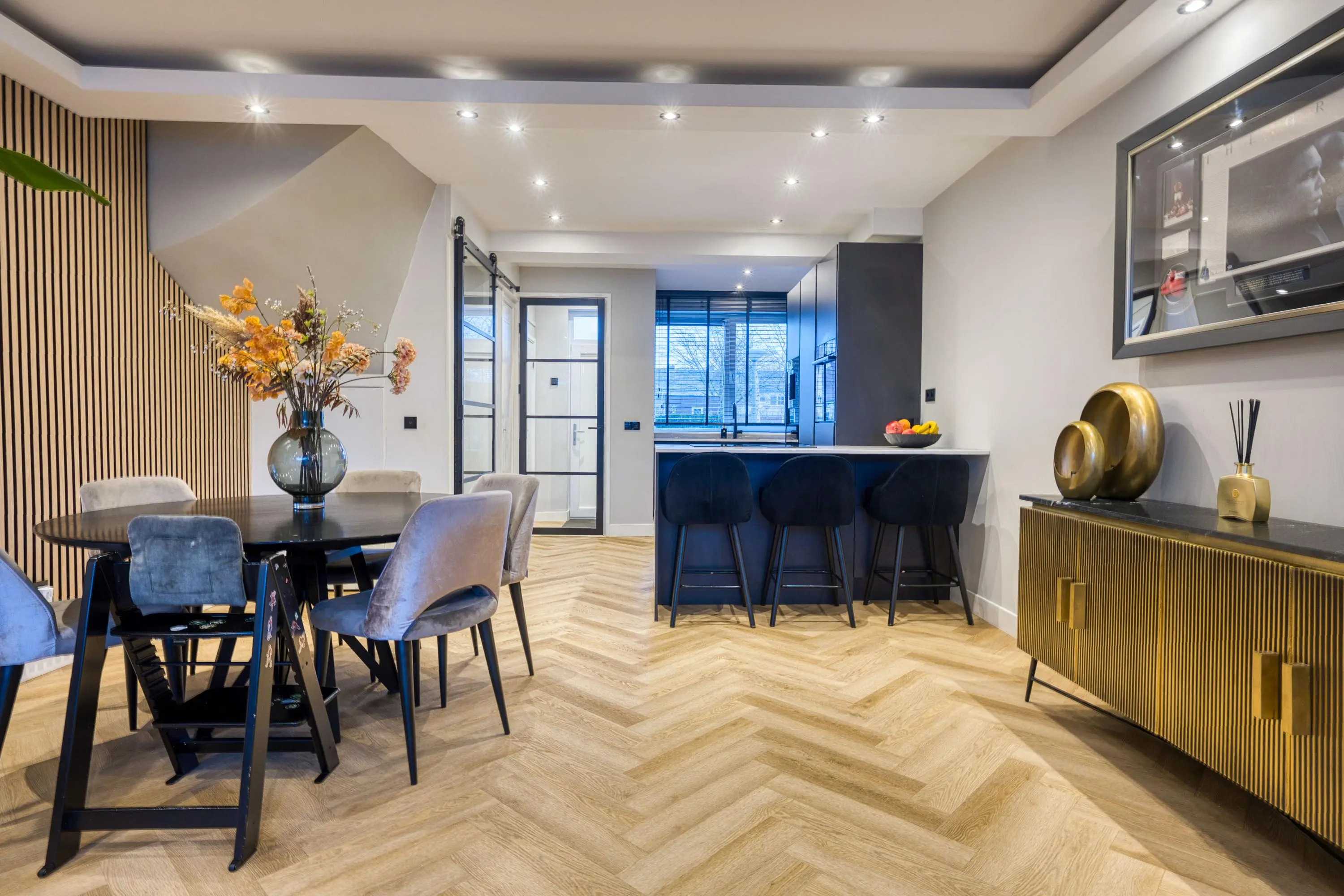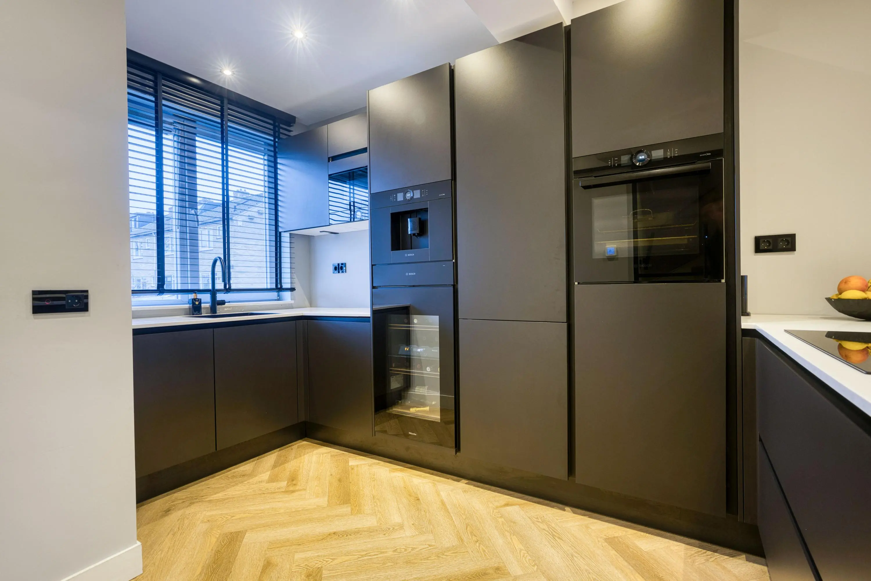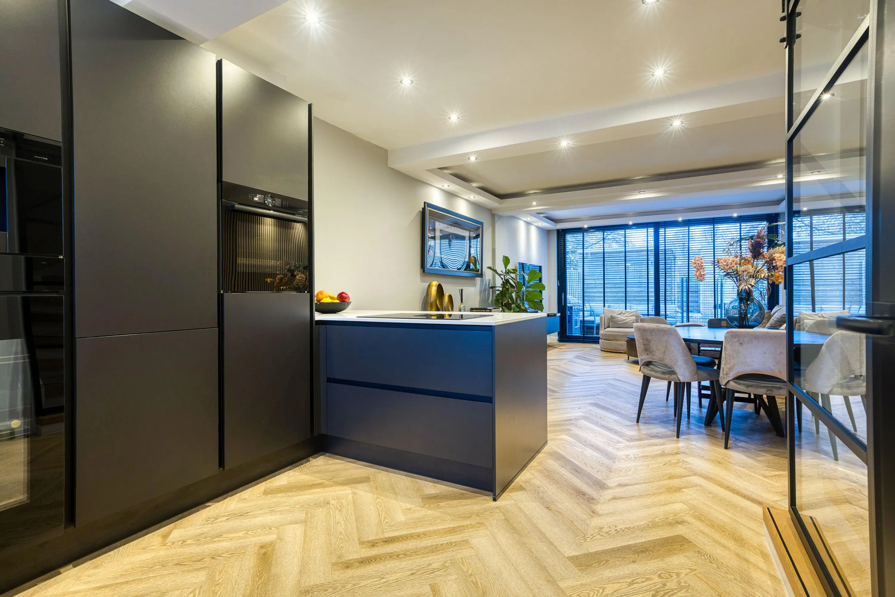 De begane grond vormt het hart van het huis en is in 2022 grondig verbouwd. Hier is een prachtige, luxe keuken gerealiseerd in een donkere en moderne kleurstelling. De keuken is uitgerust met hoogwaardige inbouwapparatuur van Bosch en Miele, waaronder een inbouw koffiemachine, wijnklimaatkast, combi-oven, koel-vriescombinatie en een Quooker. Het royale schiereiland met Bora kookplaat maakt deze keuken niet alleen een echte eyecatcher, maar ook een heerlijke plek om te koken en samen te komen. Aan kastruimte is geen gebrek.