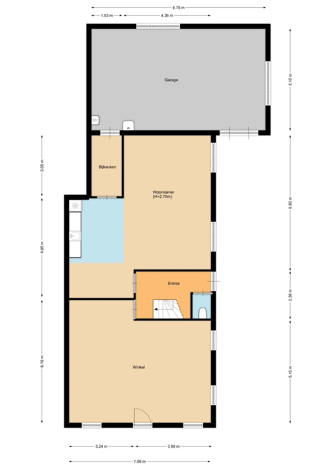 Hoofdentree, lichte woonkamer met grote raampartijen, meterkast, zij-entree, hal, toilet, trapopgang naar de 1e verdieping, woonkeuken/hobbyruimte met opstelling keukenblok met vaatwasser, koelkast met vriesvak, afzuigkap, inductiekookplaat, bijkeuken met keukenblok, garage/magazijn met opstelling cv-ketel.