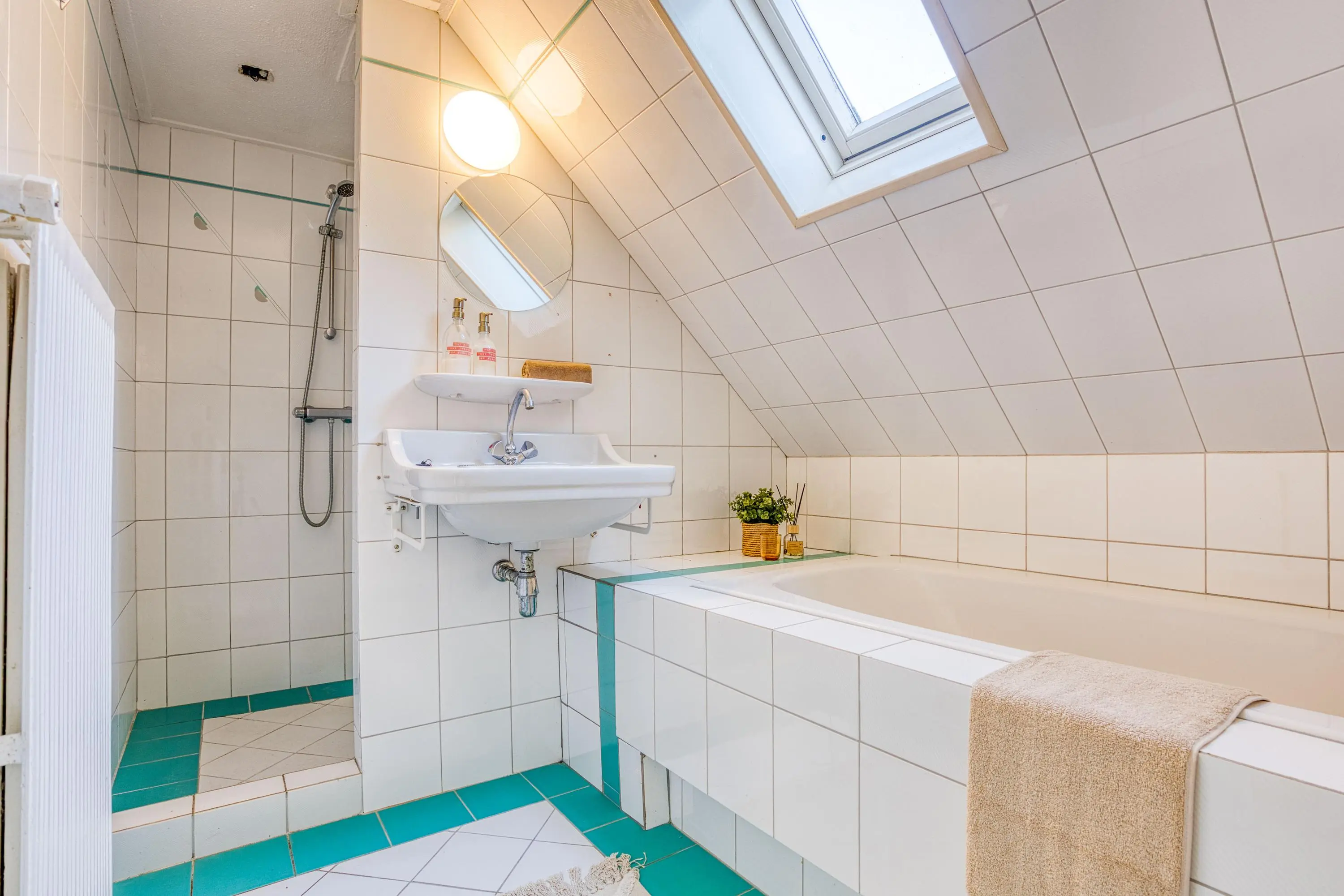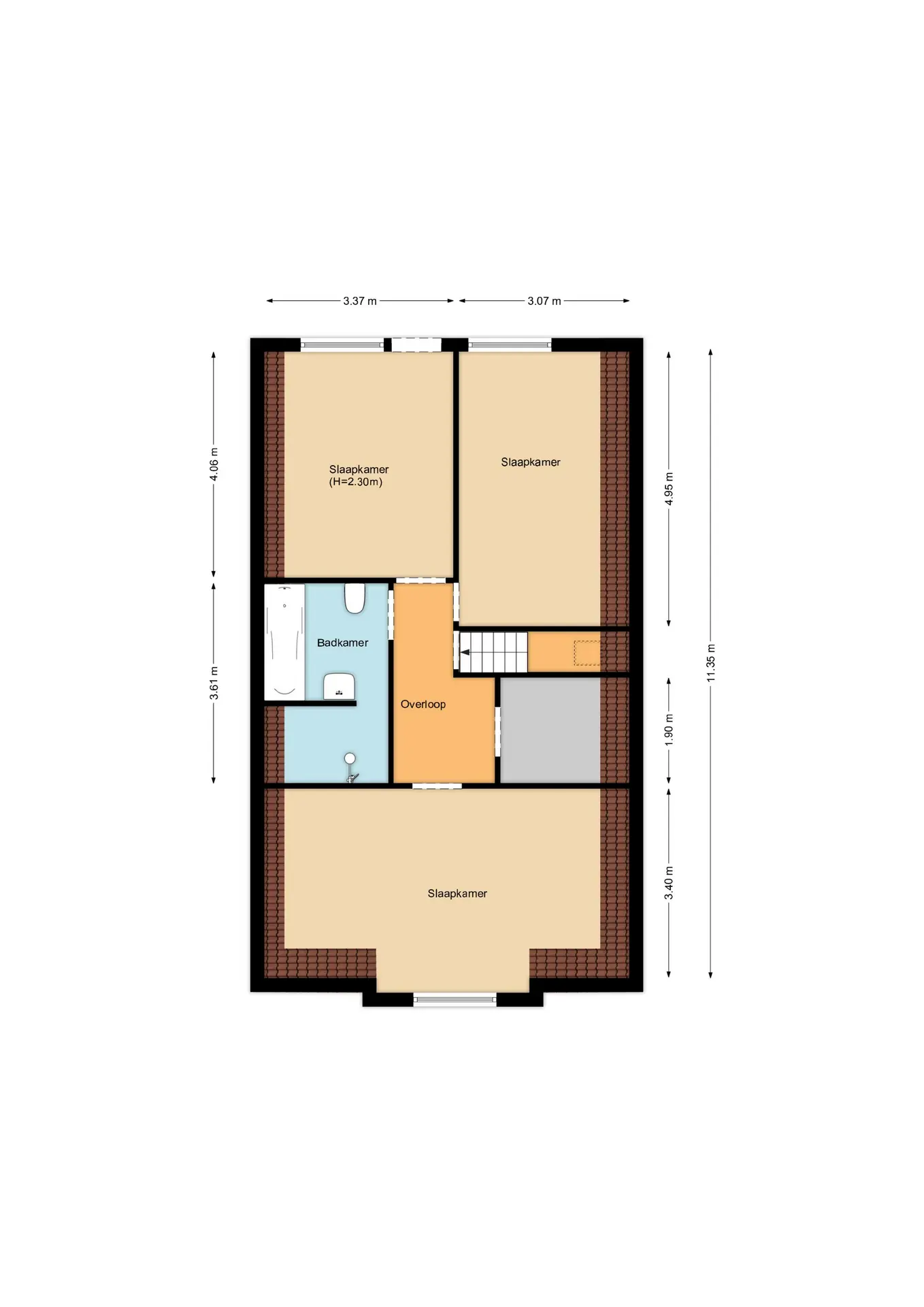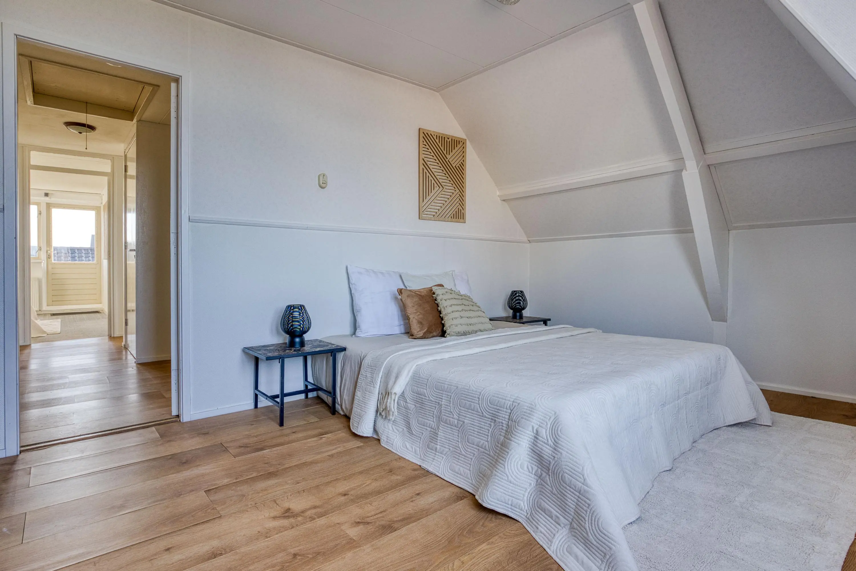 Overloop, 2-tal slaapkamers aan de achterzijde, waarvan één is voorzien van een deur naar het platte dak, badkamer met douche, toilet, ligbad en een toilet, aansluitend een bergruimte en aan de voorzijde de ruime 3e slaapkamer.