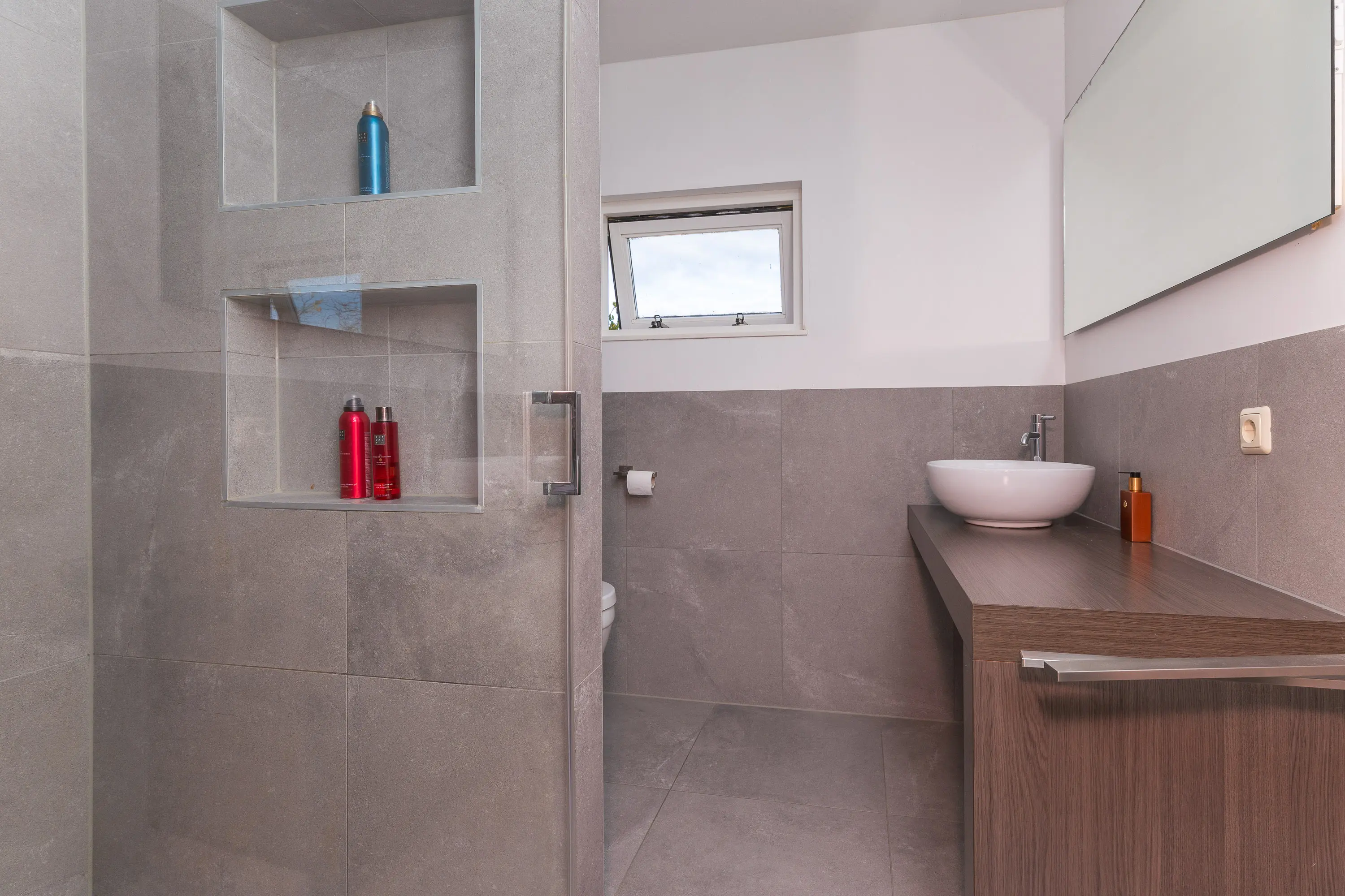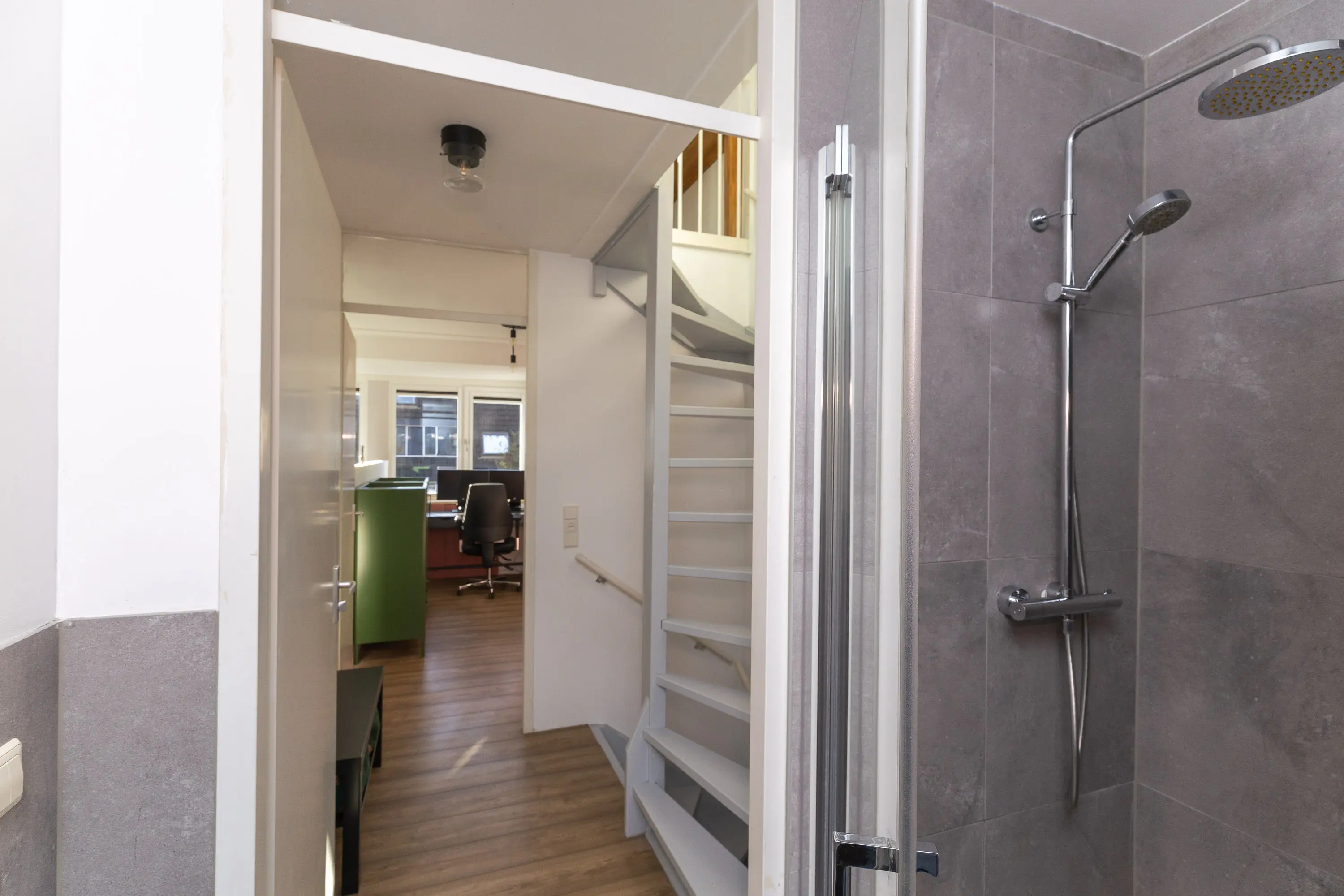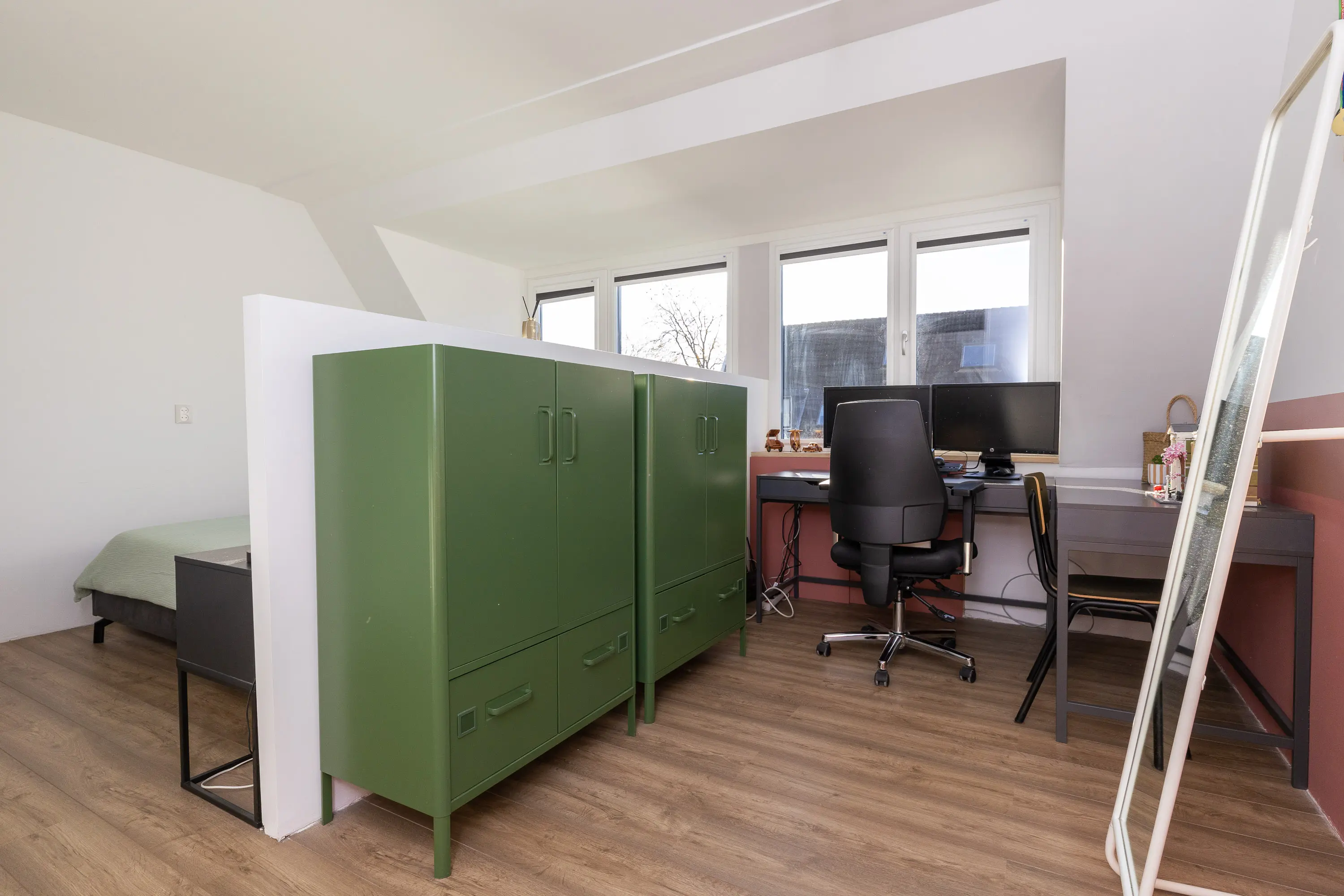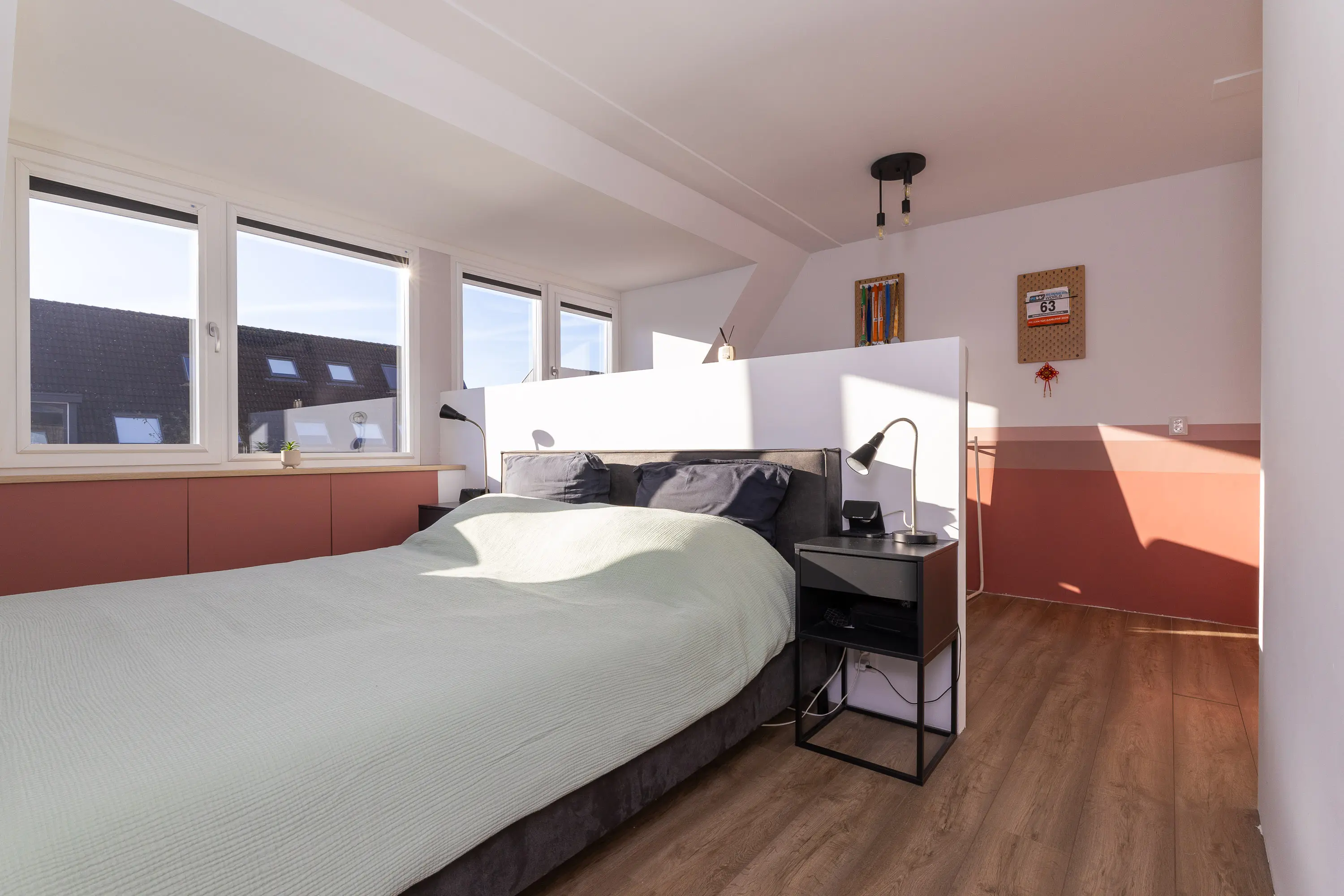 Op de eerste verdieping treft u een bijzonder ruime slaapkamer aan, ontstaan uit het samenvoegen van twee kamers. Dankzij de grote dakkapel (geplaatst in 2021) geniet u hier van veel licht en ruimte. De kamer is fraai ingedeeld met een halfhoge muur die zorgt voor een natuurlijke scheiding tussen het slaapgedeelte en de werkruimte. Daarnaast is er een ruime inloopkast aanwezig, de ideale opbergruimte voor uw garderobe. Indien gewenst is deze kamer eenvoudig weer op te splitsen in twee afzonderlijke slaapkamers. Aan de voorzijde treft u een tweede, nette slaapkamer. De gehele verdieping is voorzien van gestuukte wanden en keurige vloeren. De moderne badkamer maakt het plaatje compleet: een inloopdouche met rainshower en handdouche, een wastafelmeubel, toilet, een handige handdoeknis en zowel mechanische als natuurlijke ventilatie.