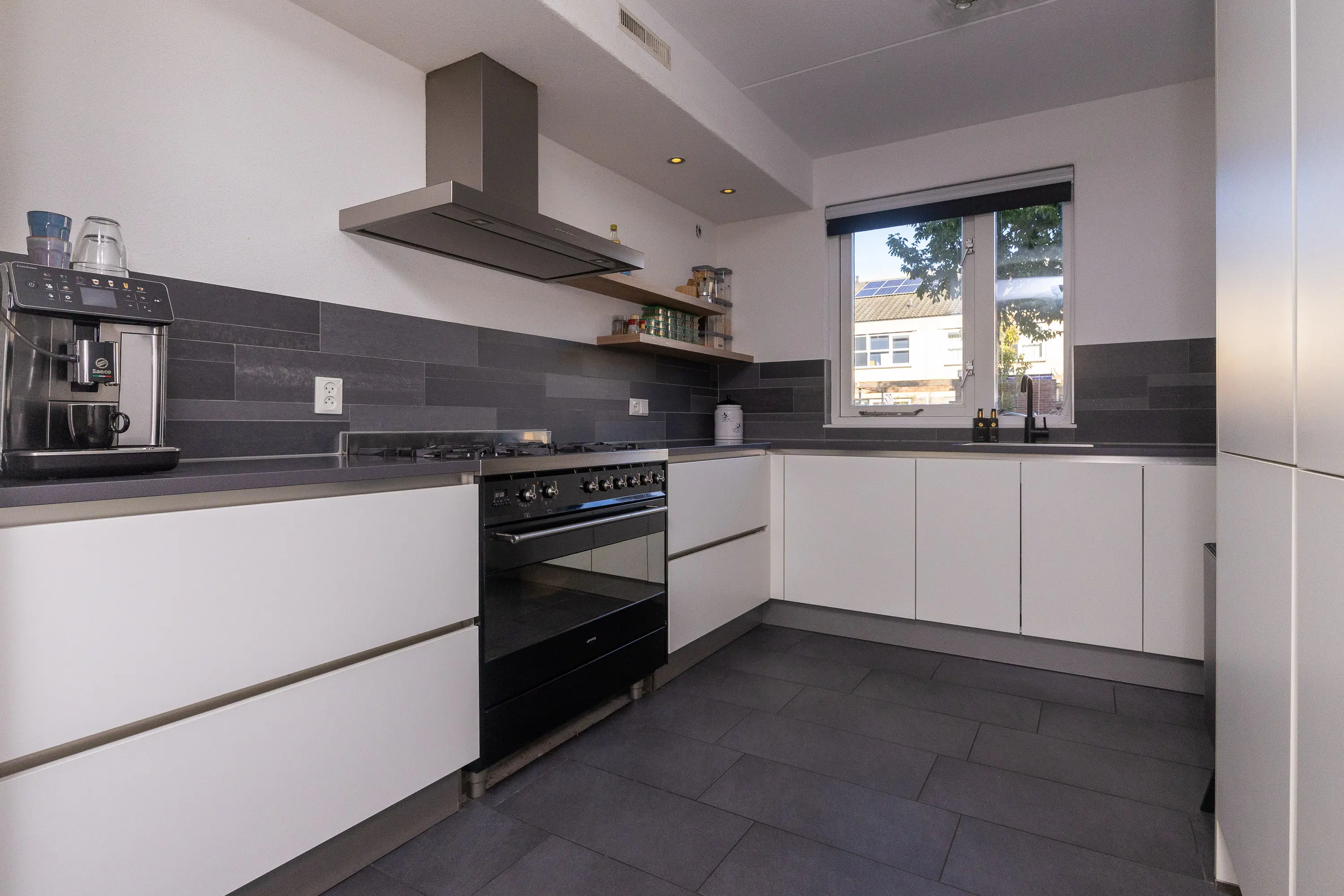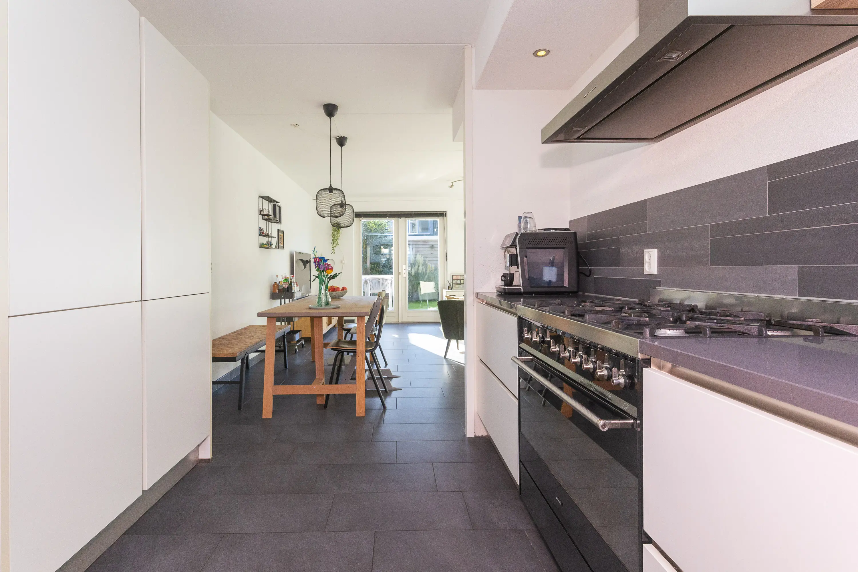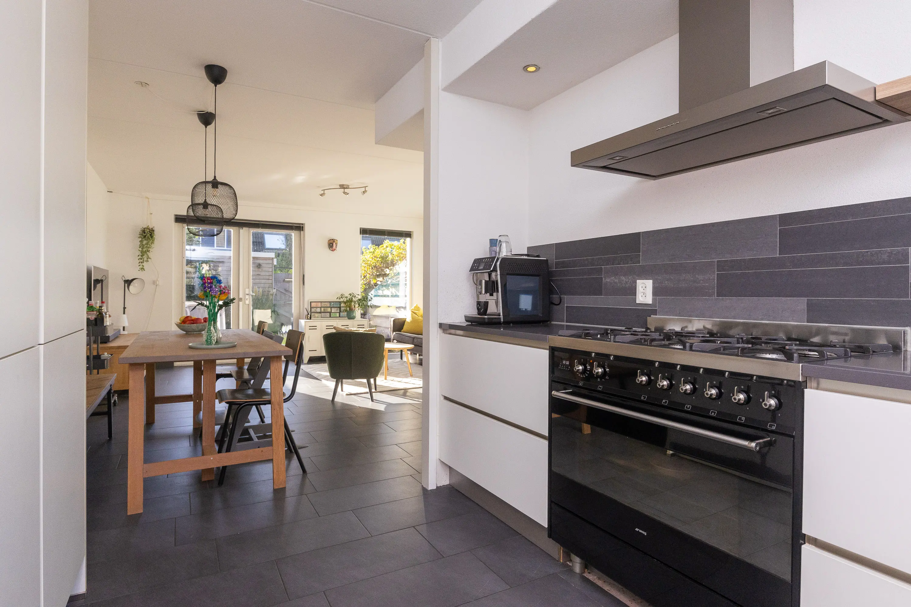 U wordt ontvangen in een nette entree met meterkast, het toilet, trapopgang en een deur naar de woonkamer. De lichte, tuingerichte woonkamer ligt op het zuidoosten en is voorzien van vloerverwarming, openslaande tuindeuren en een groot raam tot aan de vloer die zorgt voor een mooie lichtinval. Strakke wanden, een verzorgde afwerking en een praktische trapkast maken de ruimte helemaal compleet. Aan de voorzijde bevindt zich de open keuken, uitgevoerd met een luxe Smeg-oven met 6-pits gasfornuis, vaatwasser, koelkast, vriezer en afzuiging. De keuken beschikt over inbouwspots, een nette betegelde achterwand en voldoende bergruimte in de lades. Terwijl u kookt, kijkt u uit over de nette voortuin en de rustige straat.