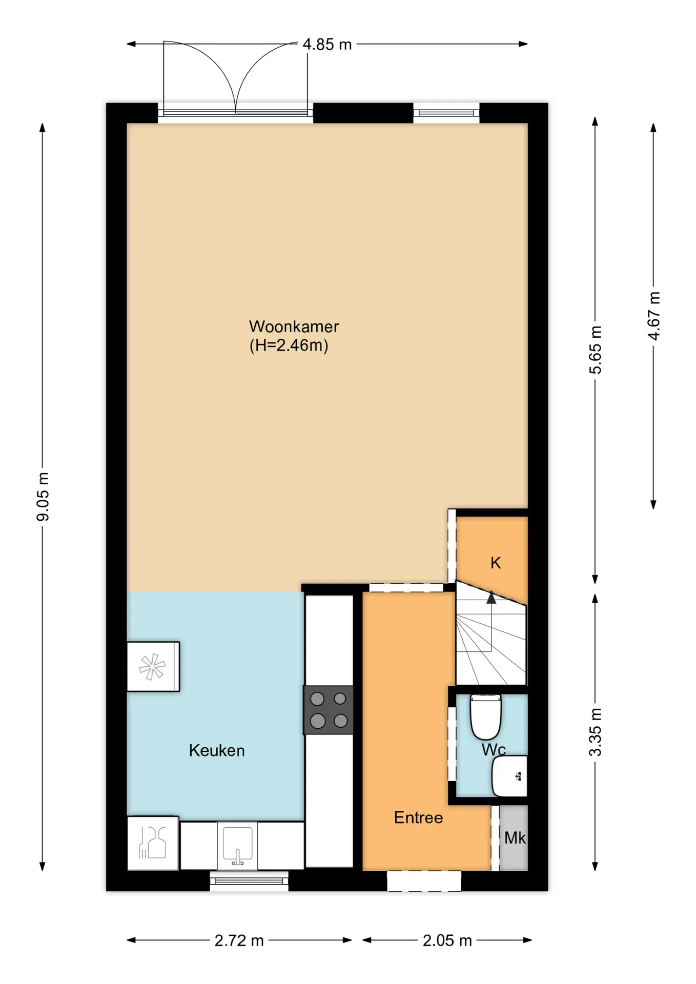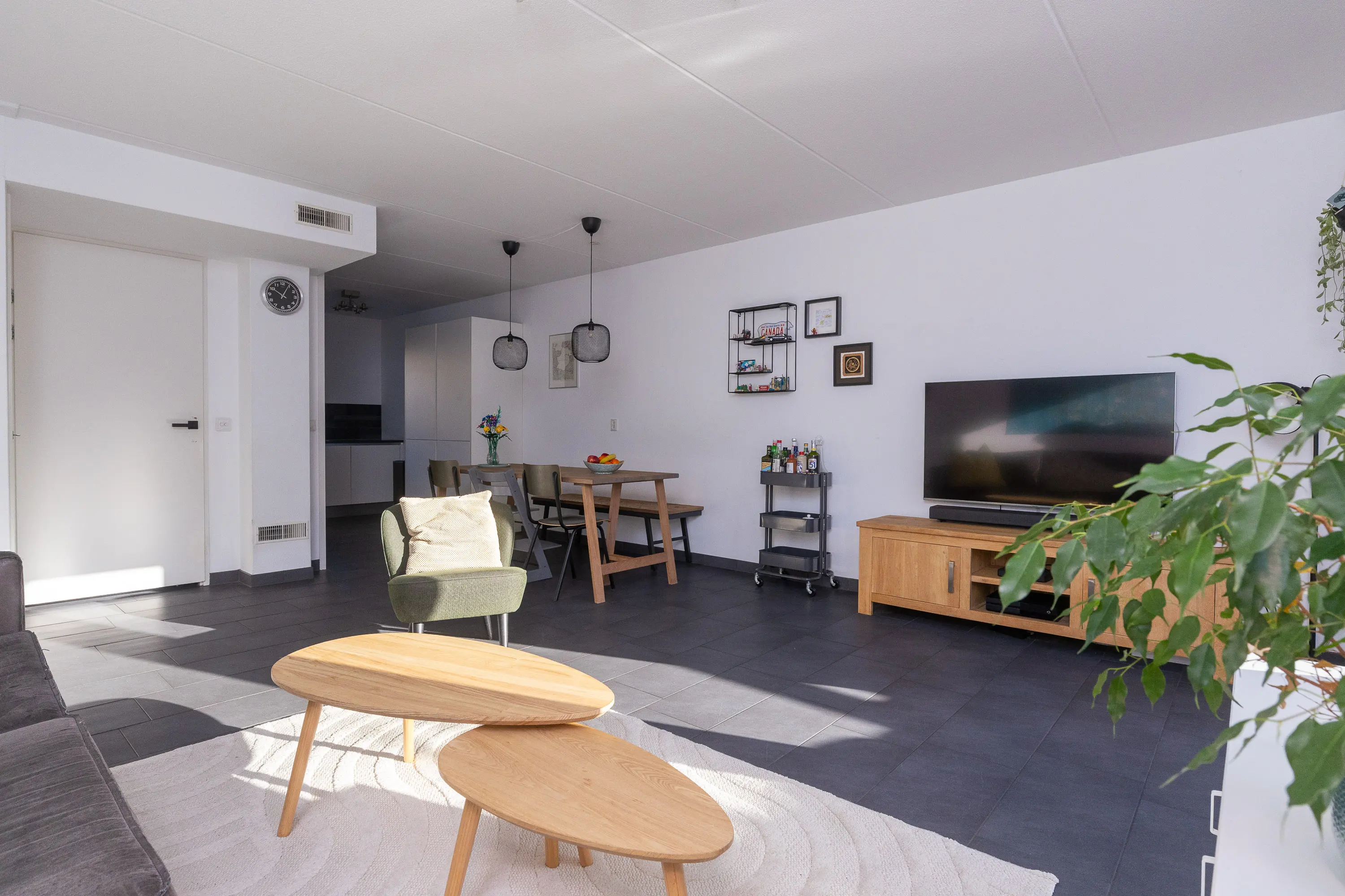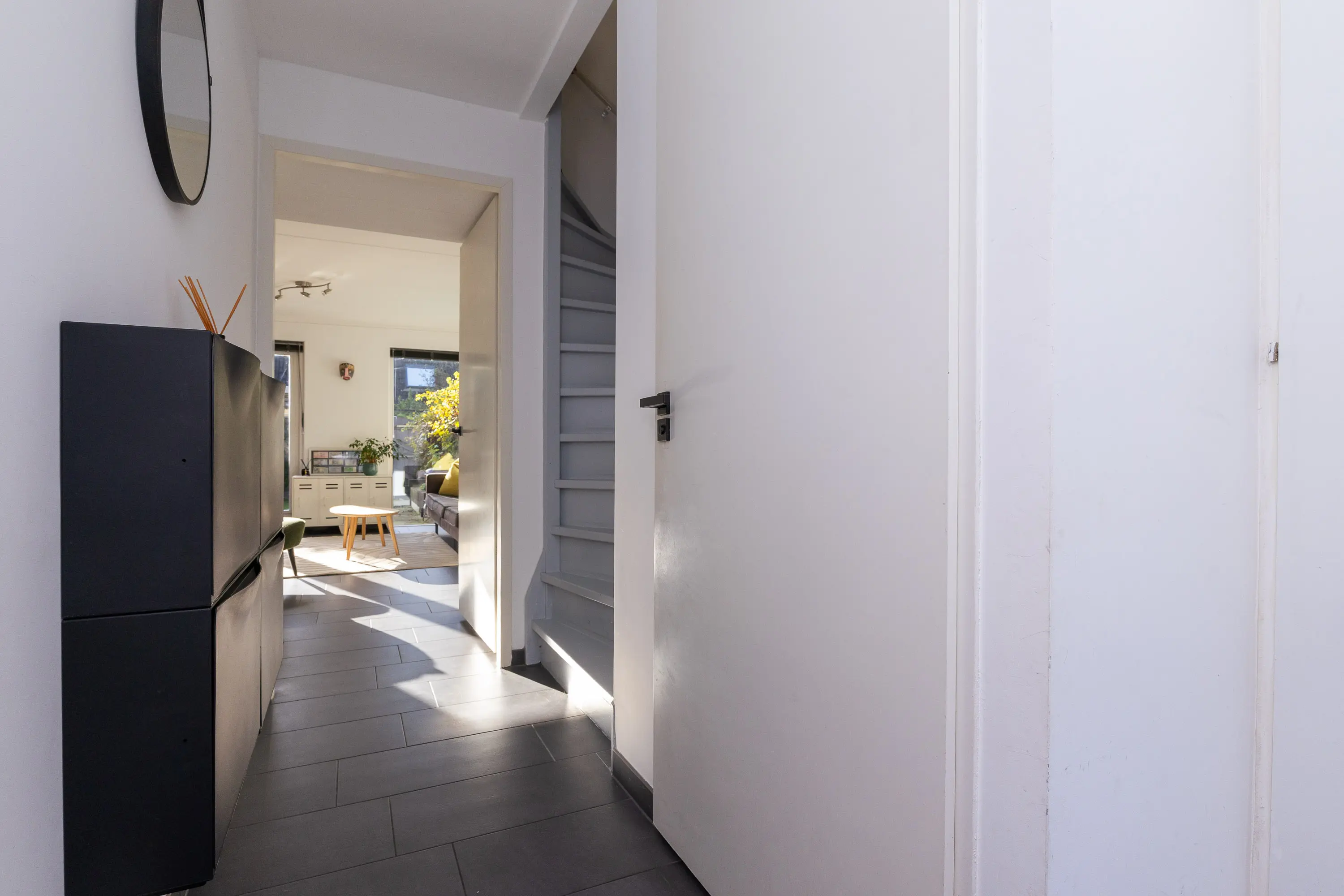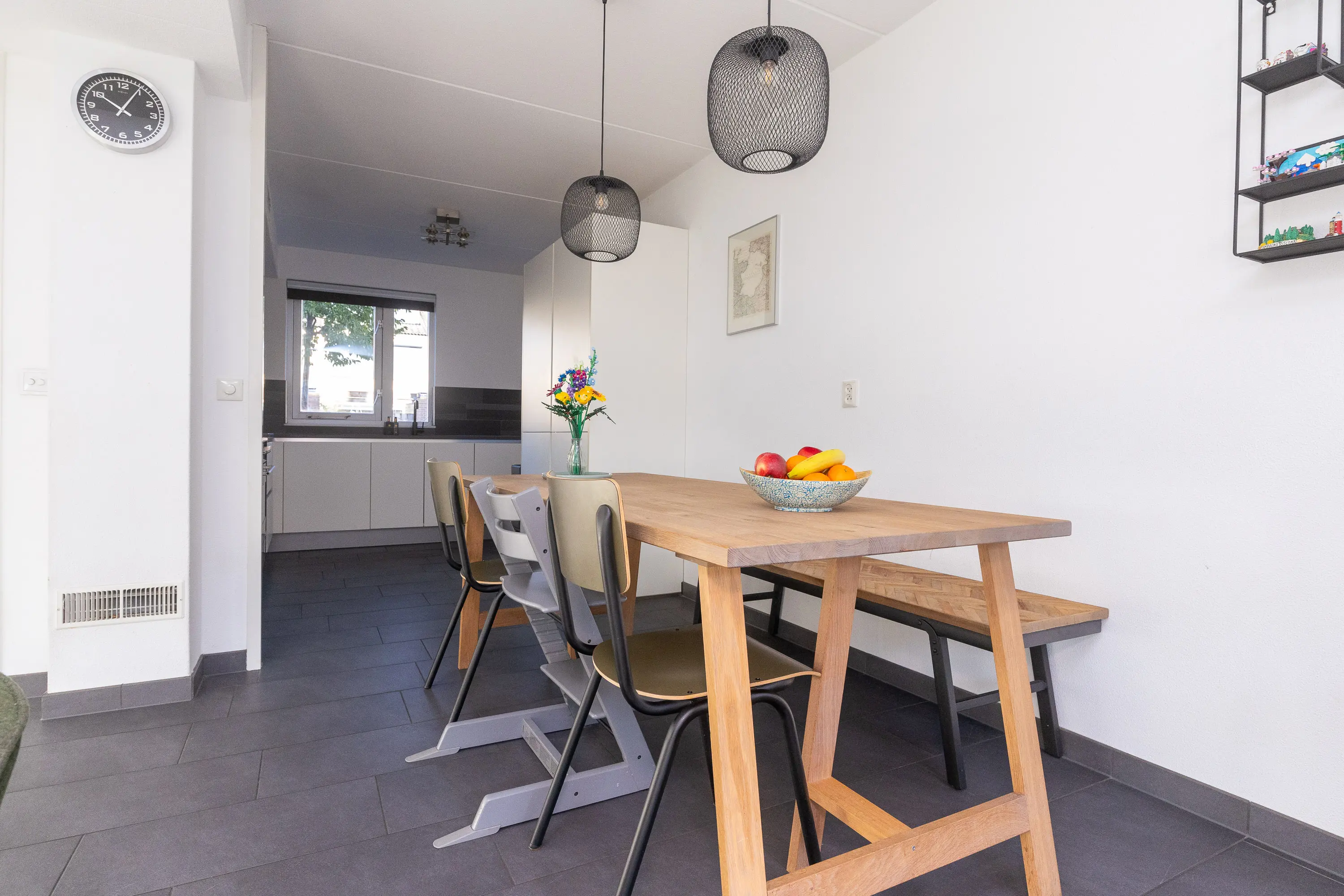 U wordt ontvangen in een nette entree met meterkast, het toilet, trapopgang en een deur naar de woonkamer. De lichte, tuingerichte woonkamer ligt op het zuidoosten en is voorzien van vloerverwarming, openslaande tuindeuren en een groot raam tot aan de vloer die zorgt voor een mooie lichtinval. Strakke wanden, een verzorgde afwerking en een praktische trapkast maken de ruimte helemaal compleet. Aan de voorzijde bevindt zich de open keuken, uitgevoerd met een luxe Smeg-oven met 6-pits gasfornuis, vaatwasser, koelkast, vriezer en afzuiging. De keuken beschikt over inbouwspots, een nette betegelde achterwand en voldoende bergruimte in de lades. Terwijl u kookt, kijkt u uit over de nette voortuin en de rustige straat.