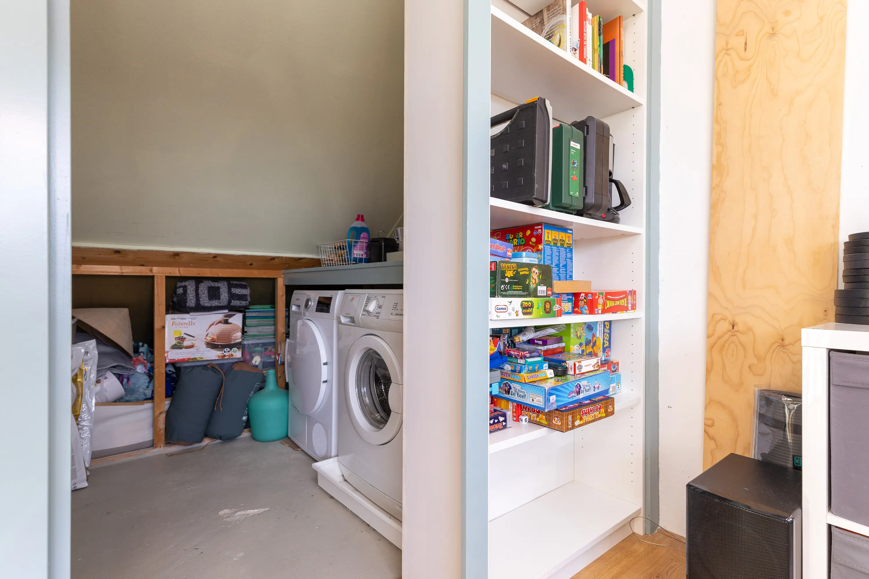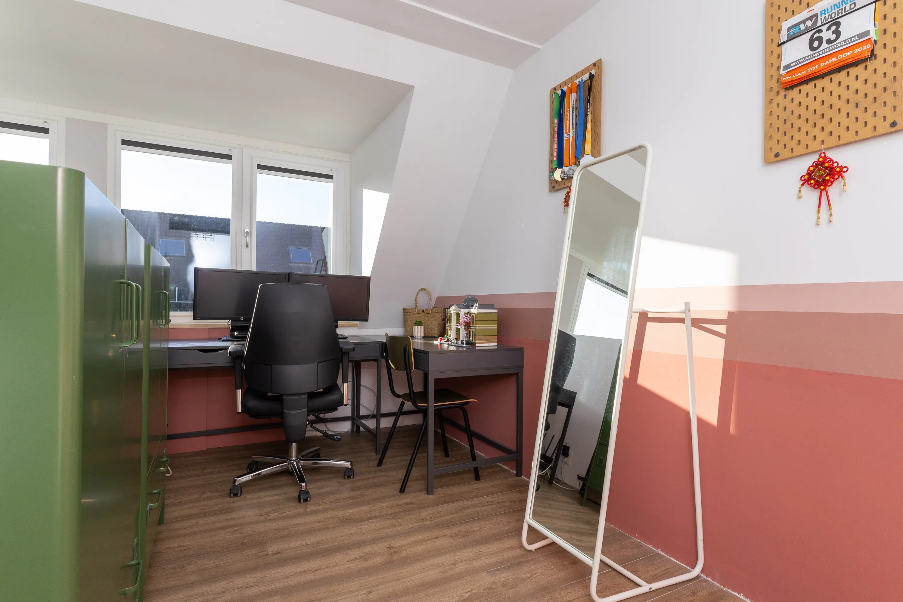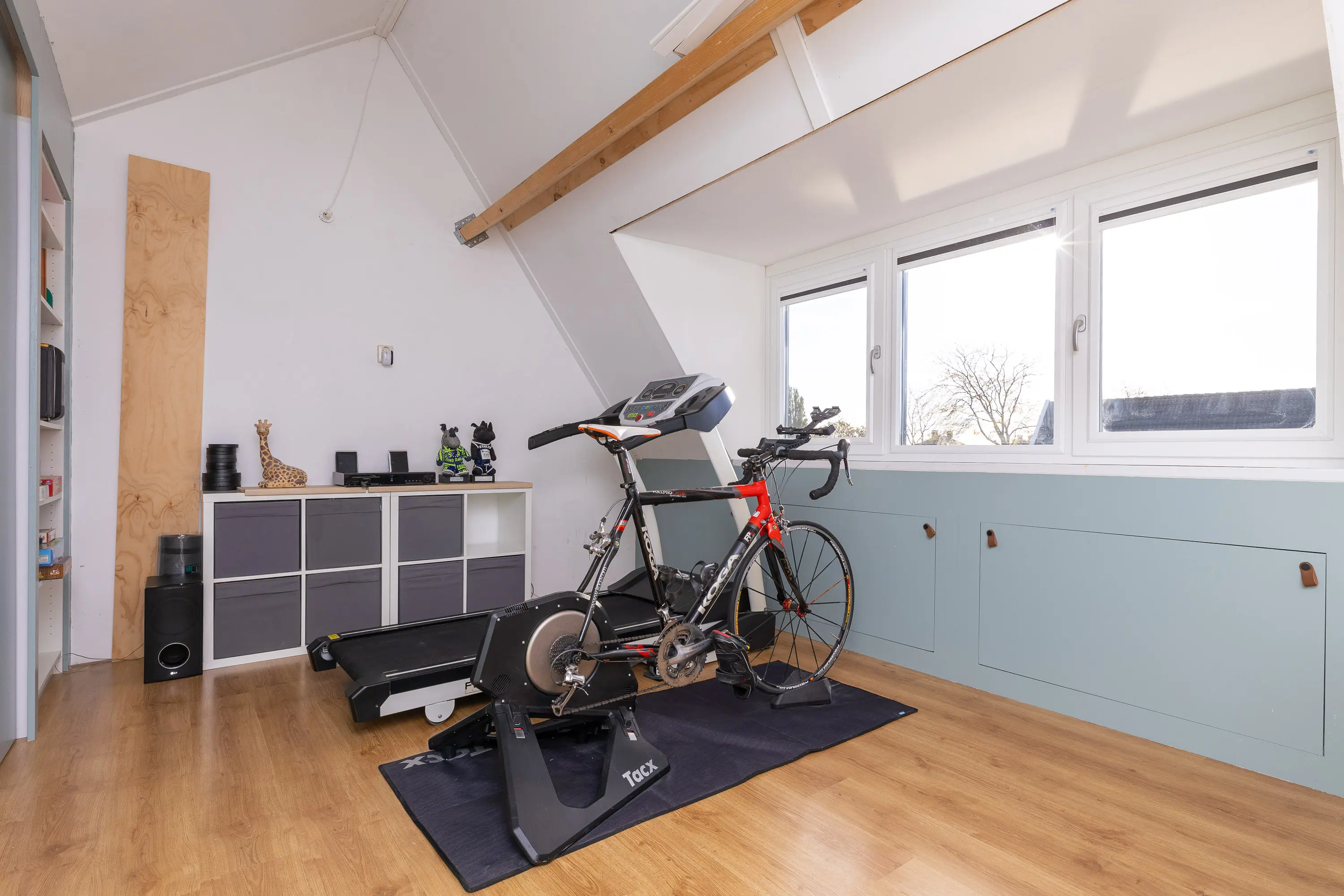 De tweede etage biedt volop mogelijkheden. Deze kamer, eveneens voorzien van een kunststof dakkapel (2021) op het zuidoosten, is perfect als extra slaapkamer, hobbyruimte thuiswerkplek óf sportkamer. De op maat gemaakte ombouwkasten verbergen op een slimme manier de installaties: de vernieuwde heteluchtverwarming (2022), de WTW-unit (2022), de cv-ketel (2022) en de mechanische ventilatie (2022). Ook de witgoedaansluitingen zijn hier keurig weggewerkt. In de nok bevindt zich extra bergruimte/vliering wat ideaal is voor seizoensspullen of andere opslag. Langs de wanden zijn bovendien extra kasten geplaatst, zodat er geen ruimte onbenut blijft.