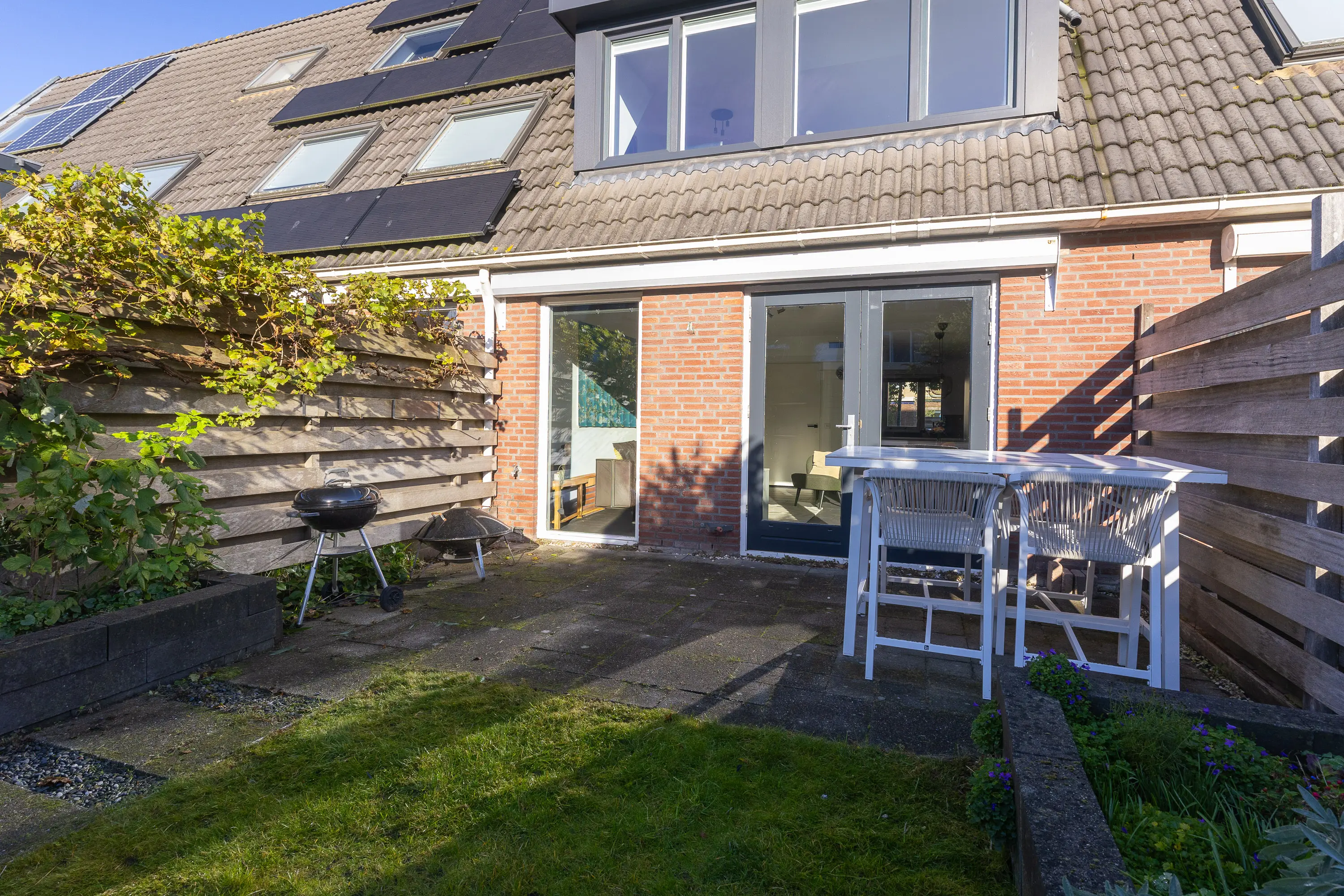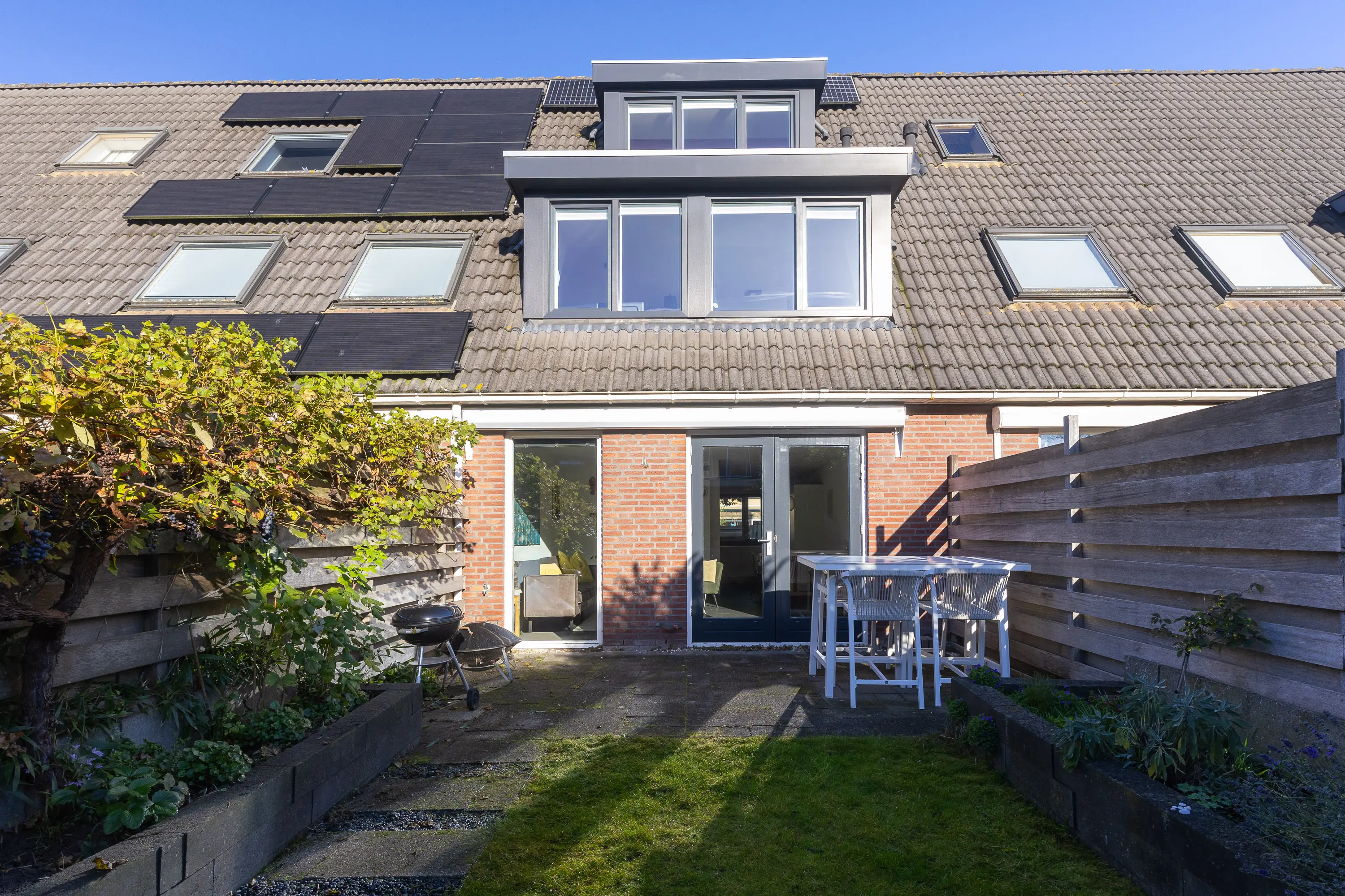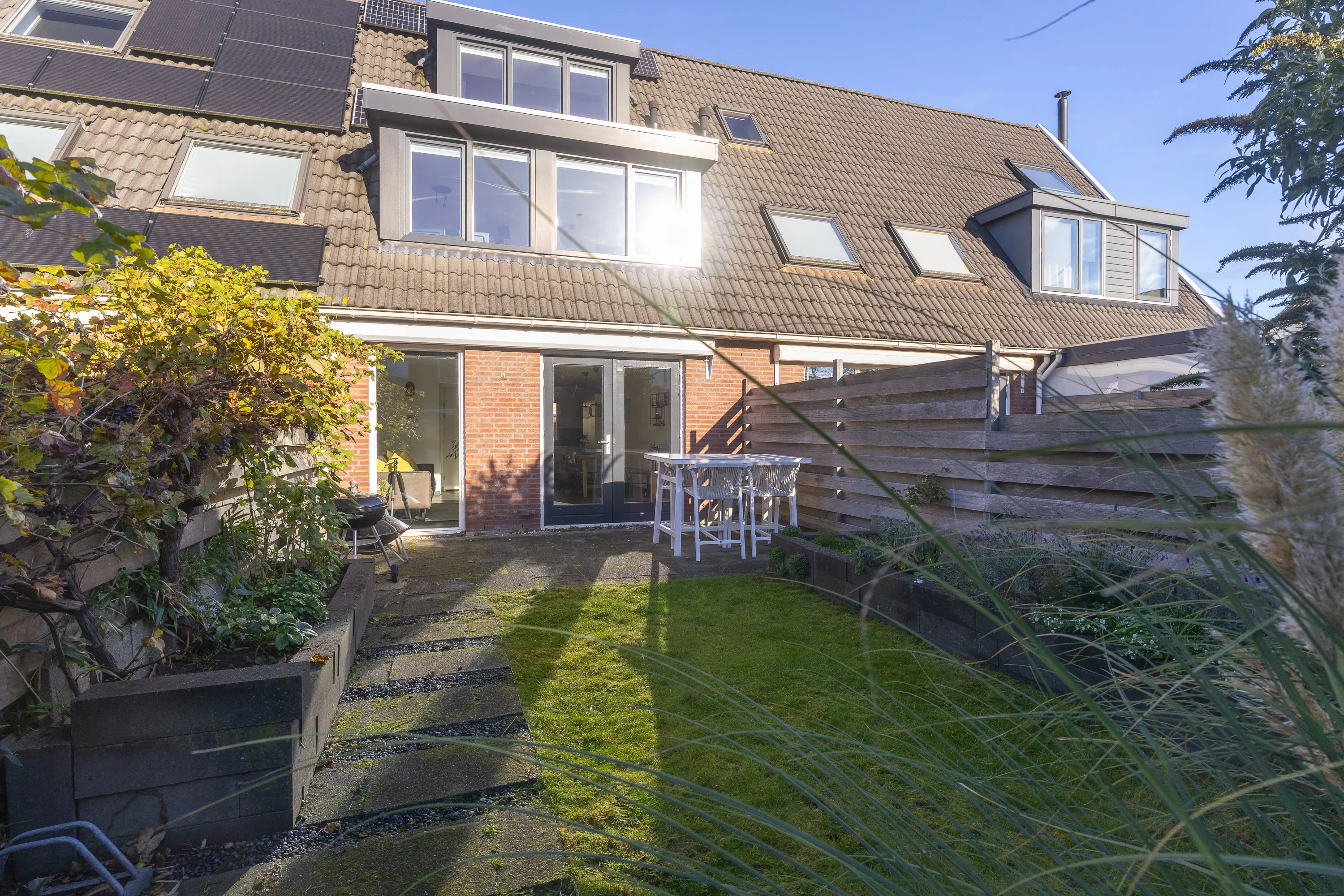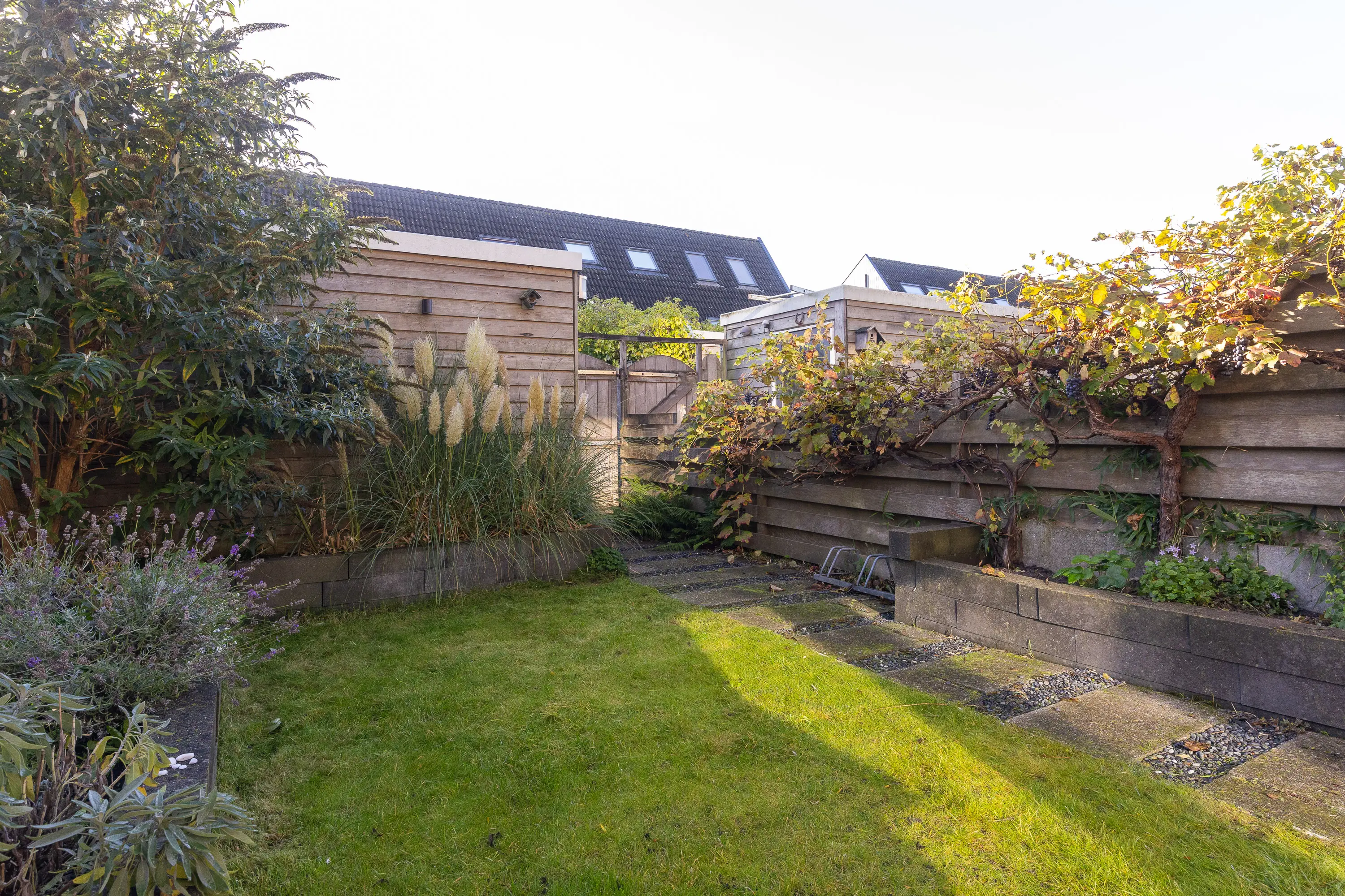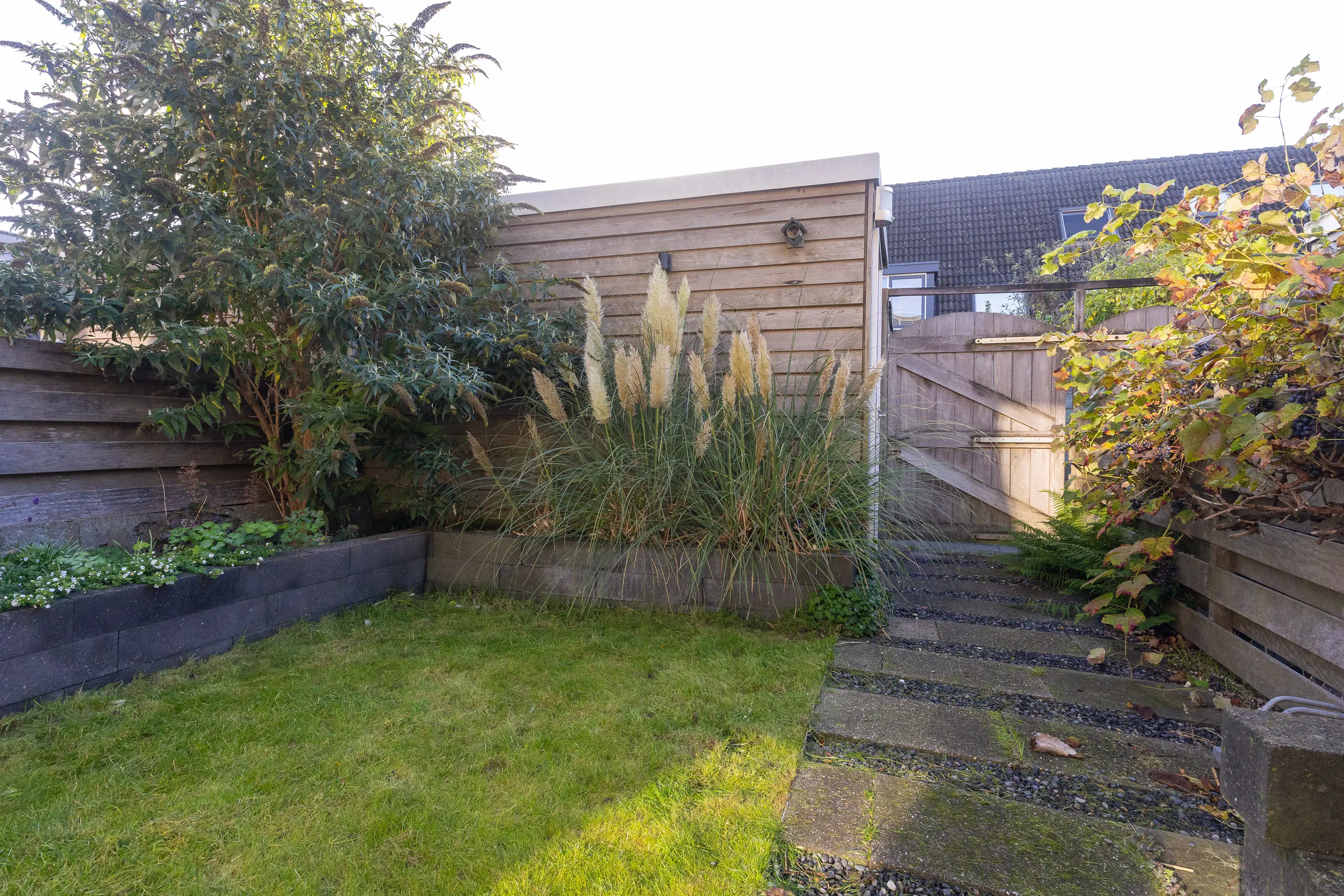 De zonnige achtertuin ligt op het zuidoosten en is een heerlijke plek om te genieten van het buitenleven. De tuin is verzorgd aangelegd met groen, borders, planten en kleine bomen. Achterin bevindt zich een vrijstaande houten berging en er is een achterom met een brede poort, groot genoeg als doorgang van bijvoorbeeld een motor. Het recente onderhoud waaronder schilderwerk in 2022 en 2024 zorgen ervoor dat ook de buitenzijde van de woning in goede conditie verkeert.