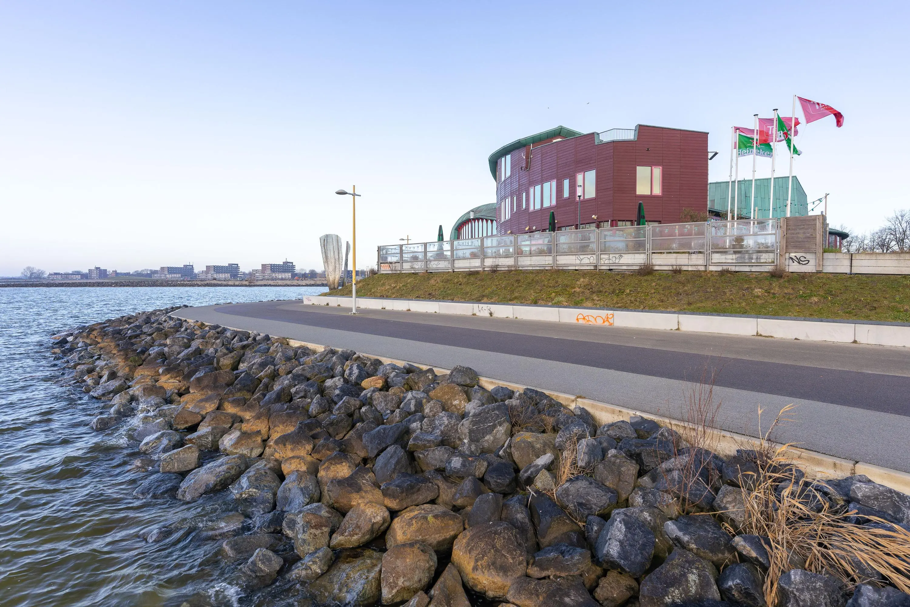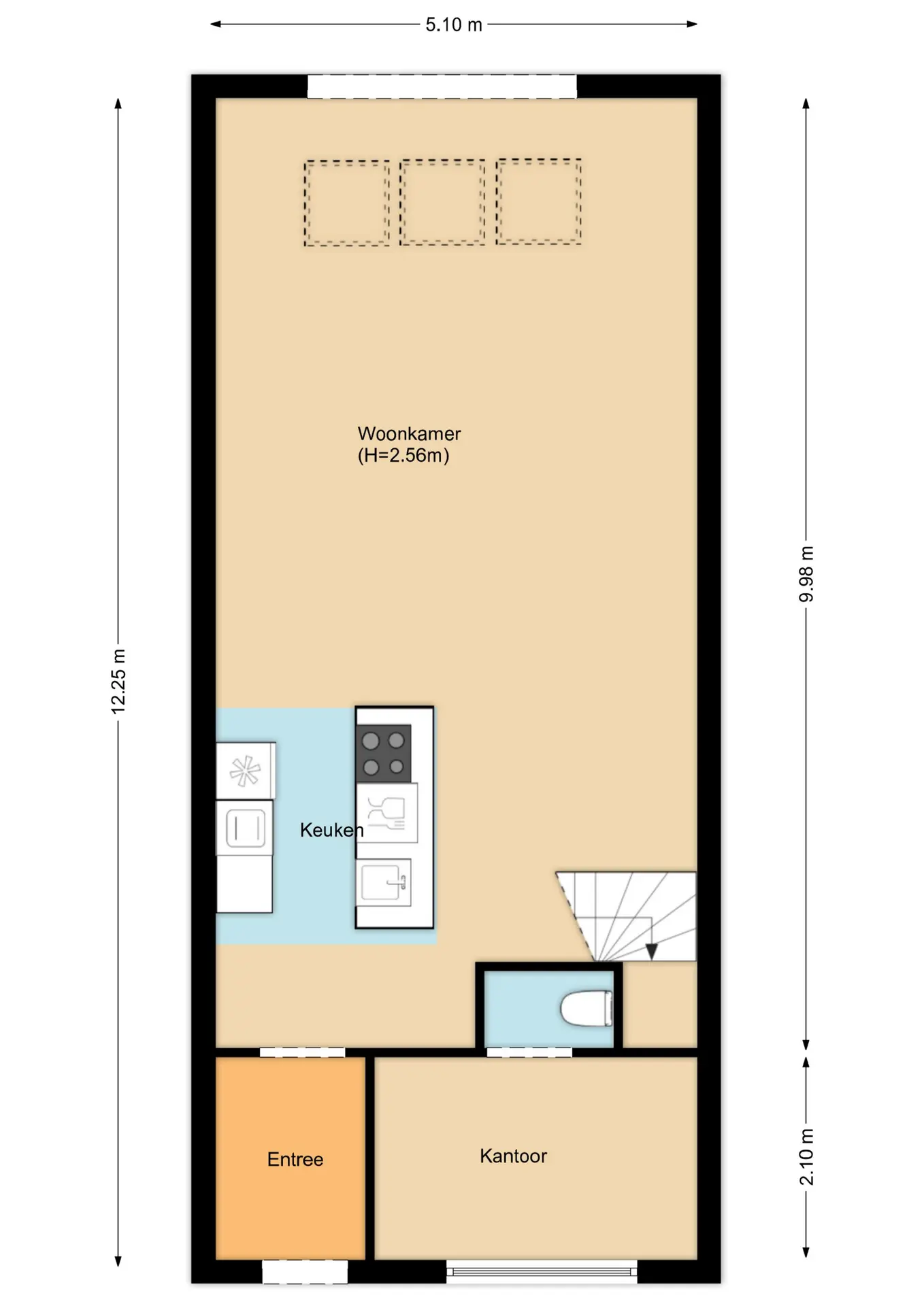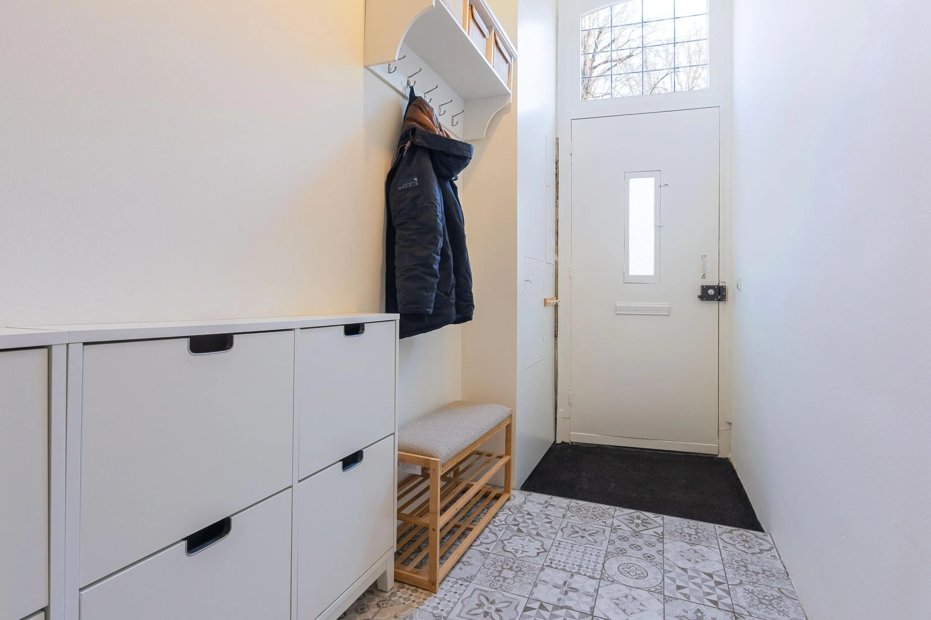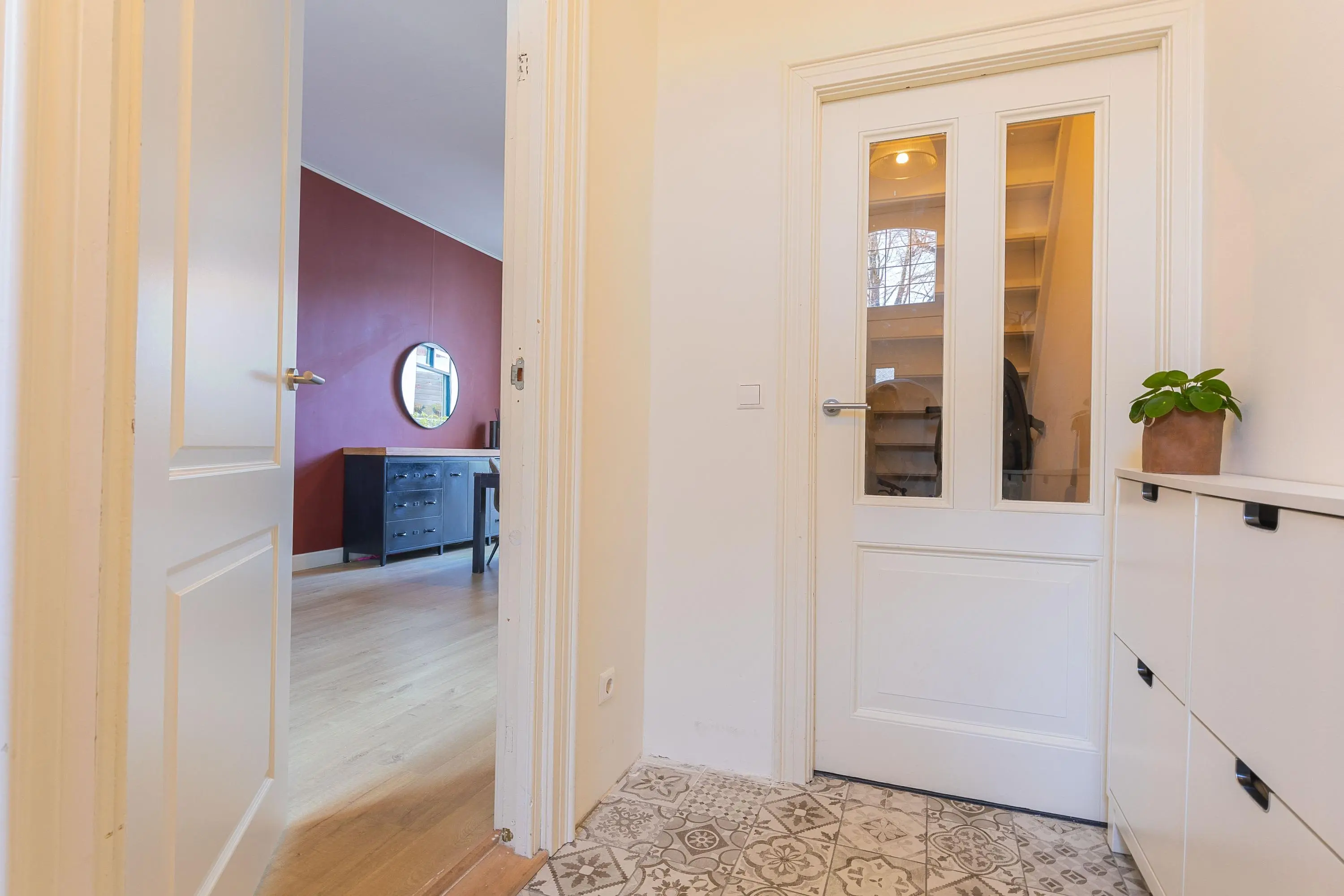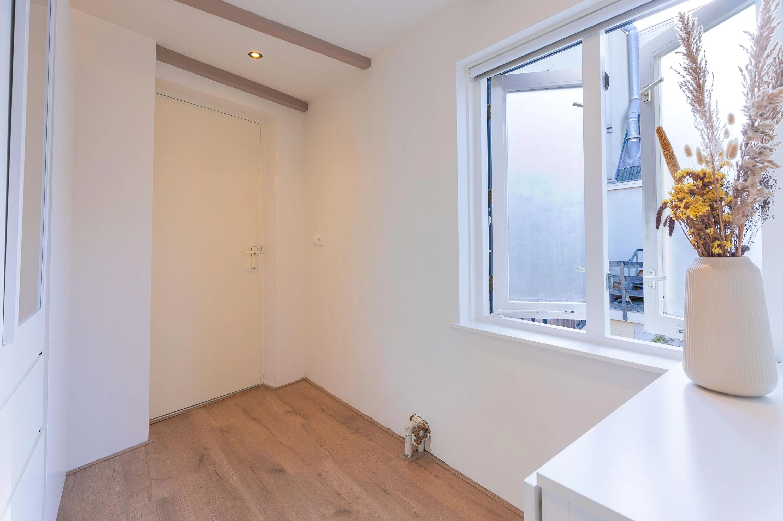 De entree met karaktervolle tegelvloer en praktische fietsenberging geeft direct een verzorgde eerste indruk. De woonkamer voelt bijzonder ruimtelijk aan dankzij het prachtige hoge plafond en de royale lichtinval. De combinatie van strakke wanden, laminaatvloer en vloerverwarming zorgt voor een comfortabele en sfeervolle leefruimte.