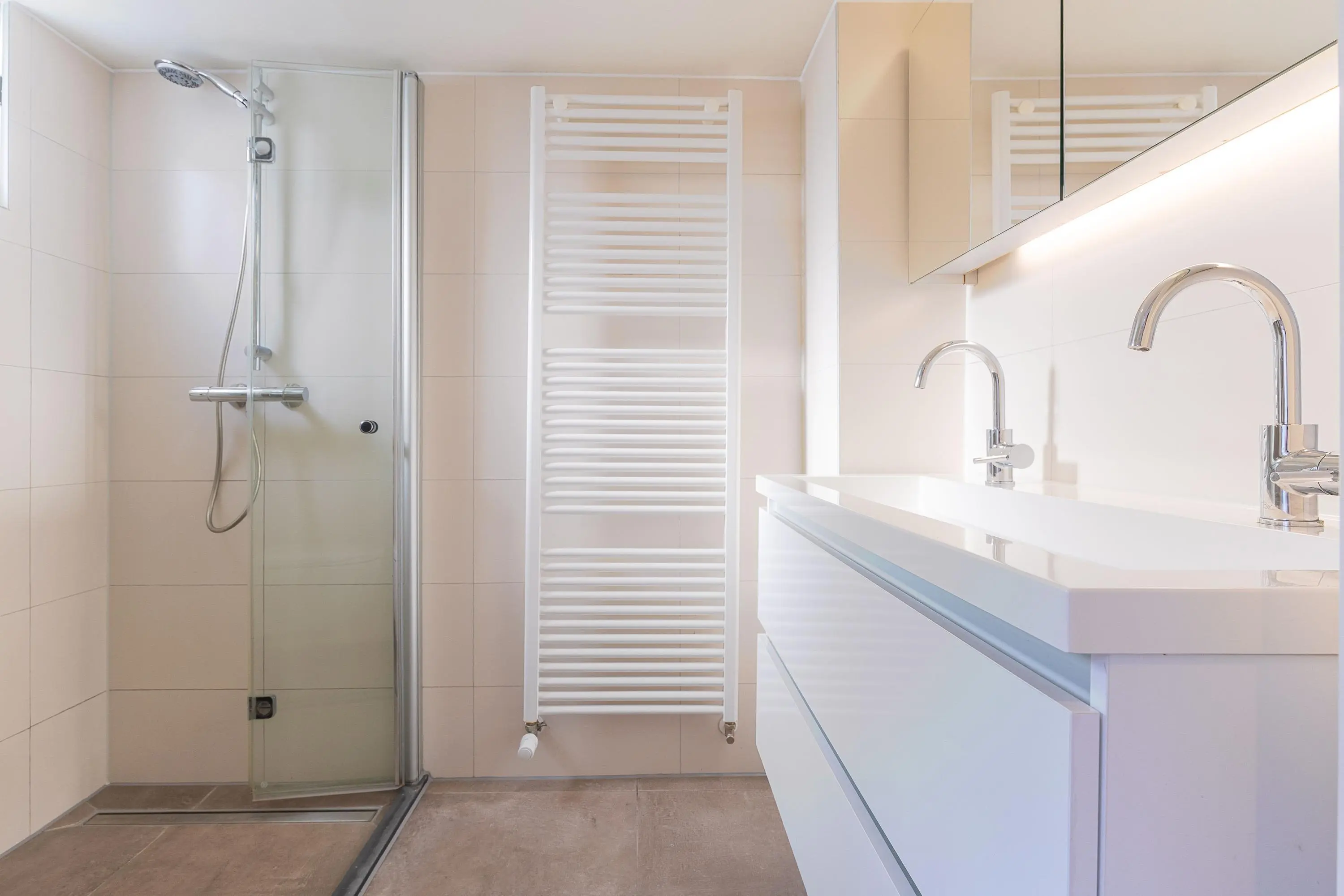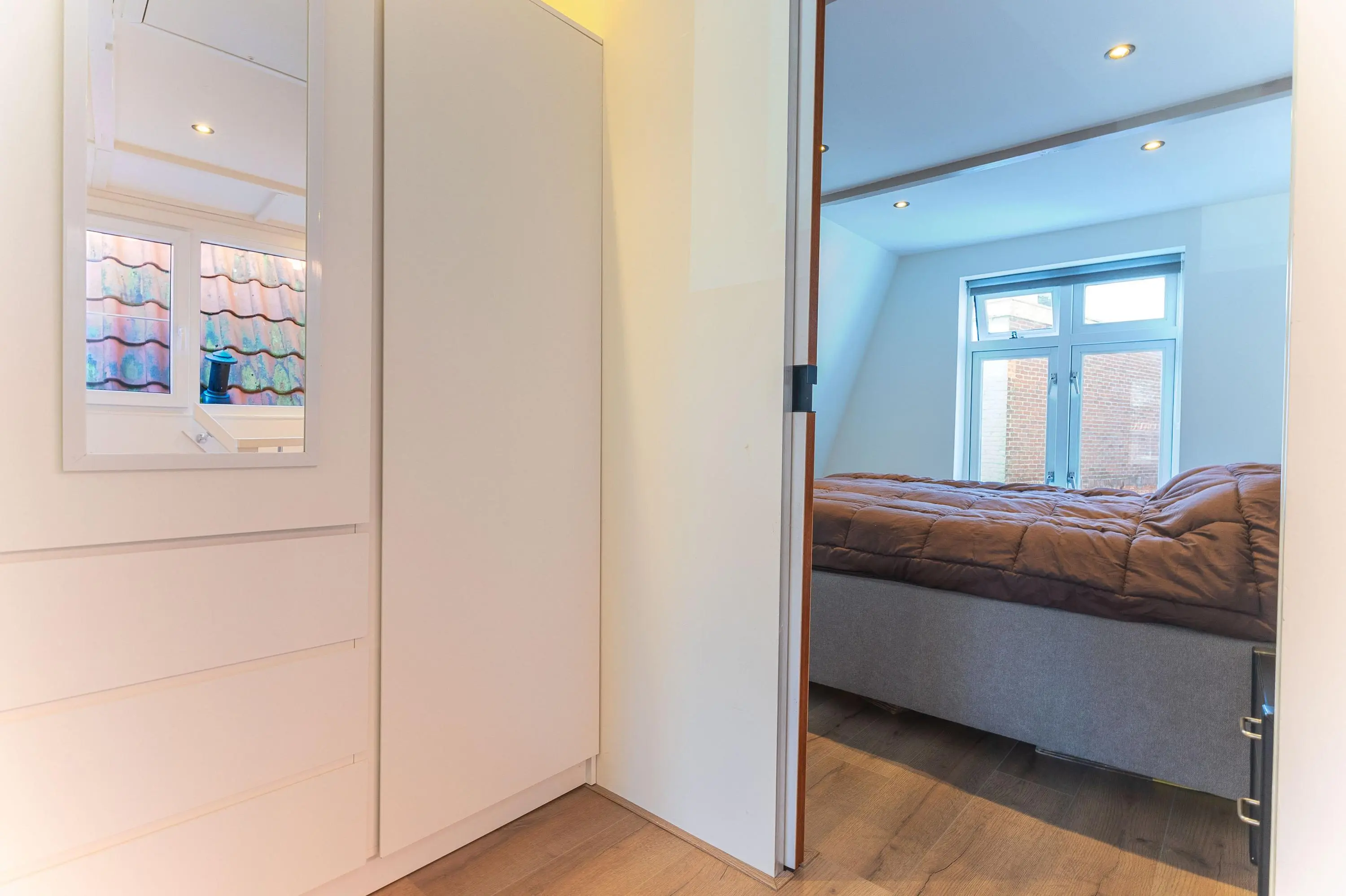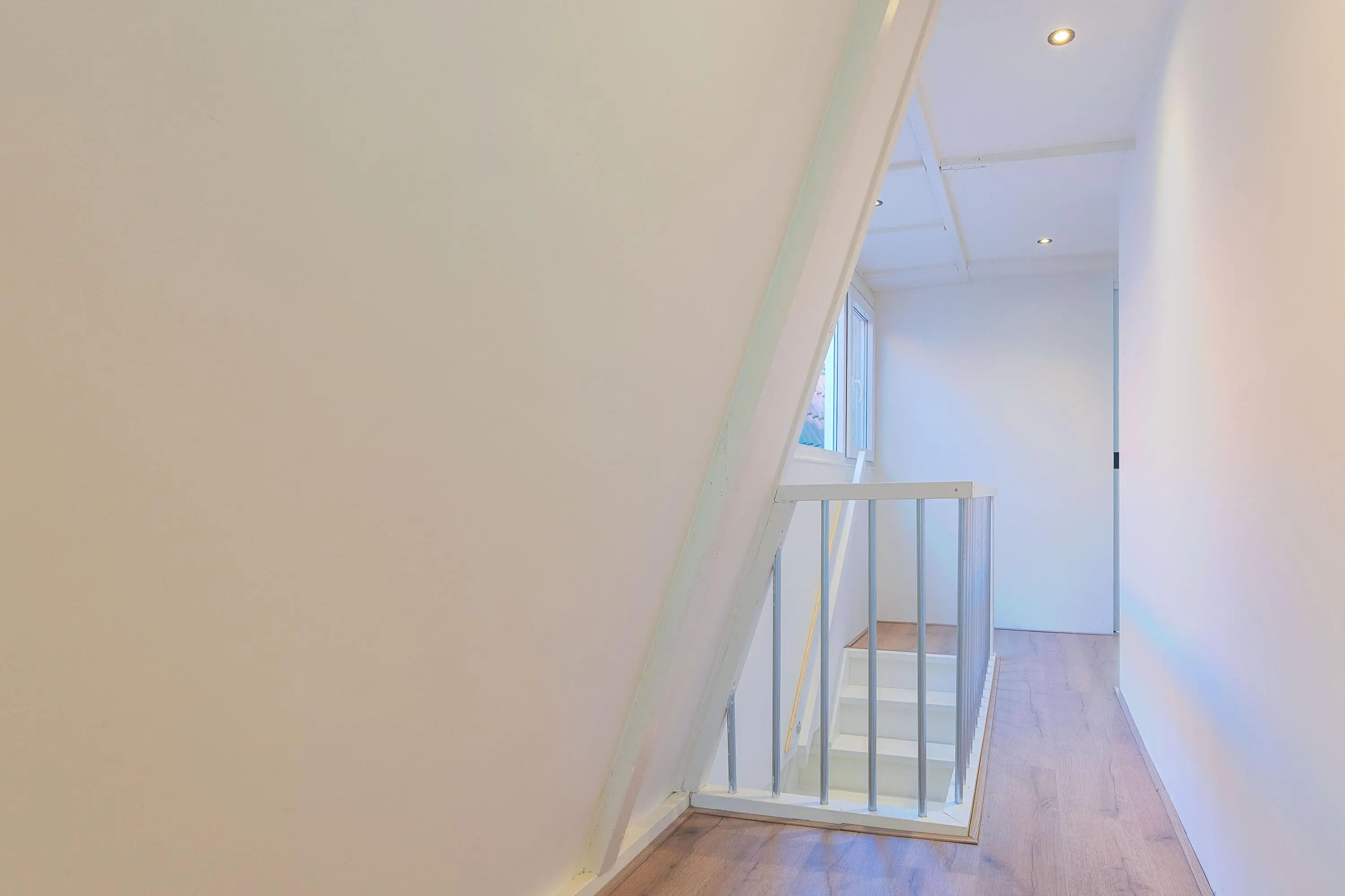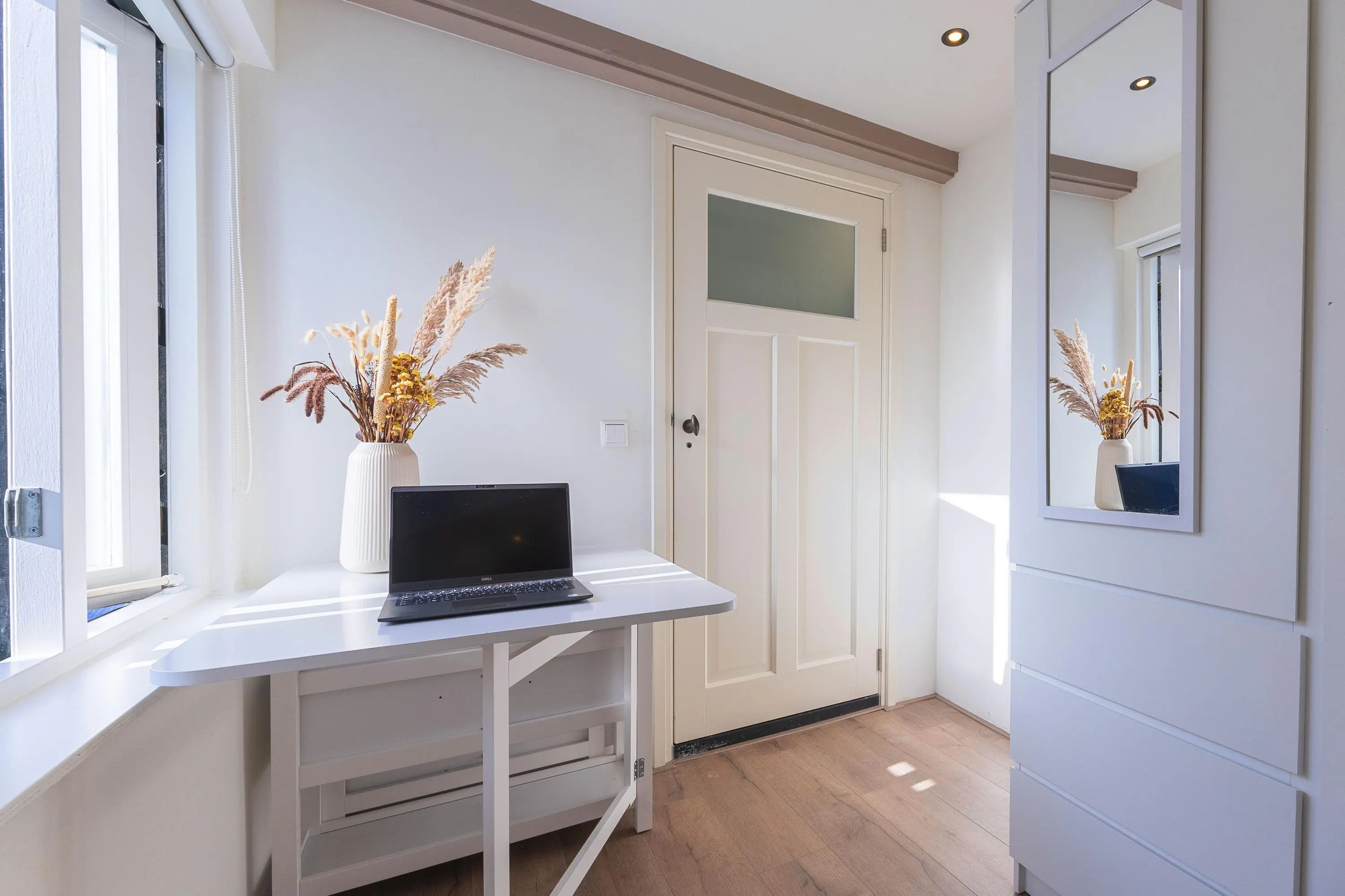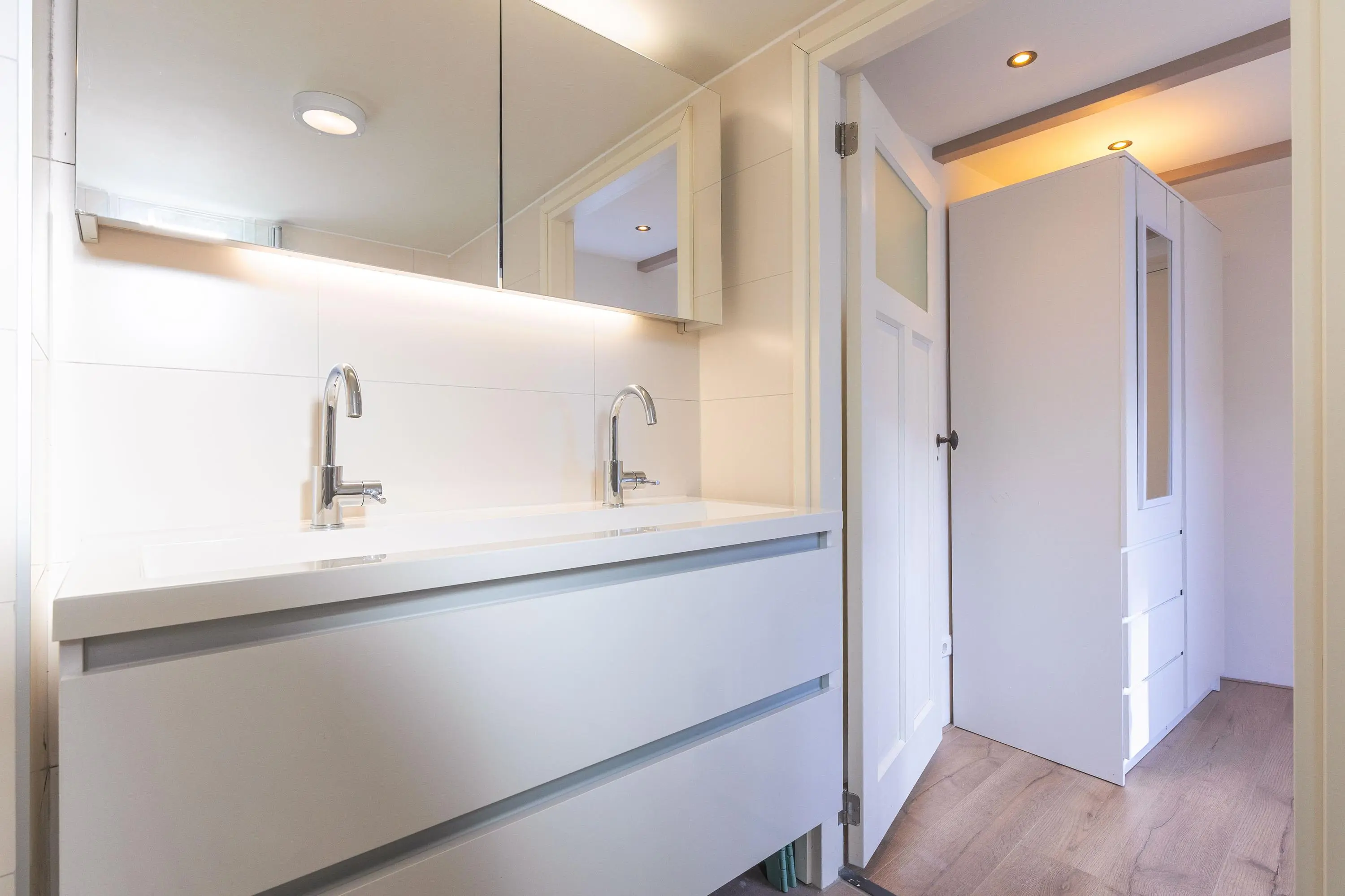 Daarnaast bevindt zich op deze verdieping een separate kantoorruimte, ideaal voor thuiswerken. De badkamer is compleet uitgevoerd met een douche, tweede toilet en een dubbele wastafel met meubel.