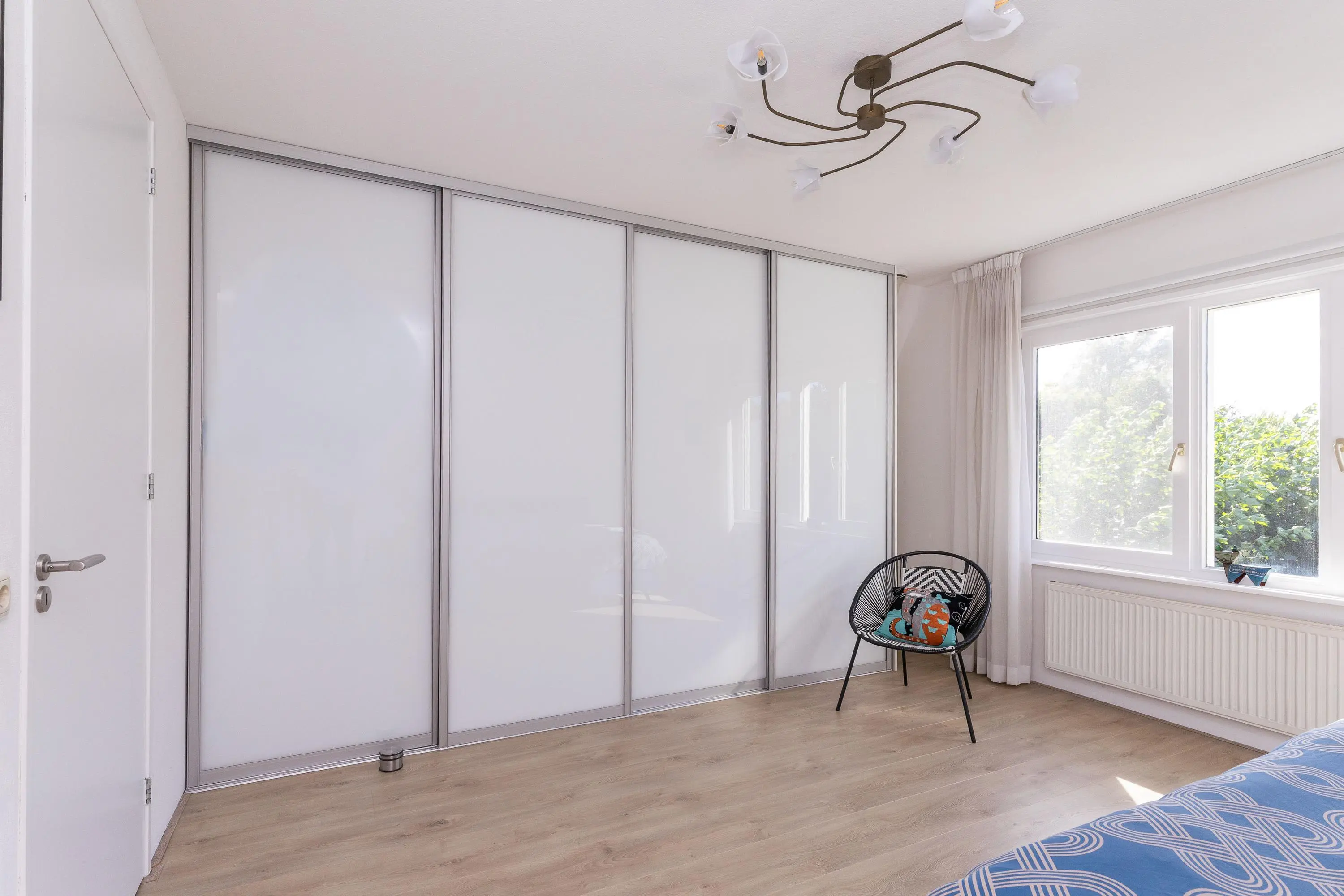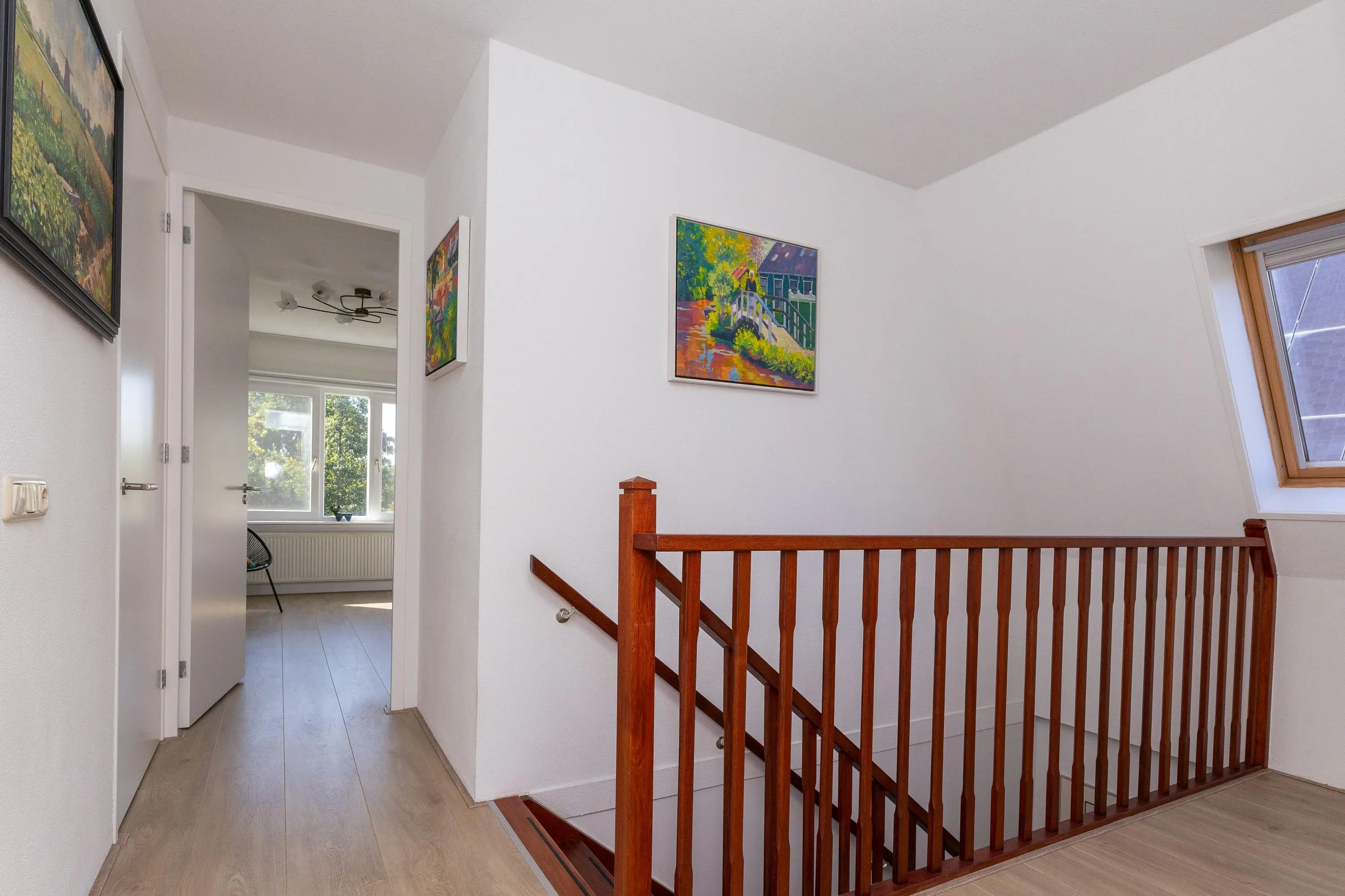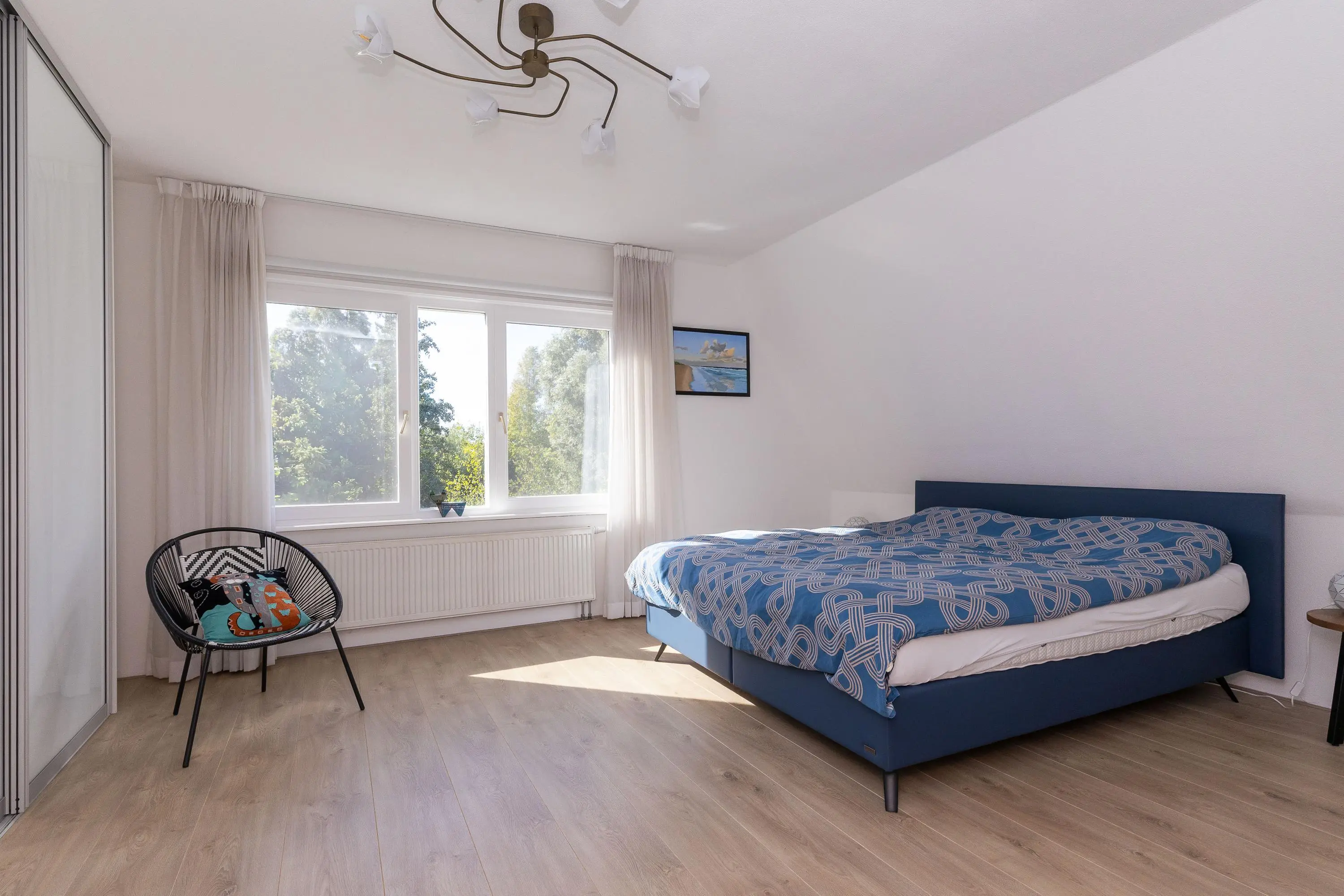 Ruime overloop met trap naar de 2e verdieping, toegang tot een ruime slaapkamer aan de voorzijde, badkamer met een hangcloset, wastafelmeubel, ligbad en een douchehoek, bergkast en een grote slaapkamer aan de achterzijde met een vaste kast en een inloopkast. Beide slaapkamers zijn erg ruim over de volledige breedte van de woning.