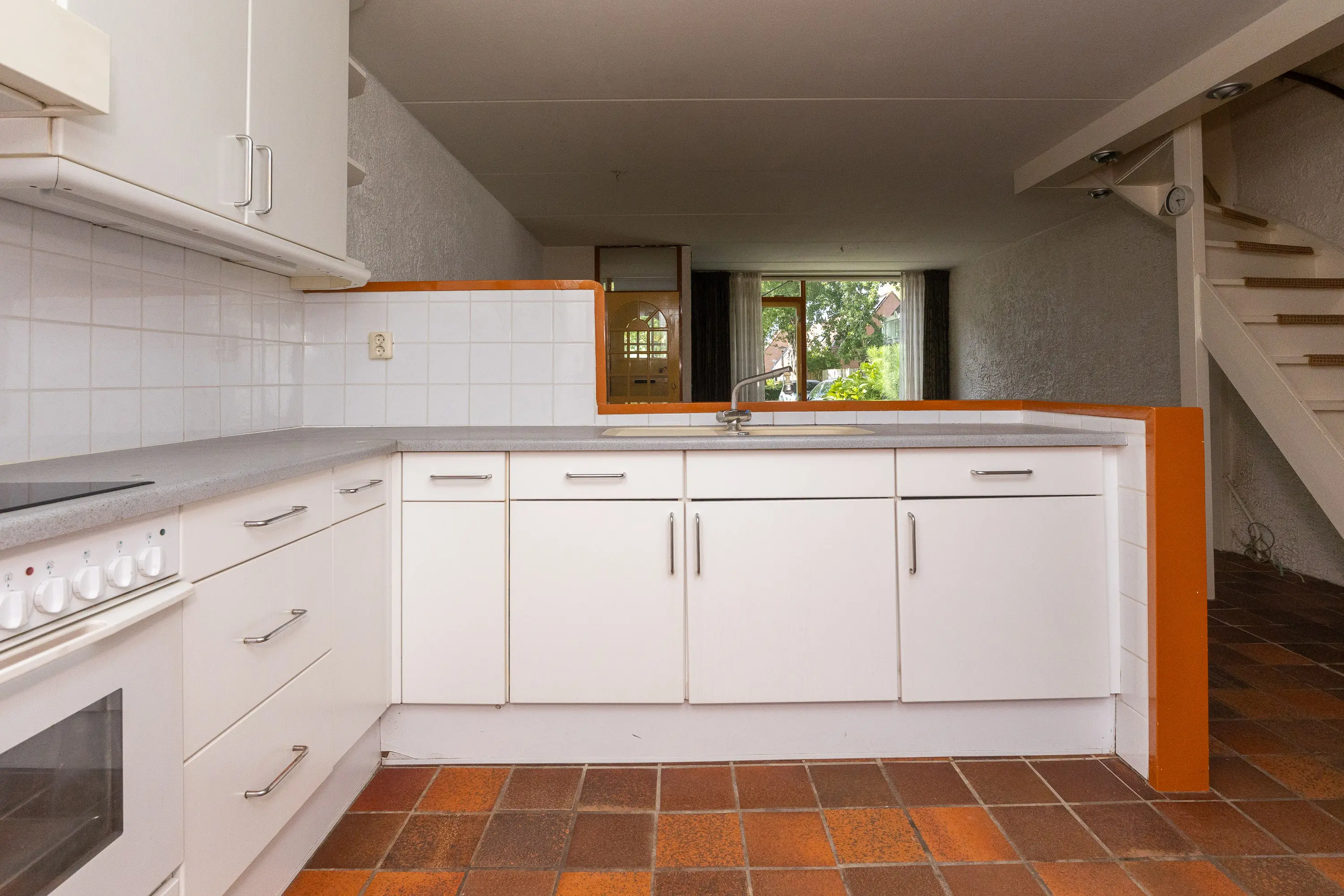 Via de hal bereik je de royale living met open keuken. Dankzij de grote raampartijen geniet je hier van veel lichtinval en een ruimtelijk gevoel. Aangrenzend aan de woning bevindt zich een ruime bijkeuken met toegang tot de tuin. In de tuin is ook nog een opberg ruimte gecreëerd, de tuin is tevens via een eigen poort aan de achterzijde bereikbaar
