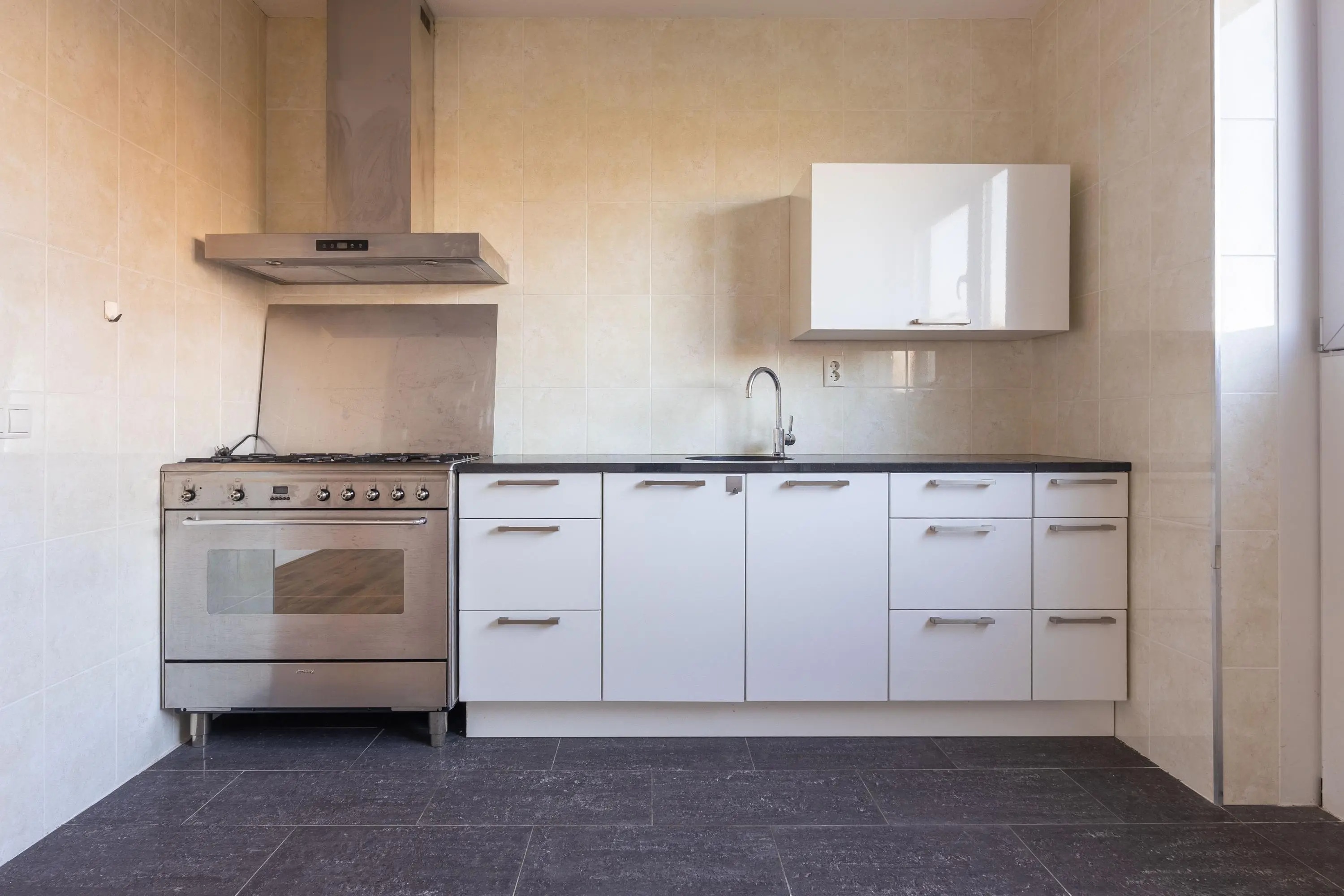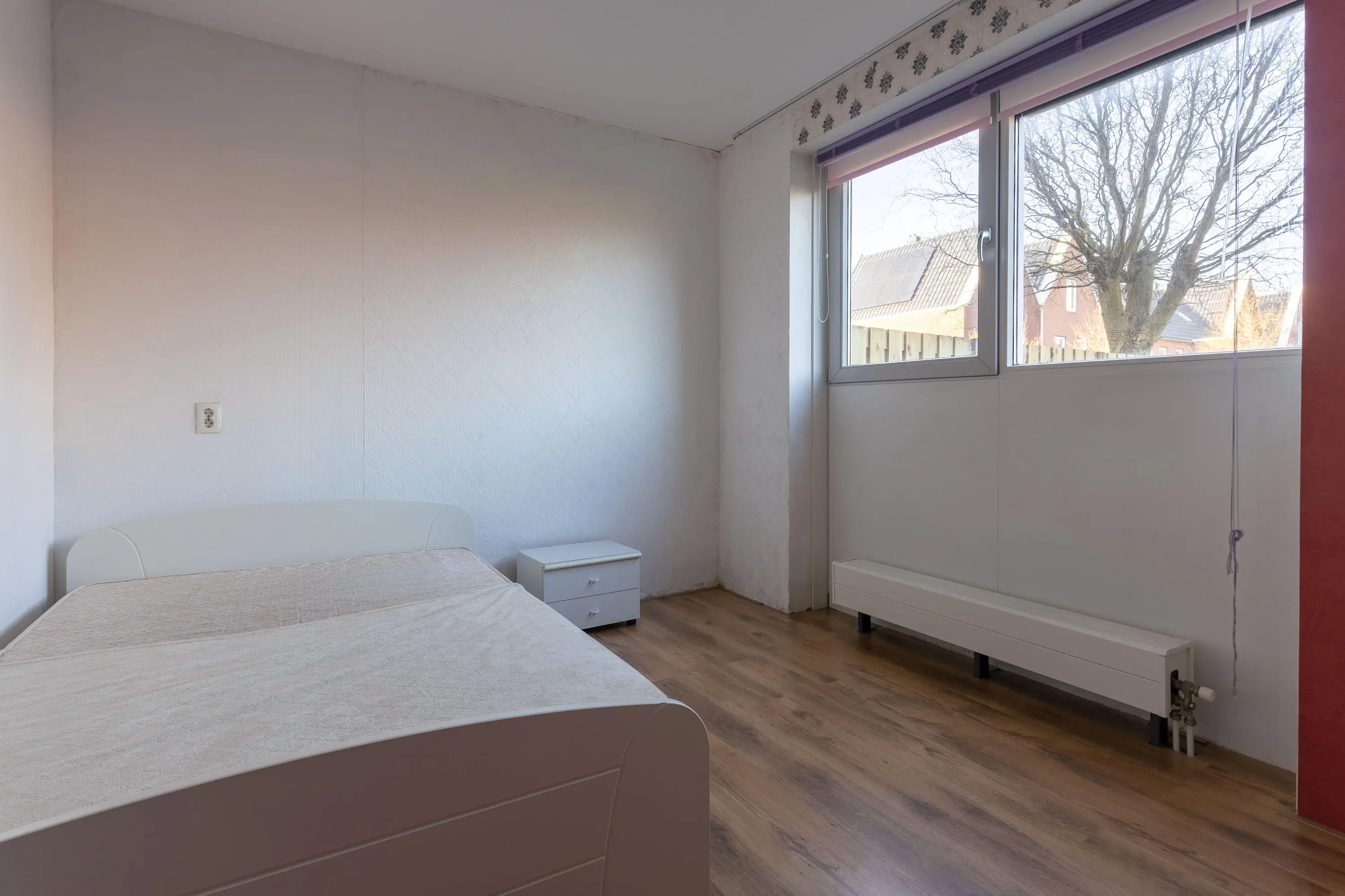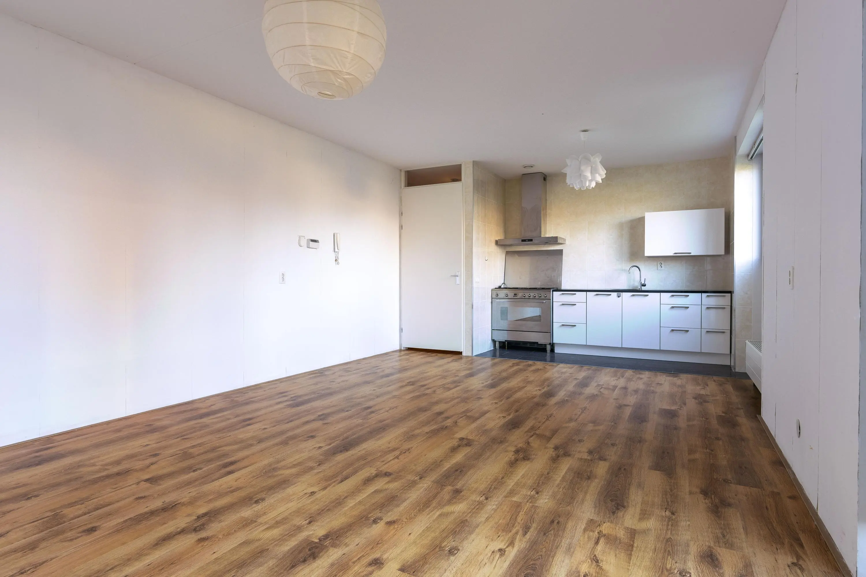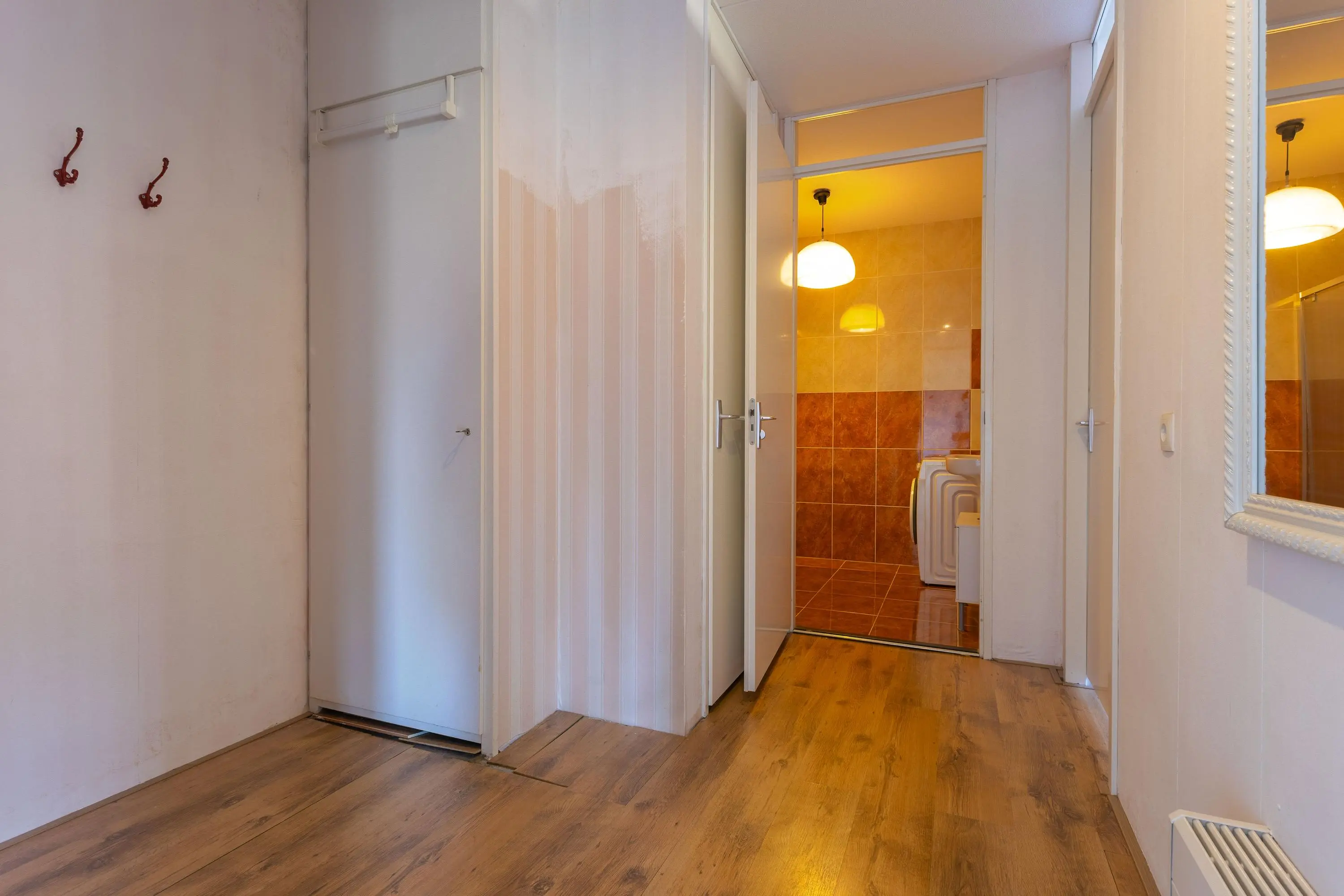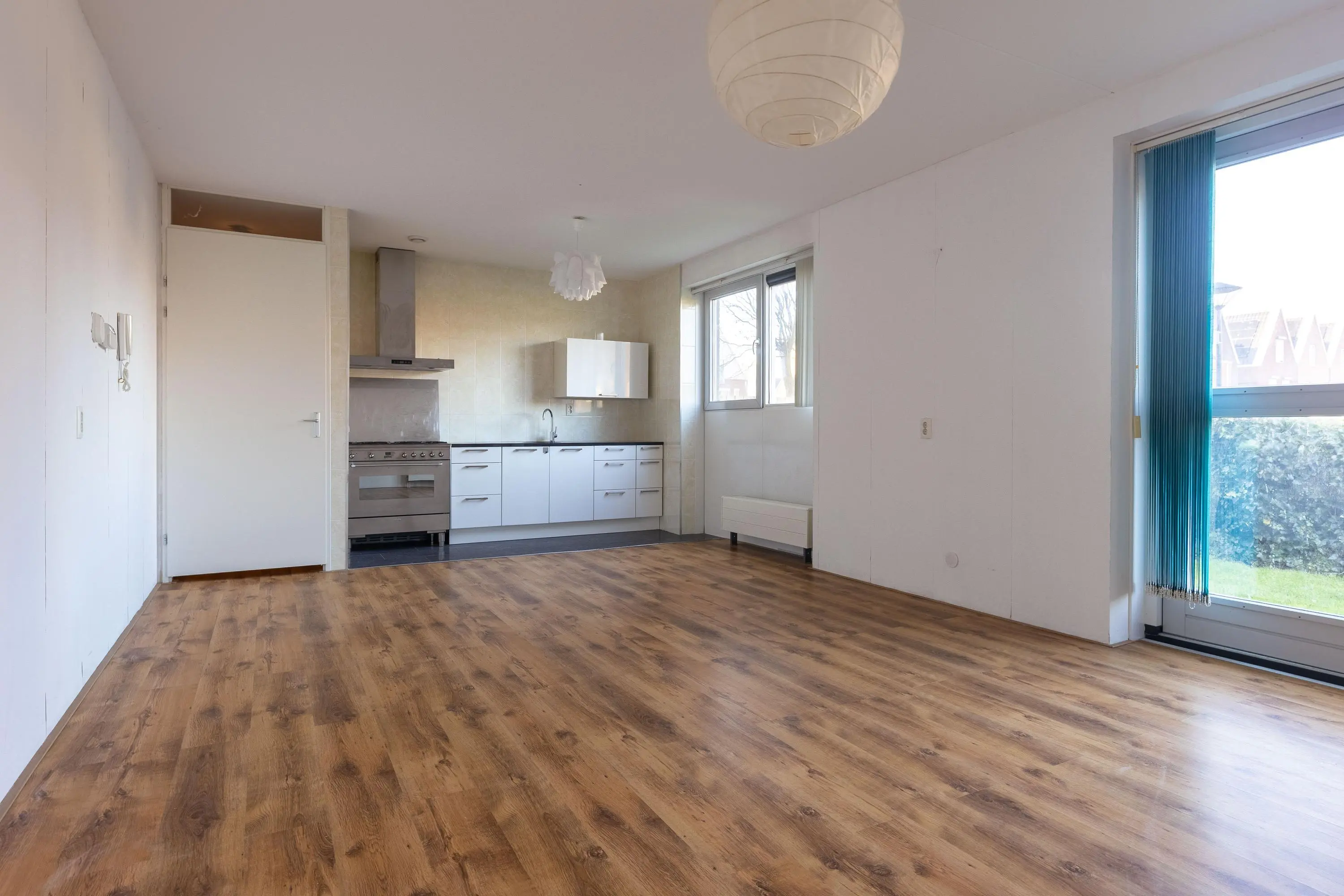 Entree, hal, meterkast, bergkast met opstelling van de C.V. ketel (2008), netjes betegelde badkamer met douche, toilet, wastafel en aansluiting voor de wasmachine, ruime slaapkamer, lichte woonkamer met openslaande deuren naar de tuin, open keuken in rechte opstelling met een 5-pits gaskookplaat en oven, afzuigkap.