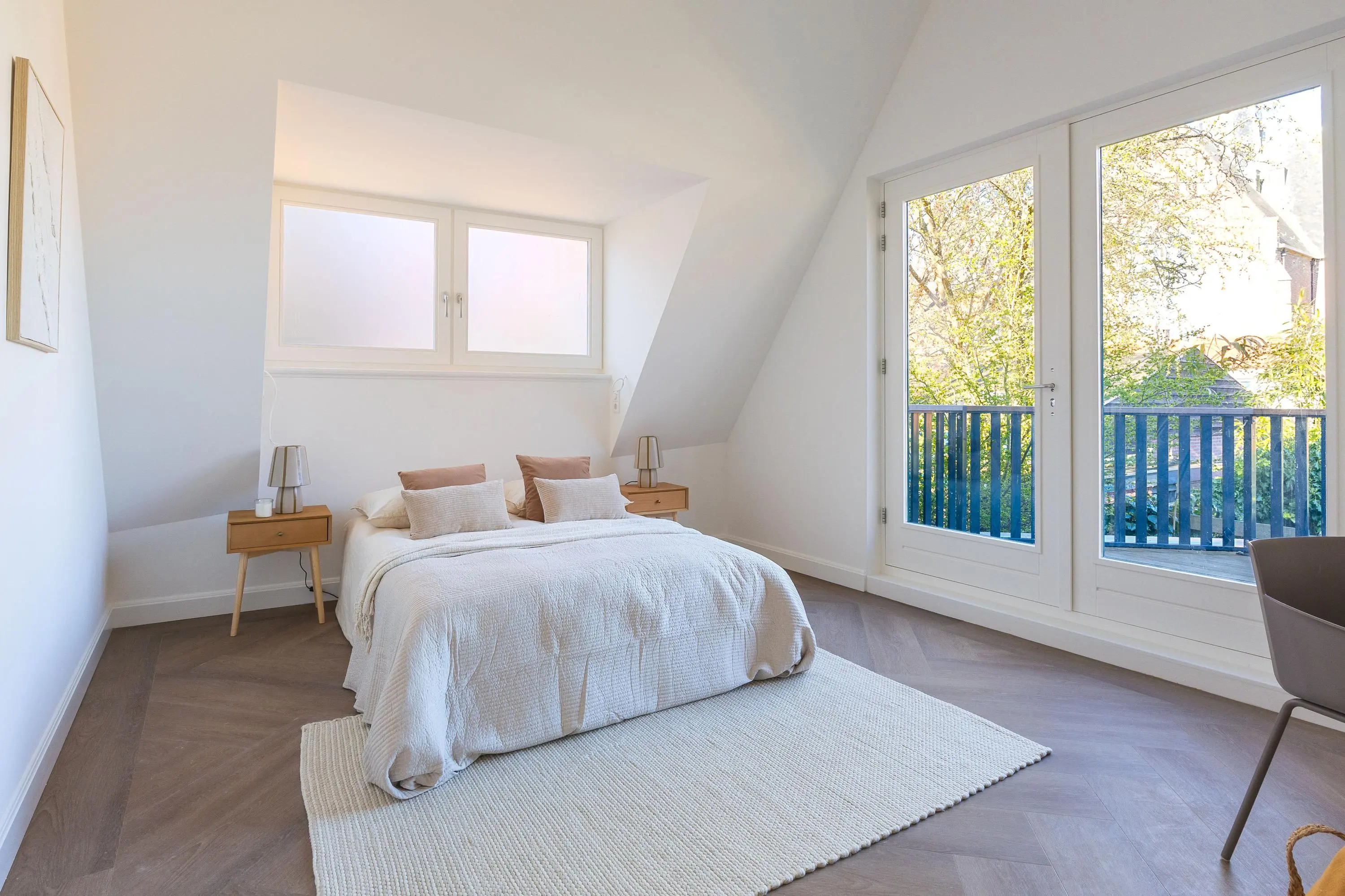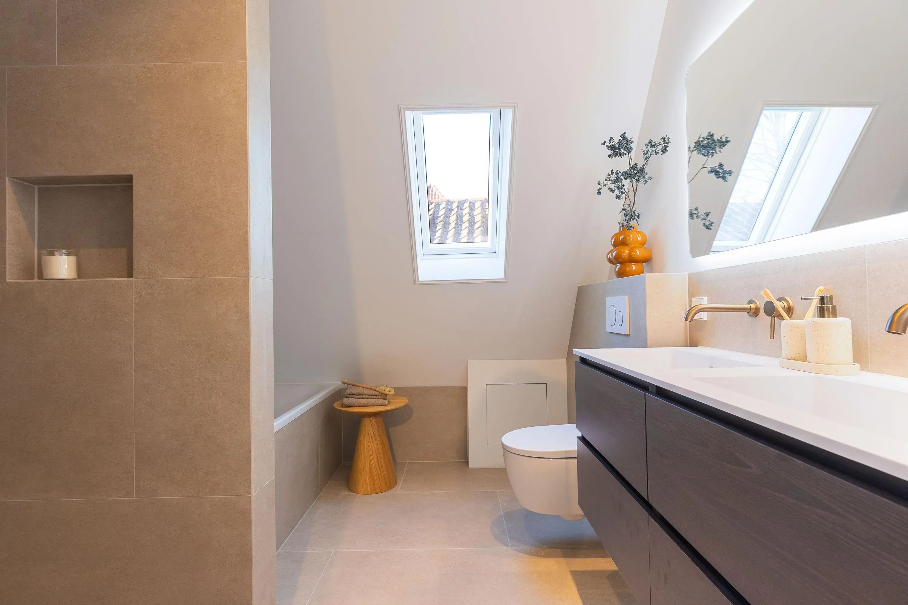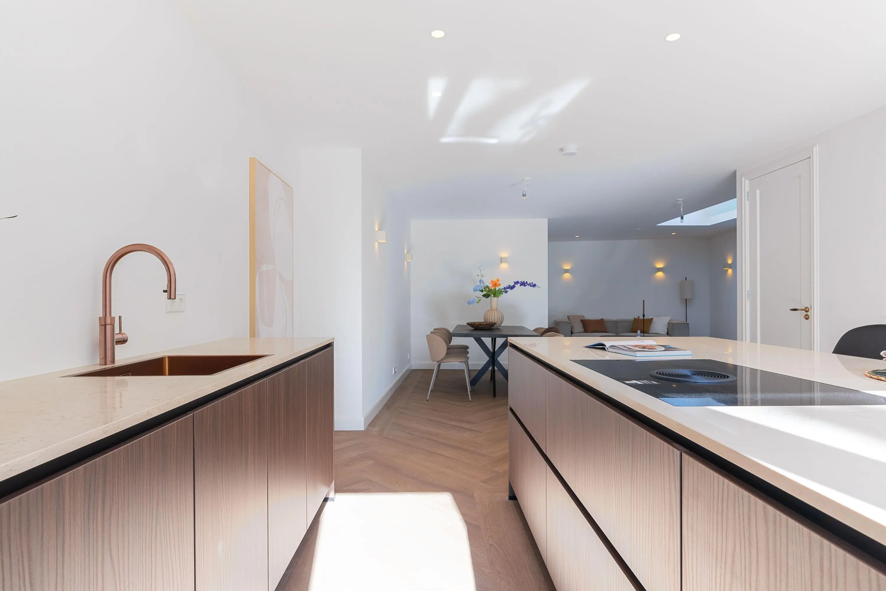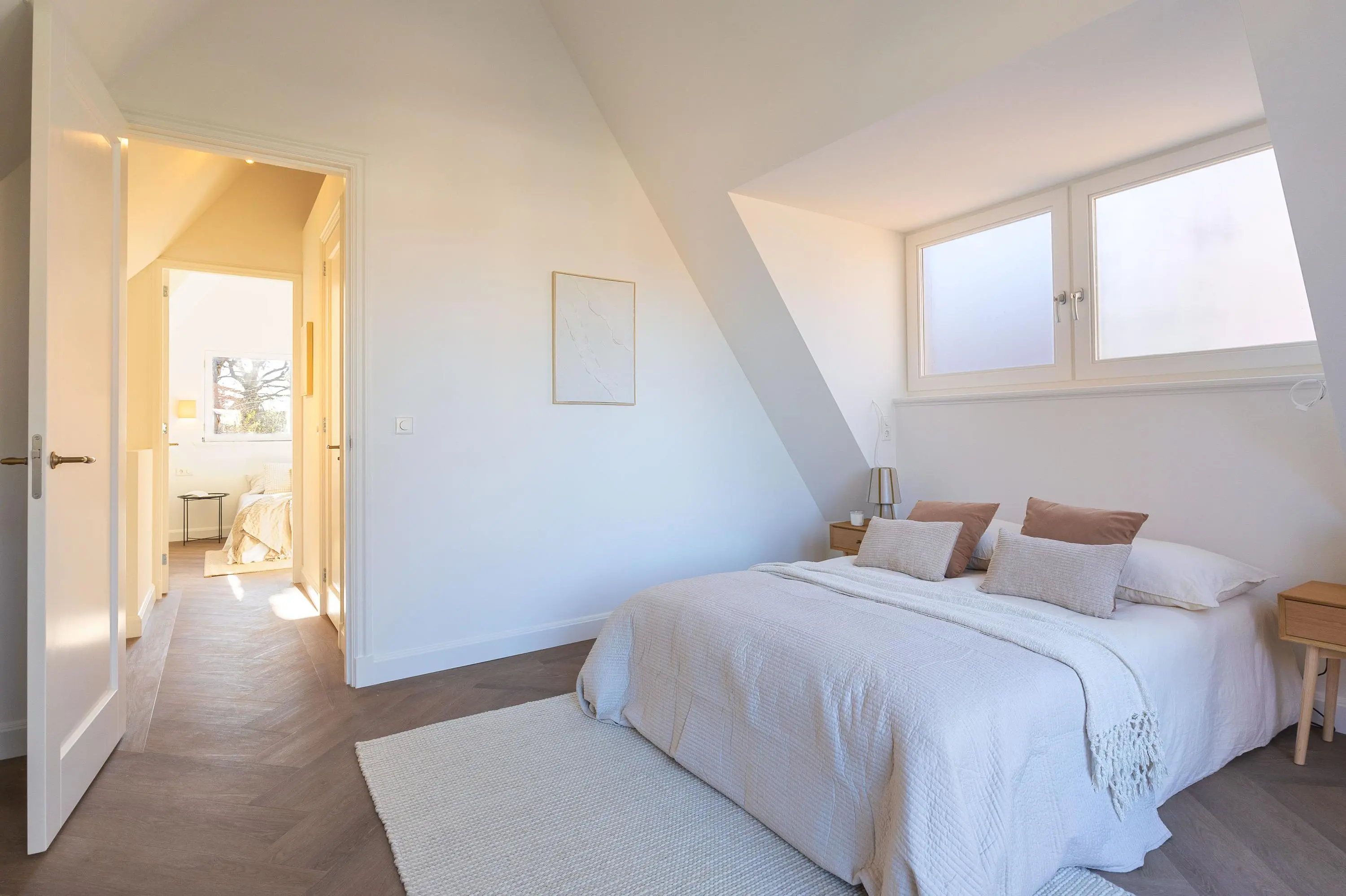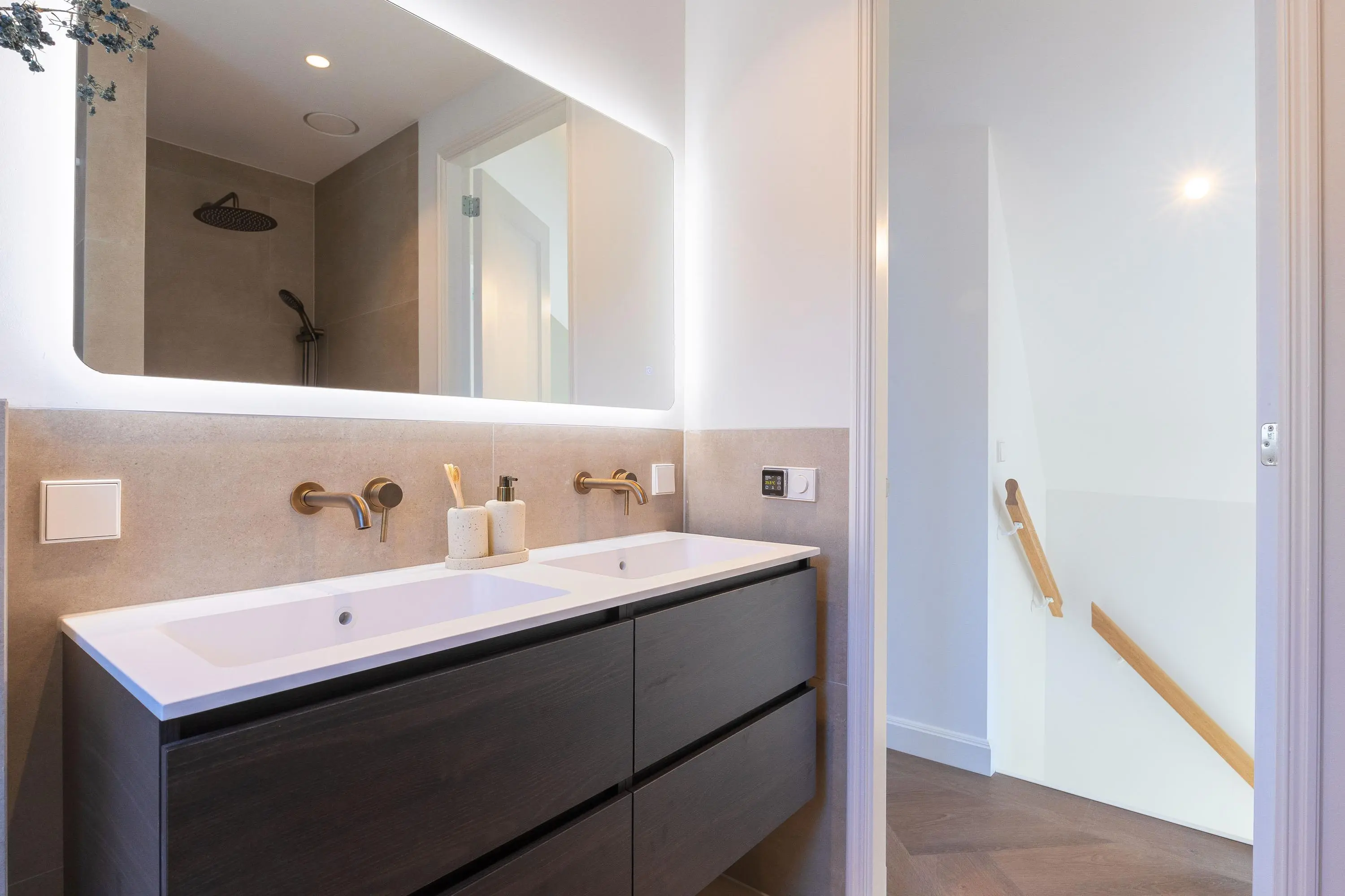 1e verdieping: overloop, 2-tal ruime slaapkamers waarvan één is voorzien van openslaande deuren naar het dakterras, een luxe badkamer met inloopdouche, ligbad, toilet en een dubbele wastafel. De 1e verdieping is eveneens voorzien van een visgraad pvc vloer en een vloerverwarming.