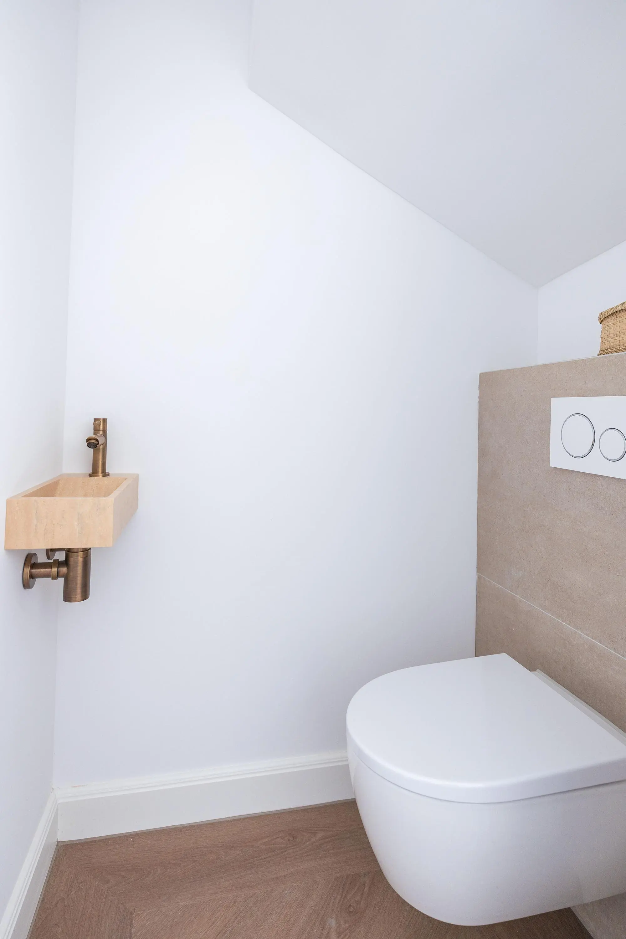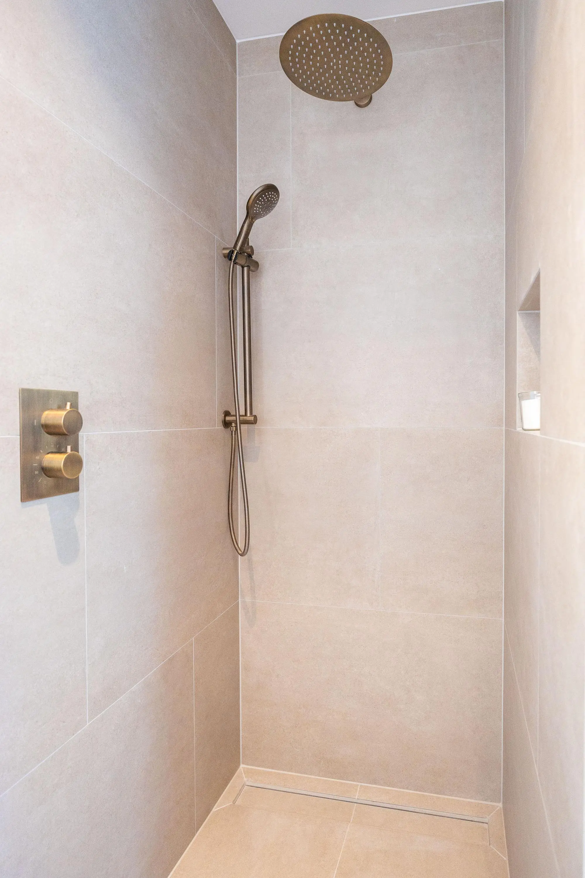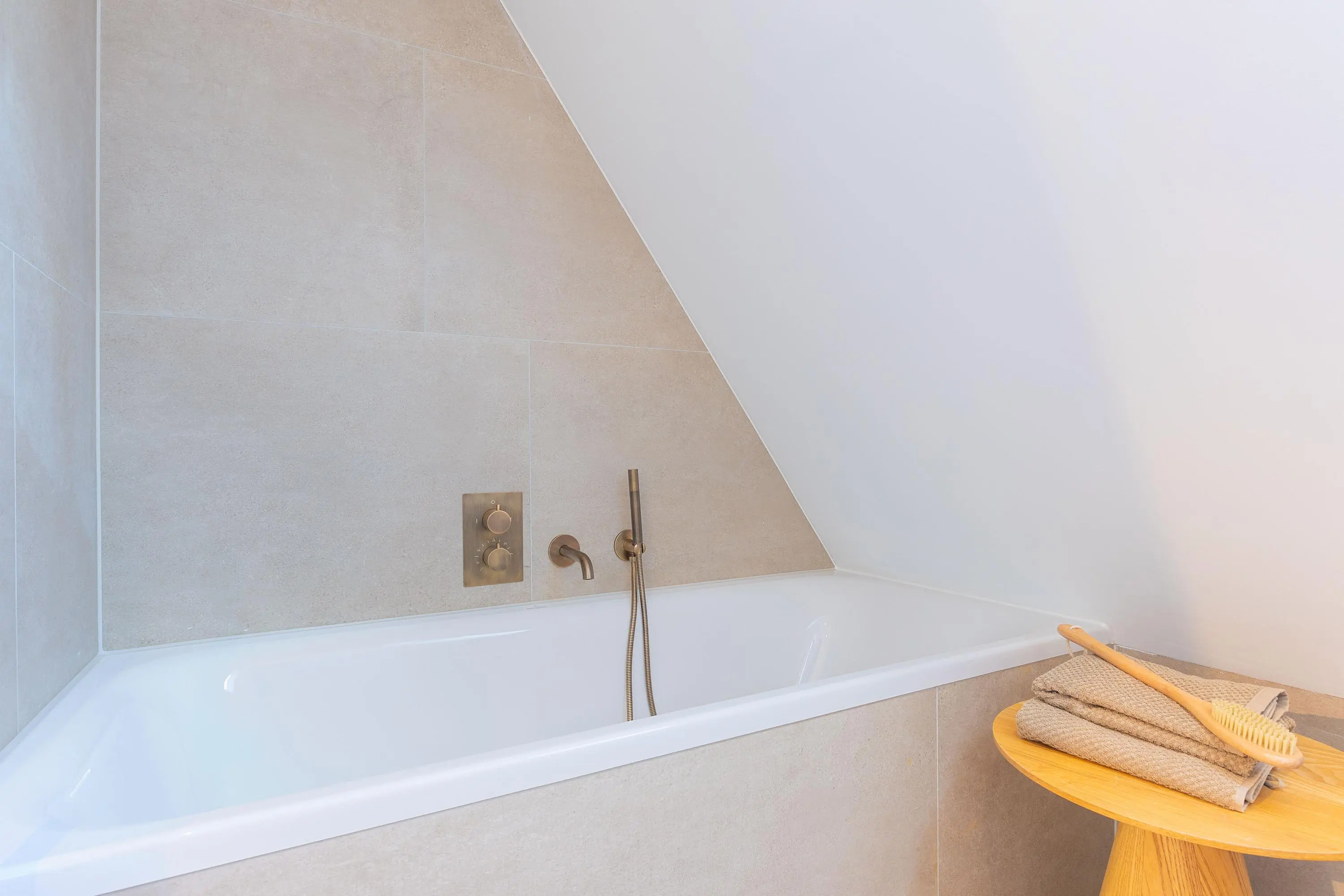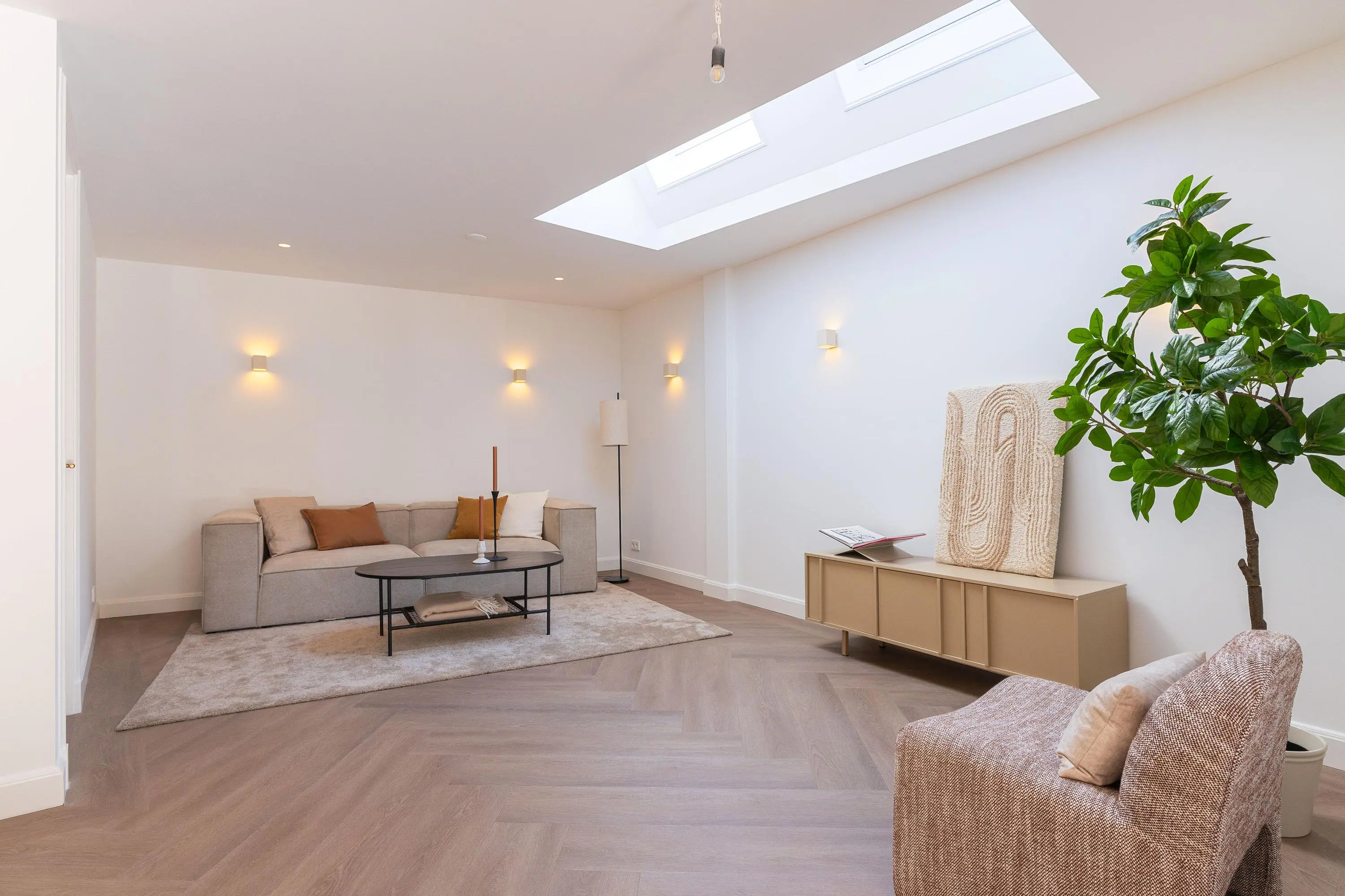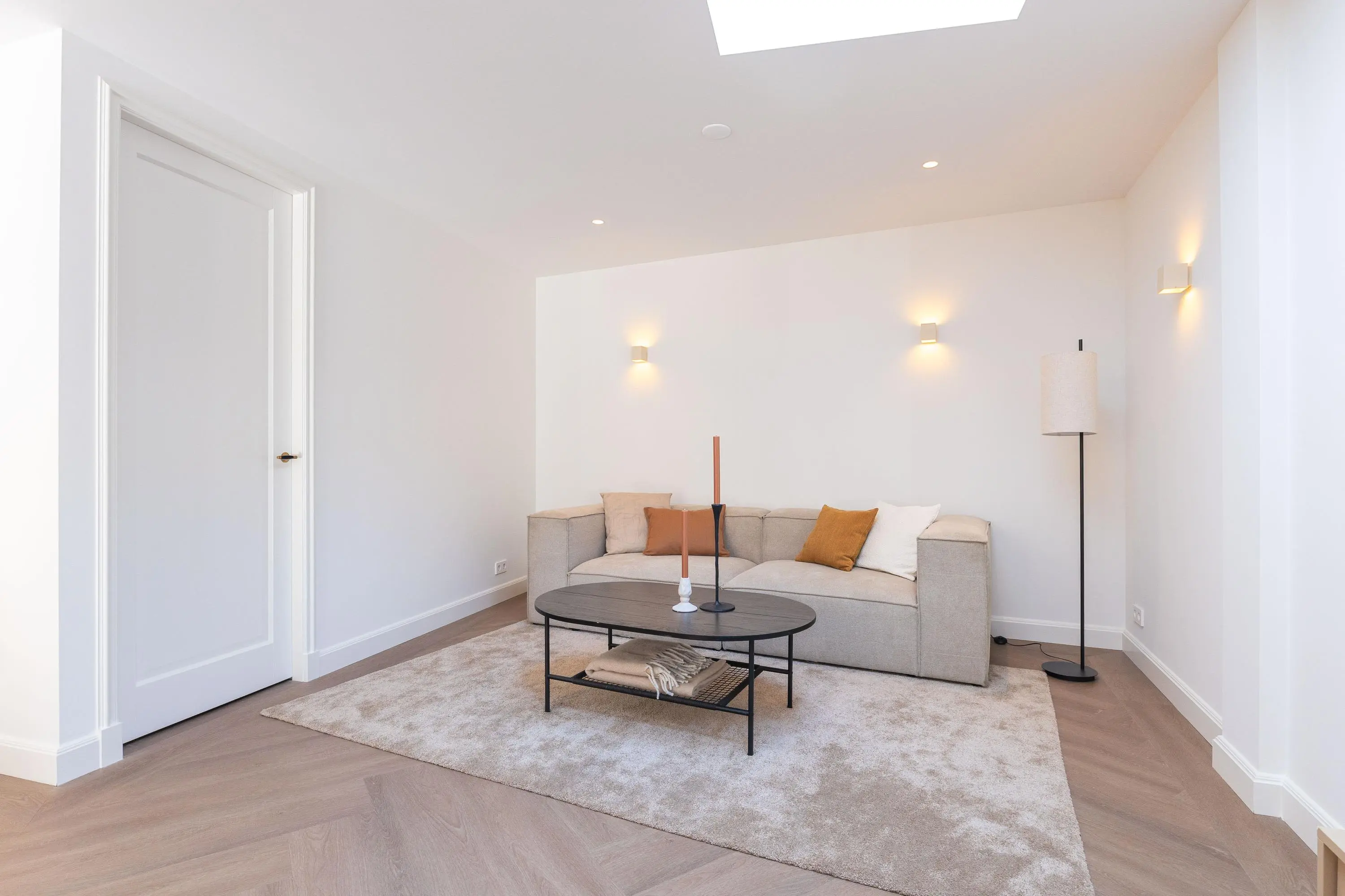 1e verdieping: overloop, 2-tal ruime slaapkamers waarvan één is voorzien van openslaande deuren naar het dakterras, een luxe badkamer met inloopdouche, ligbad, toilet en een dubbele wastafel. De 1e verdieping is eveneens voorzien van een visgraad pvc vloer en een vloerverwarming.