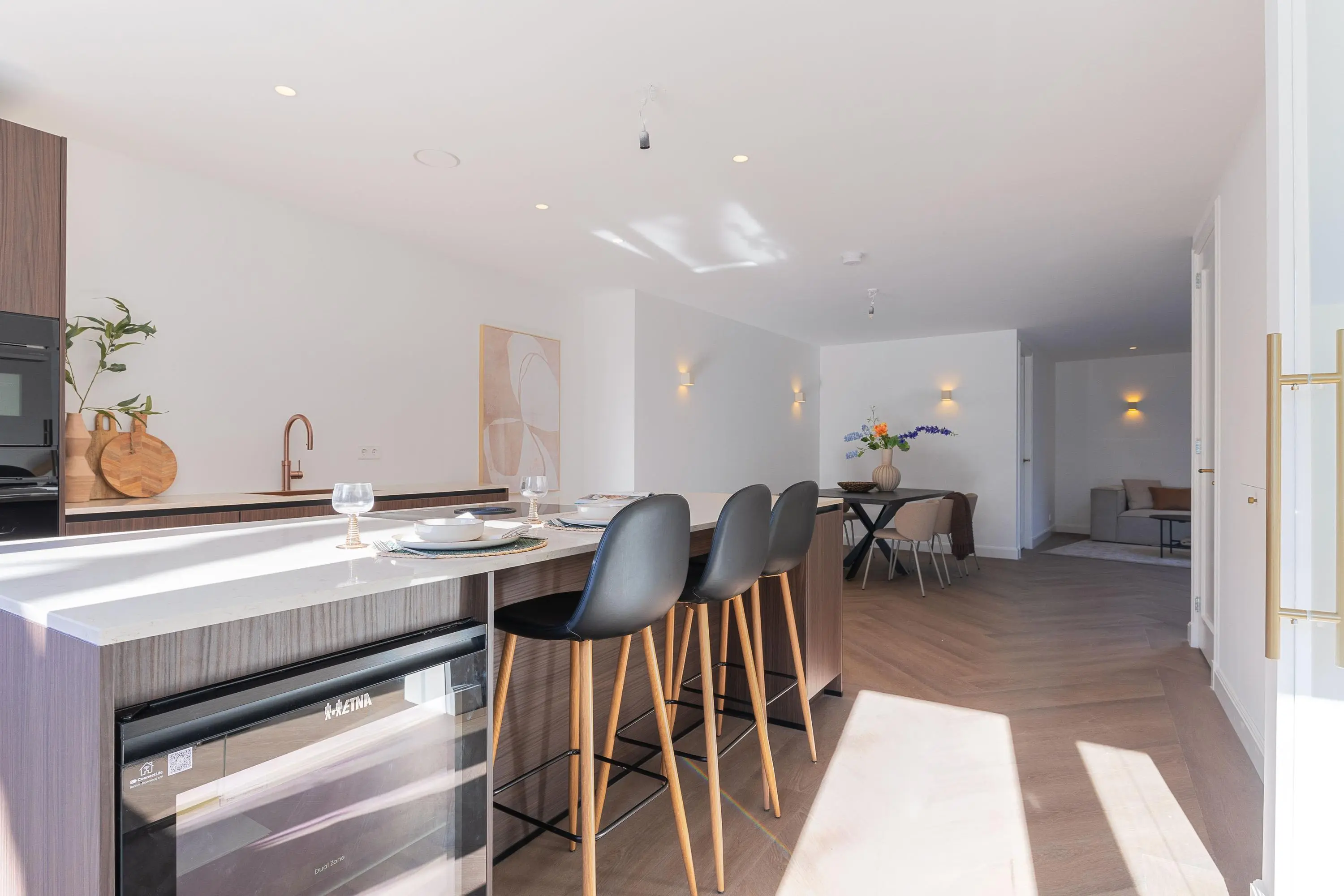 Entree, hal, nieuwe meterkast, trapopgang, open luxe keuken met kookeiland voorzien van koel-/vriescombinatie, Bora inductie kookplaat, combi-oven, oven, Quooker, wijnklimaatkast en een vaatwasser, luxe toilet voorzien van een hangcloset en fonteintje, lichte woonkamer met lichtstraat, ruime bergkast met opstelling CV. ketel (Nefit, 2025) en de wasmachine aansluiting. De begane grond is voorzien van een visgraad pvc vloer en een vloerverwarming.