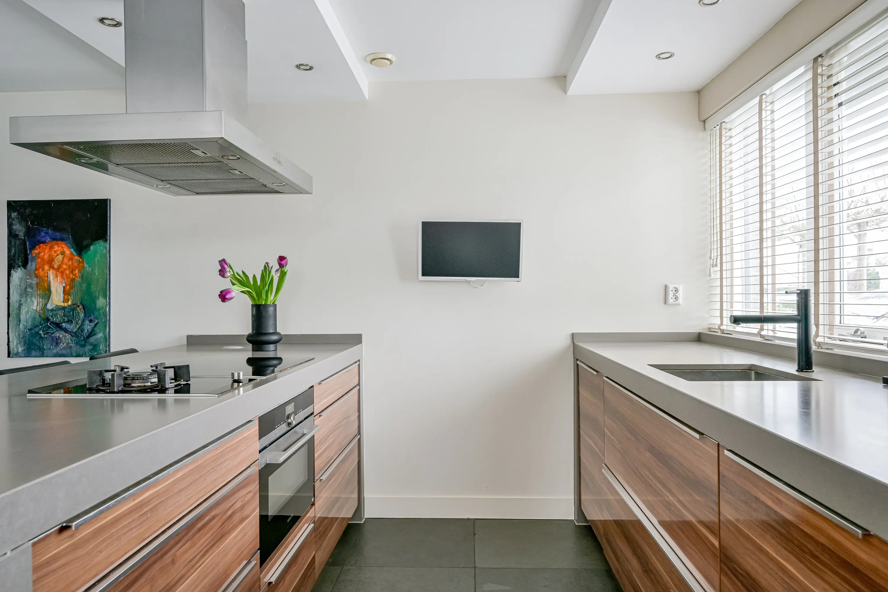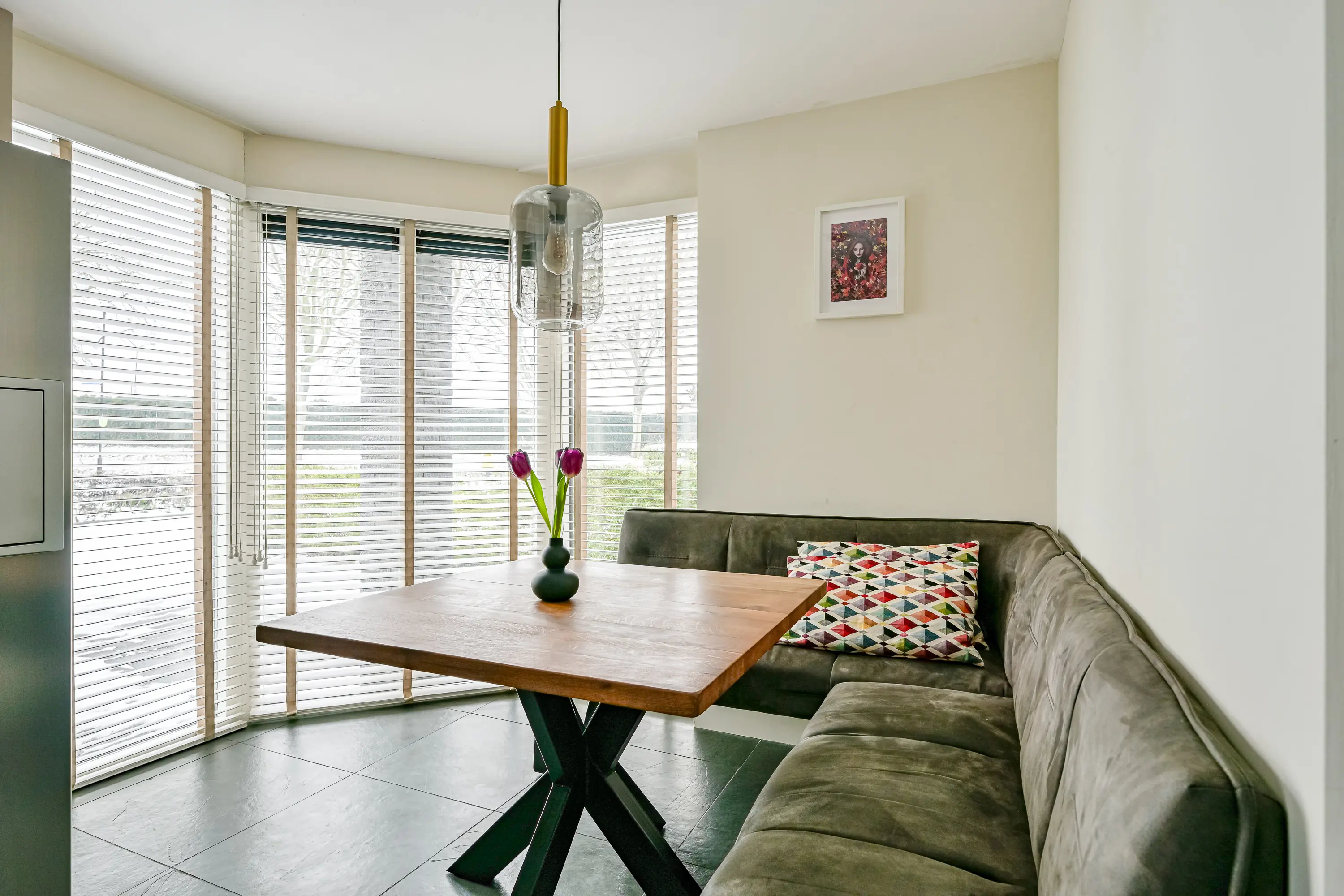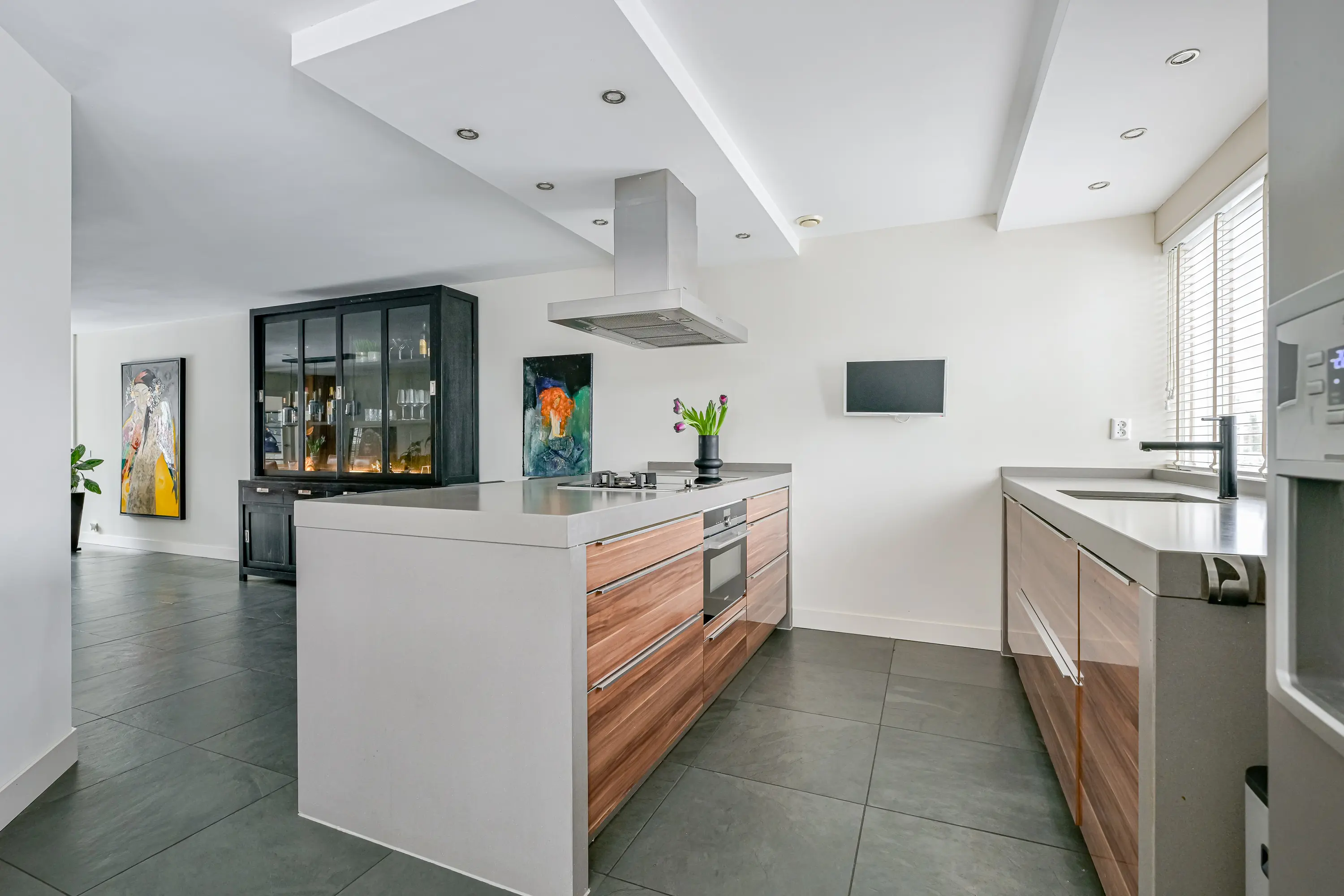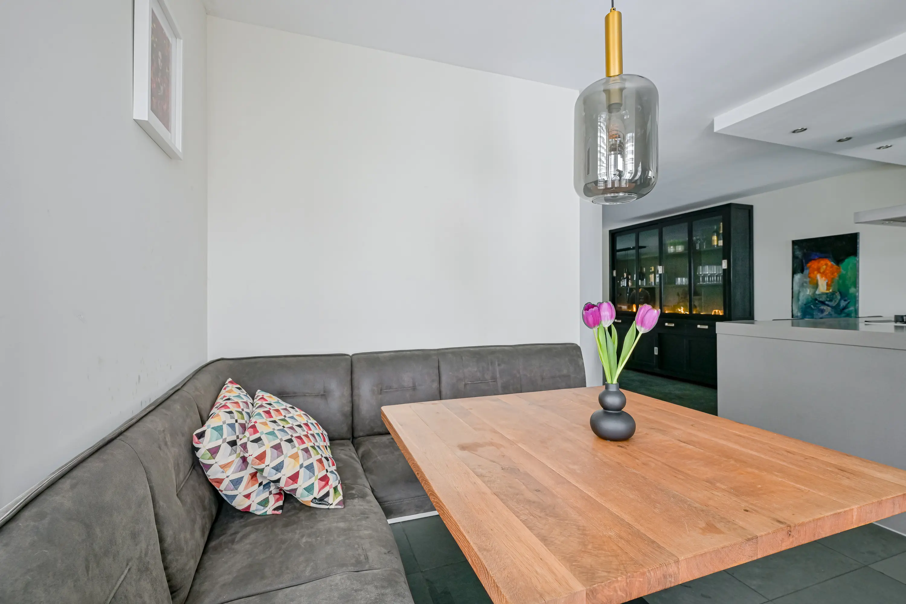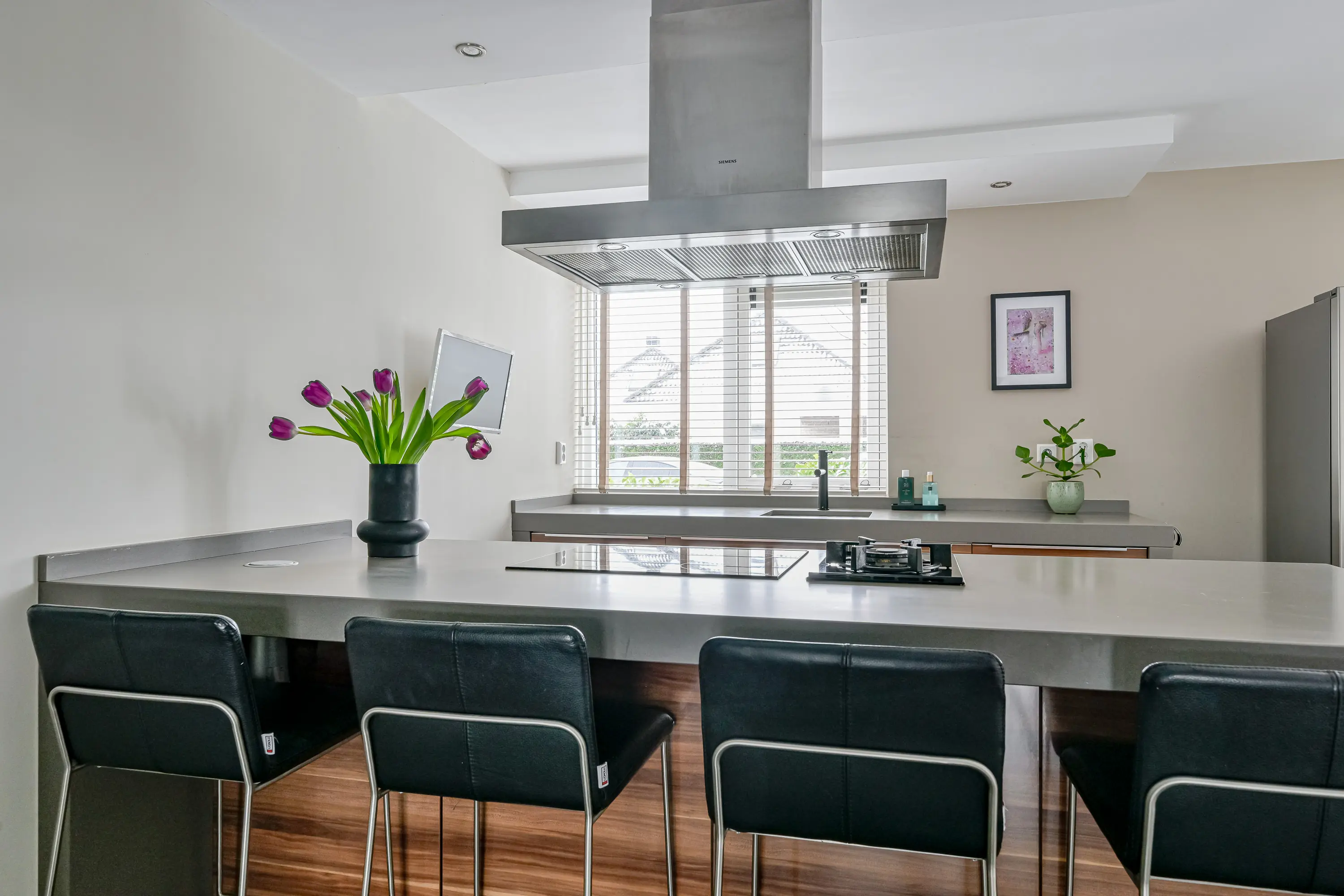 Via de ruime hal komt u in de woonkamer. Aan de voorzijde van de woning bevindt zich de ruime open keuken. De open keuken is voorzien van een inductie kookplaat met tevens een gaspit, een combimagnetron, koel-vriescombinatie, afzuigkap en een vaatwasser. De zithoek in de keuken is een heerlijke plek om in de ochtend een kop koffie te drinken of om aan het einde van de dag de dag door te nemen. Deze zithoek is ruim van opzet. Hier kunt u dus ook met het gehele gezin aan tafel voor een maaltijd. Gewoon een lekker plekje dus!