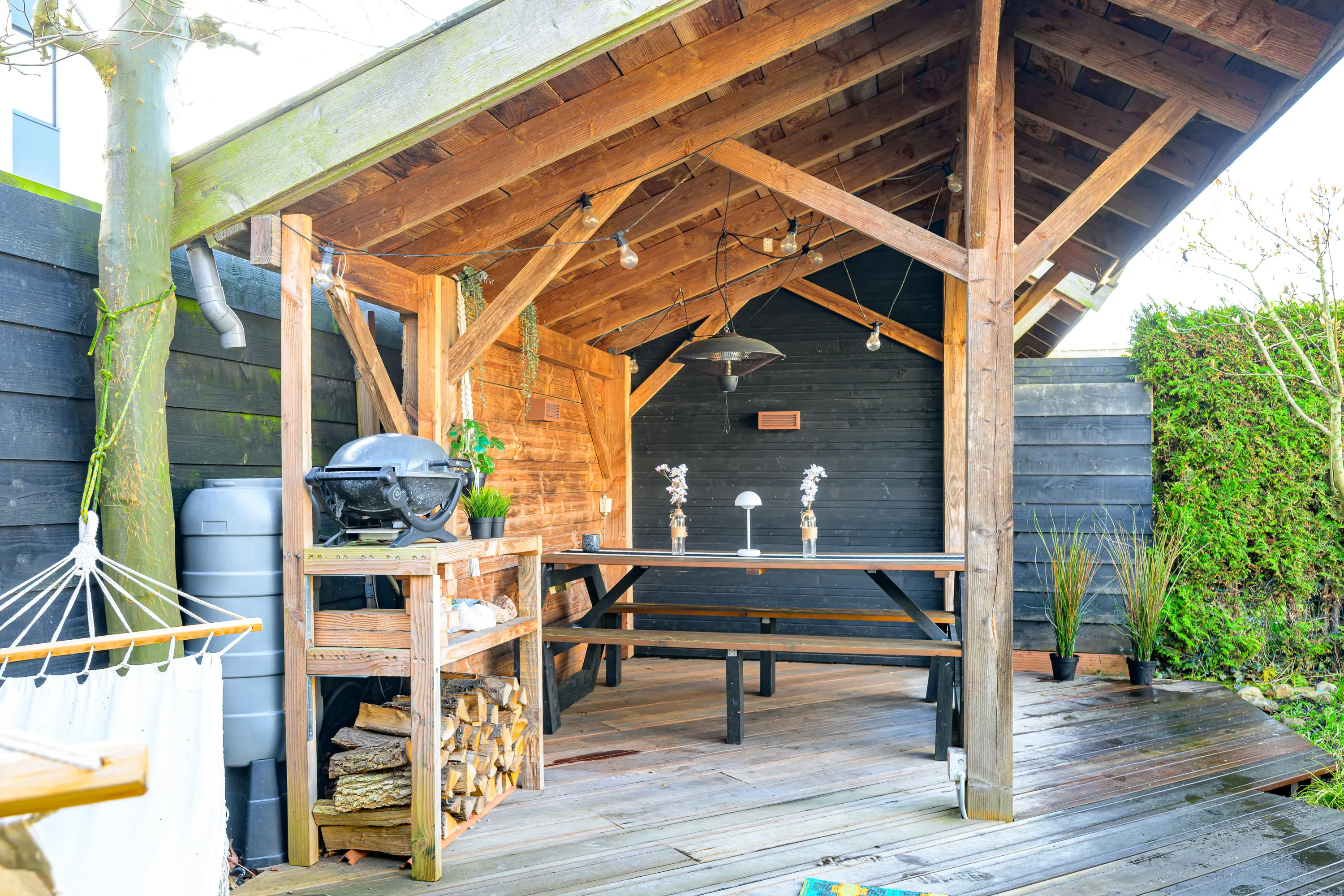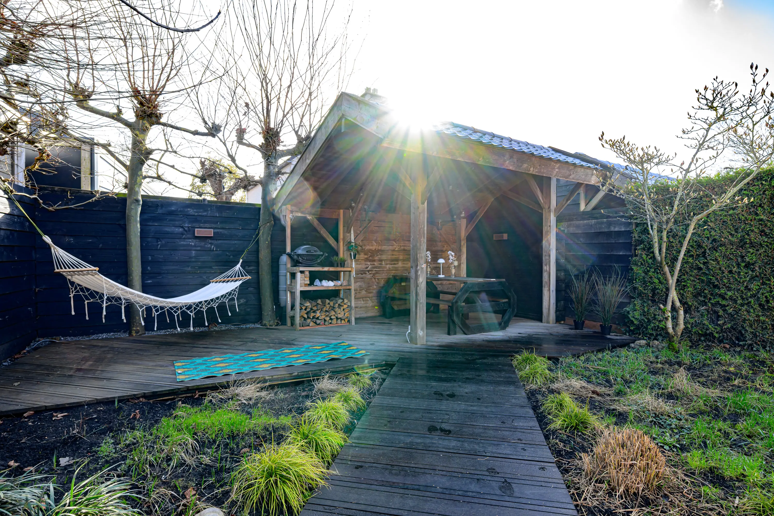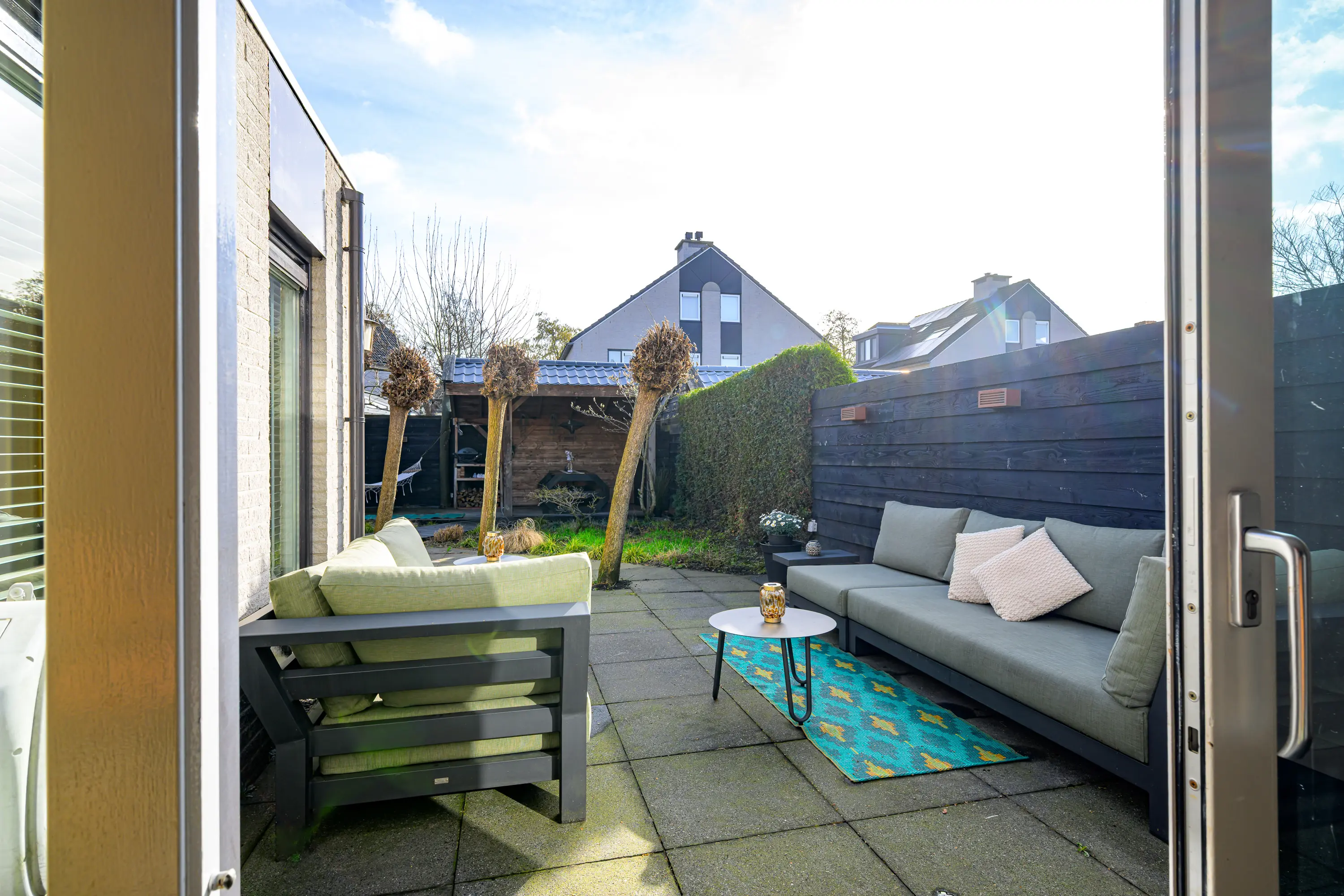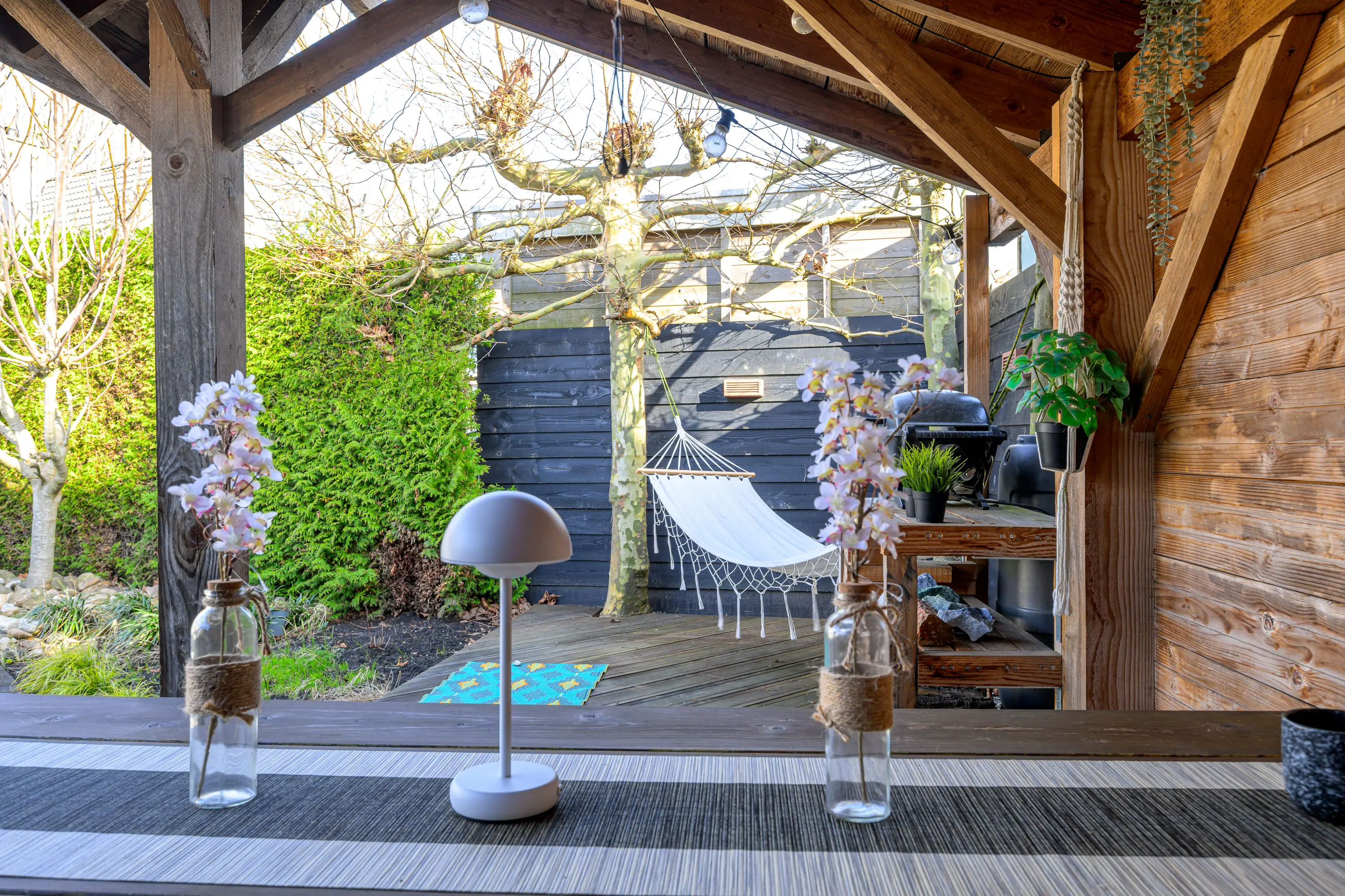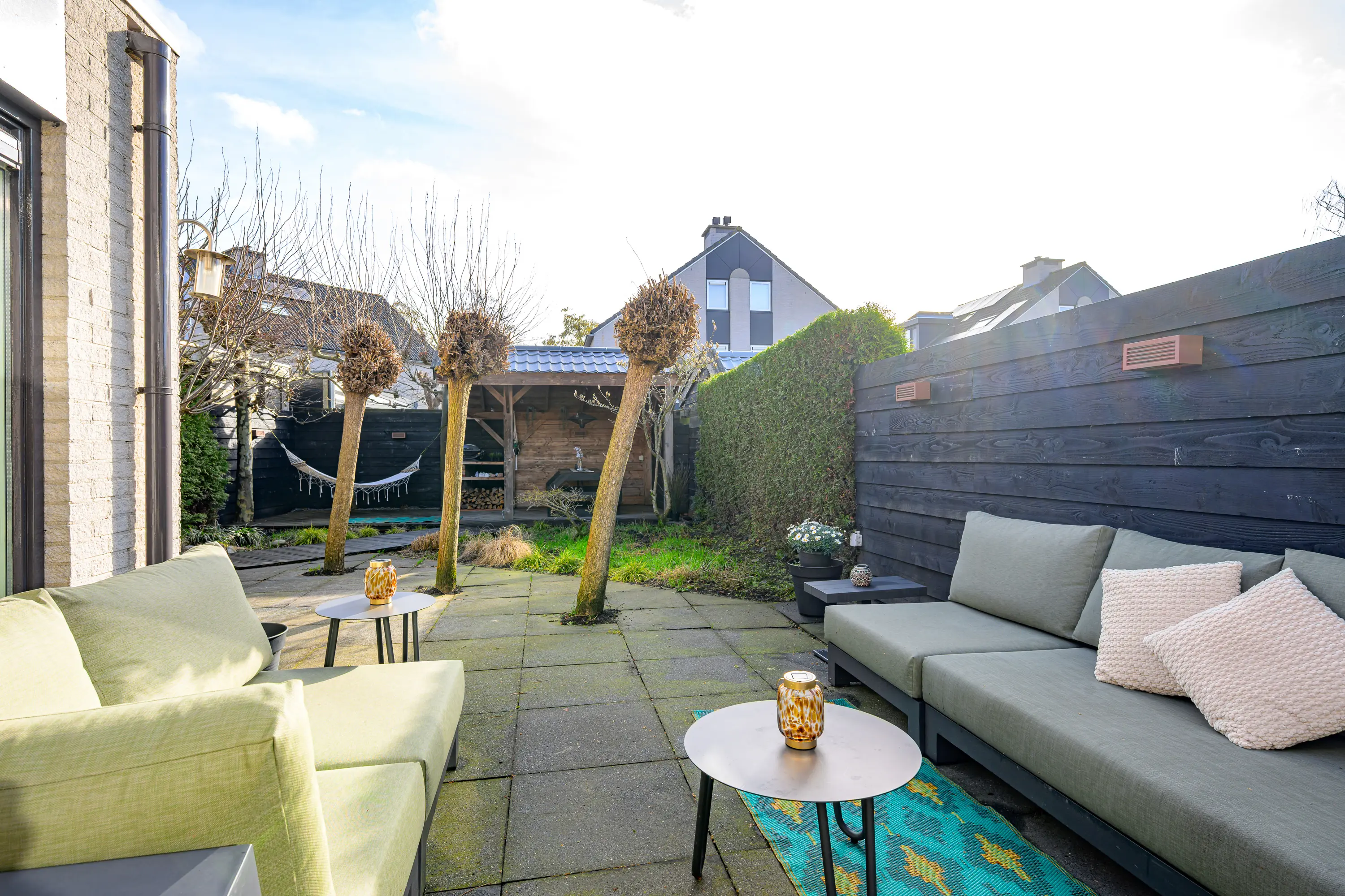 In de keurig aangelegde voortuin kunt u uw auto ruim parkeren op eigen terrein, waarbij ook de mogelijkheid aanwezig is voor elektrisch opladen. De achtertuin is fraai ontworpen en voorzien van diverse zitjes en een gezellige veranda.