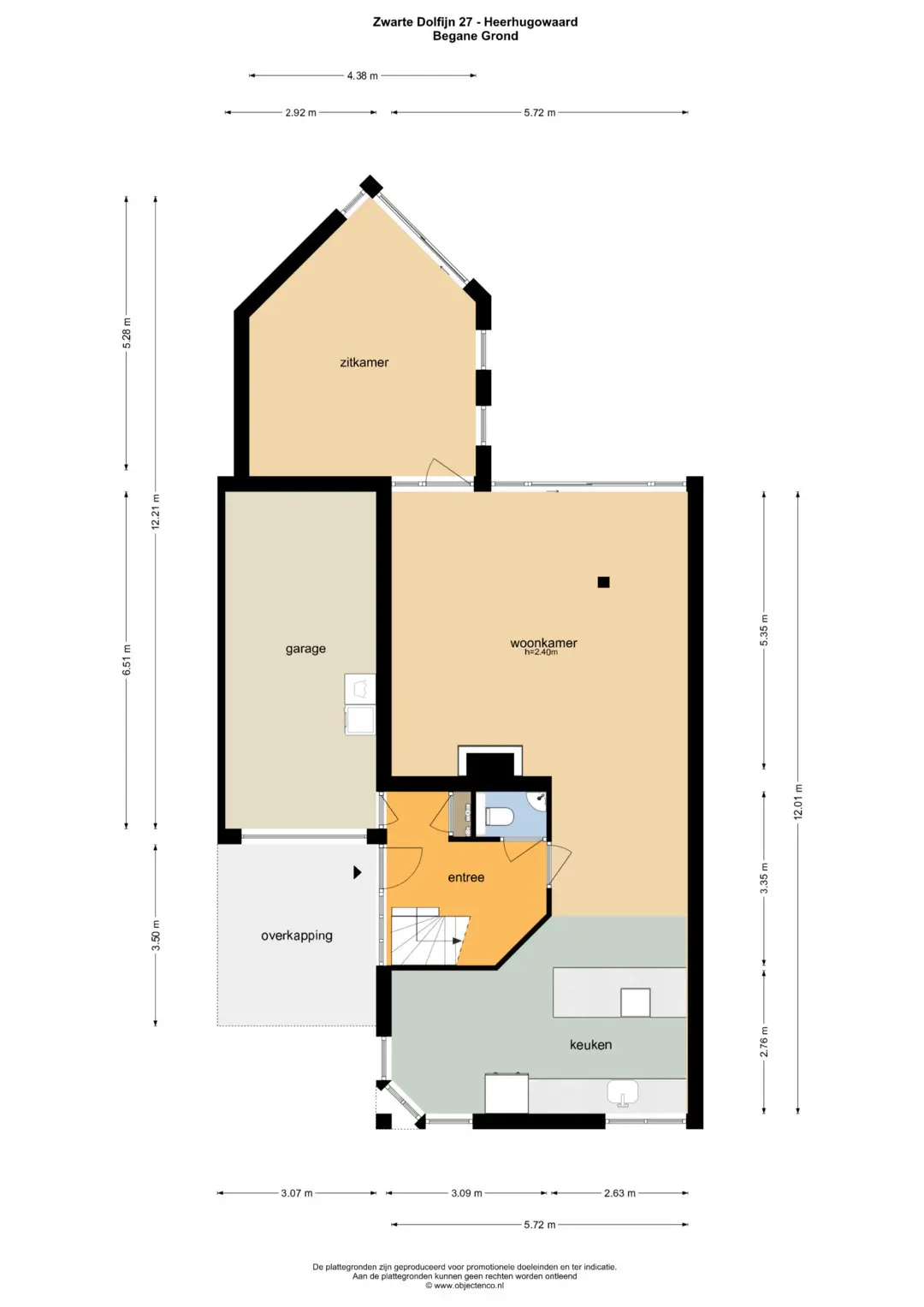 Begane grond: entree, hal, meterkast, toilet, trap naar eerste verdieping, deur naar de woonkamer en deur naar de garage.